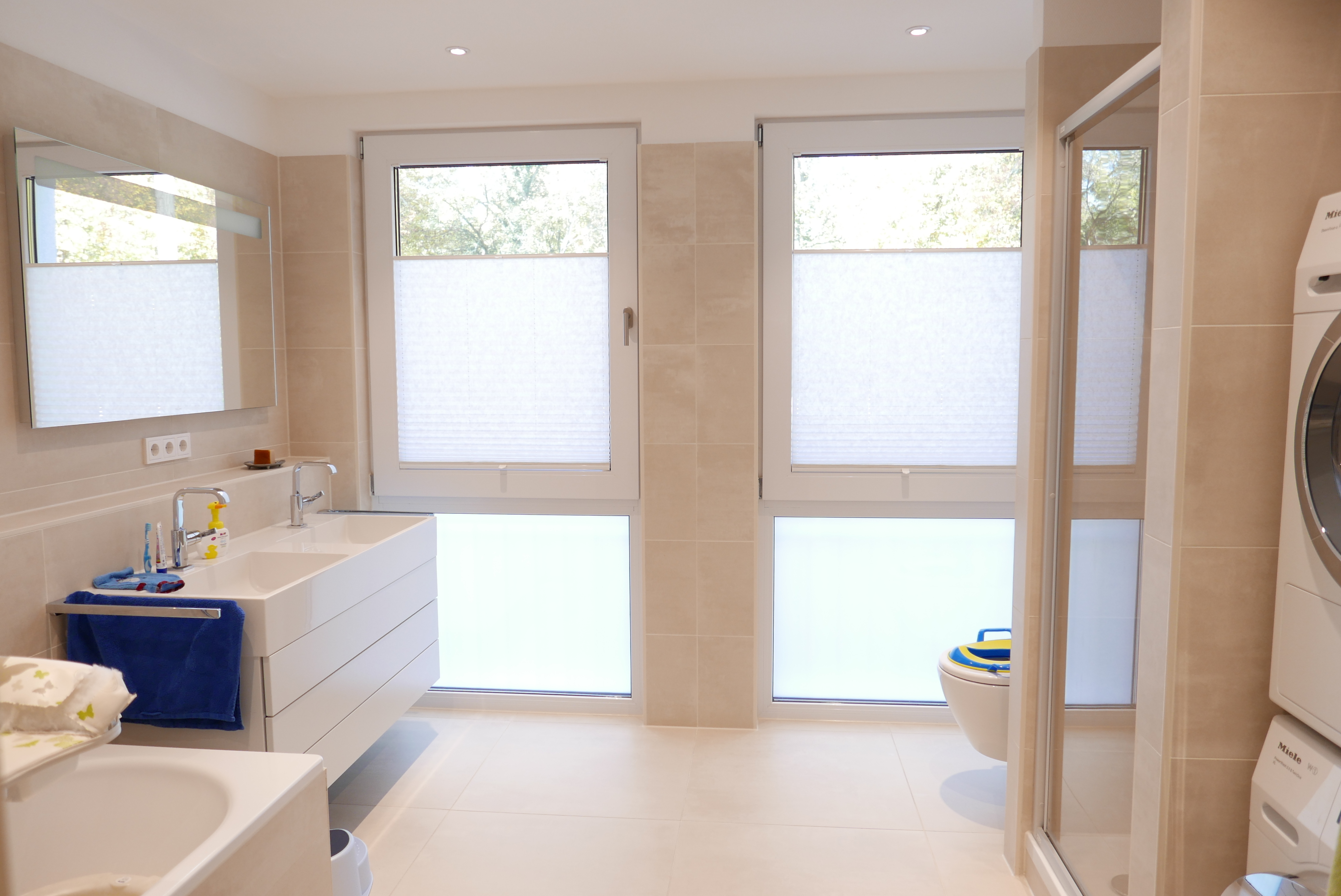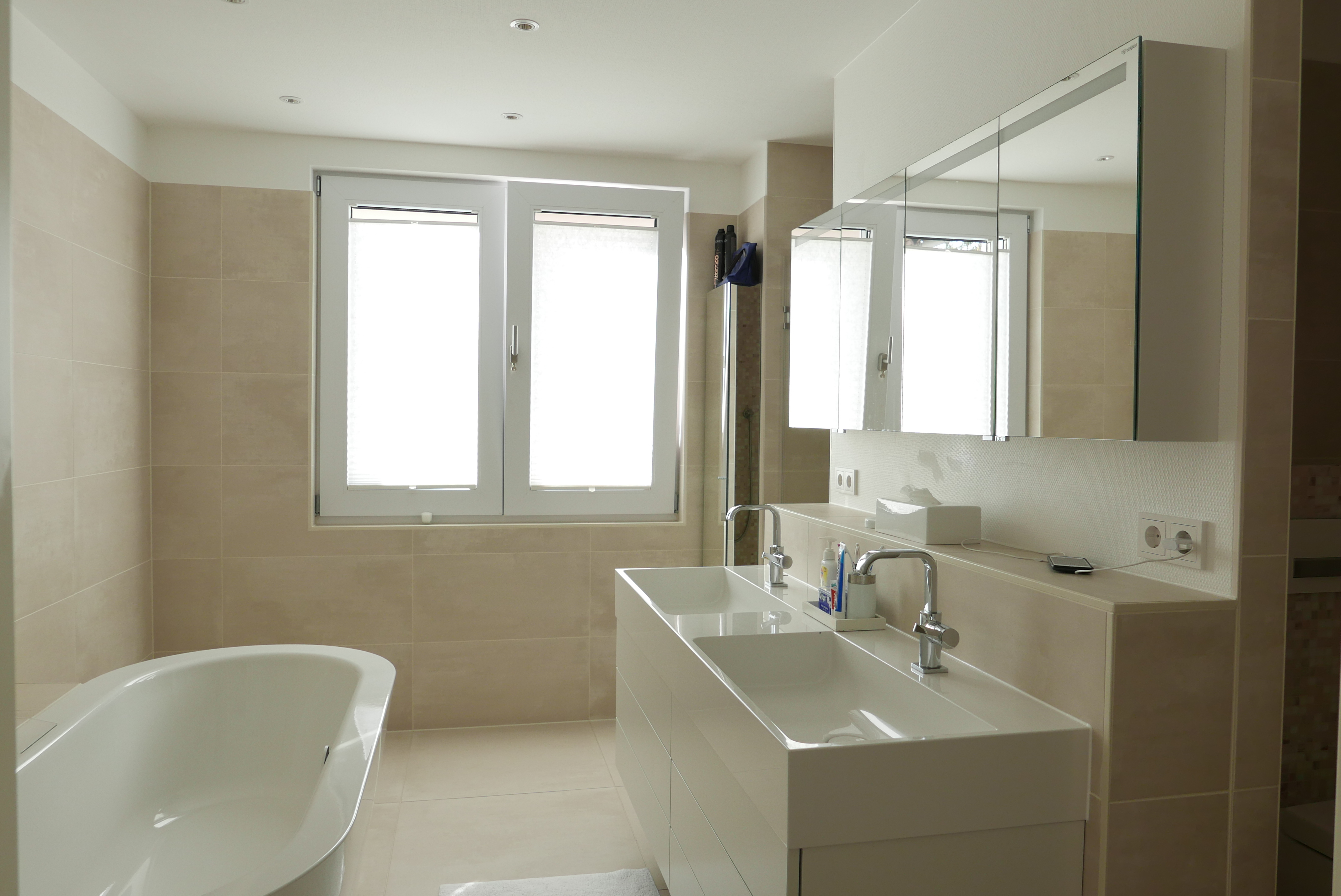 – 2 Tageslicht-Bäder mit Dusche, Badewanne, eingebautem Badmobiliar und Downlights