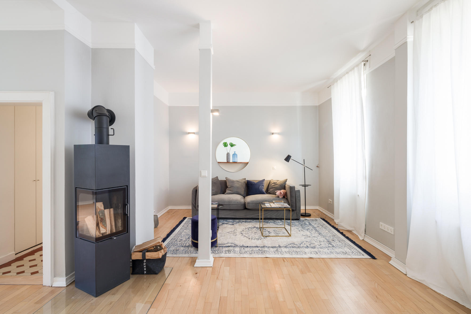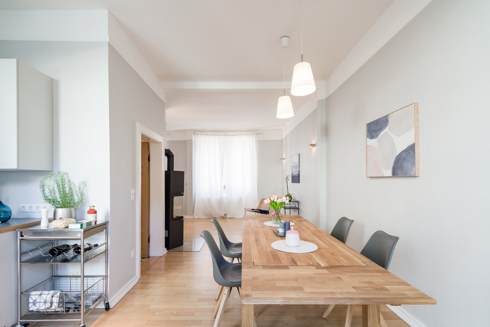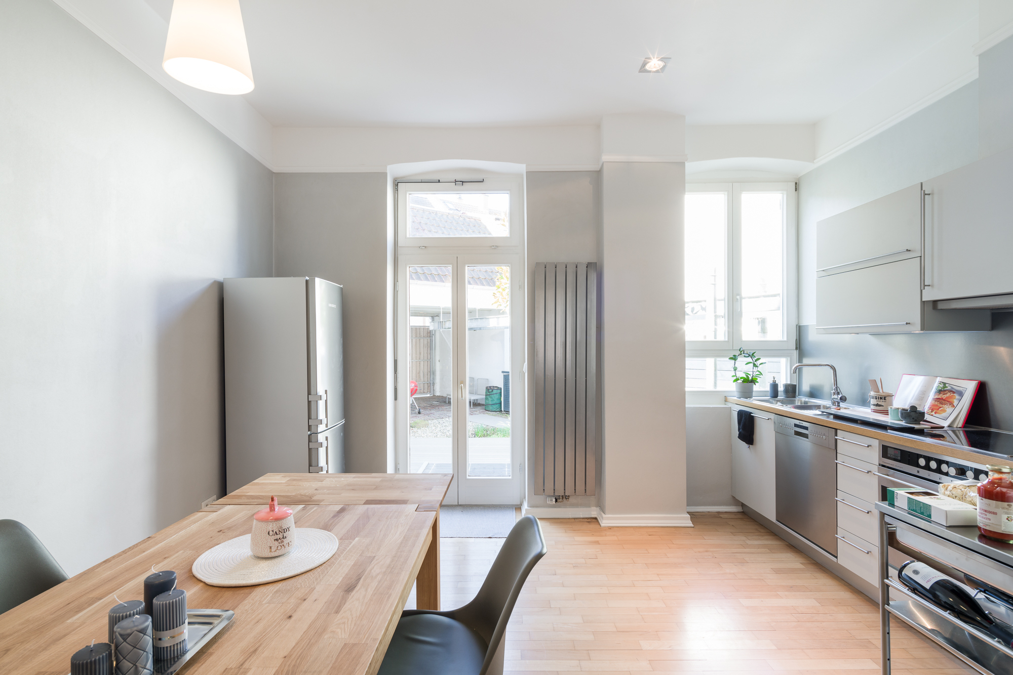 – Bodenbeläge: Echtholz-Parkett Eiche, Terrazzo und Fliesen