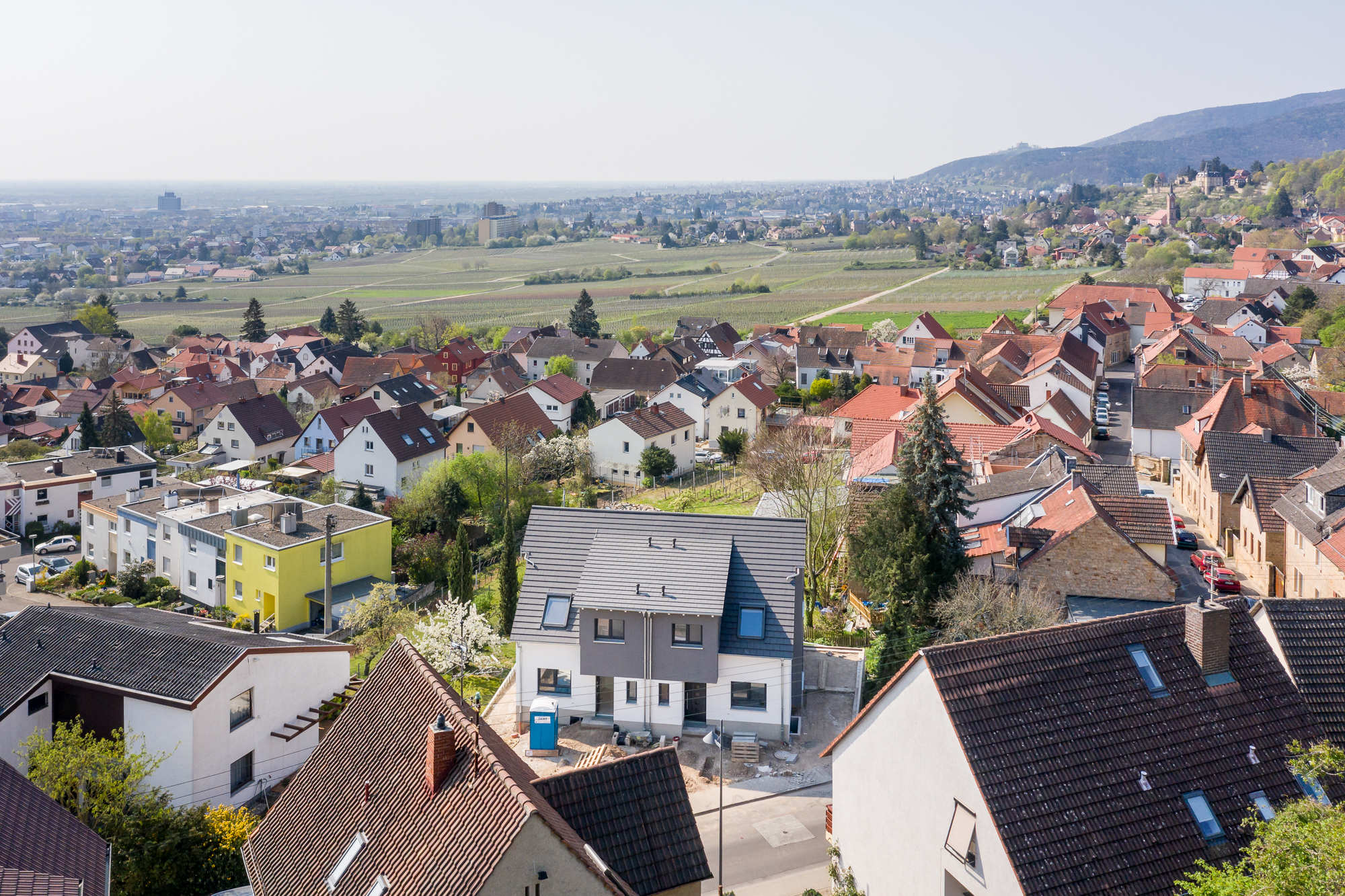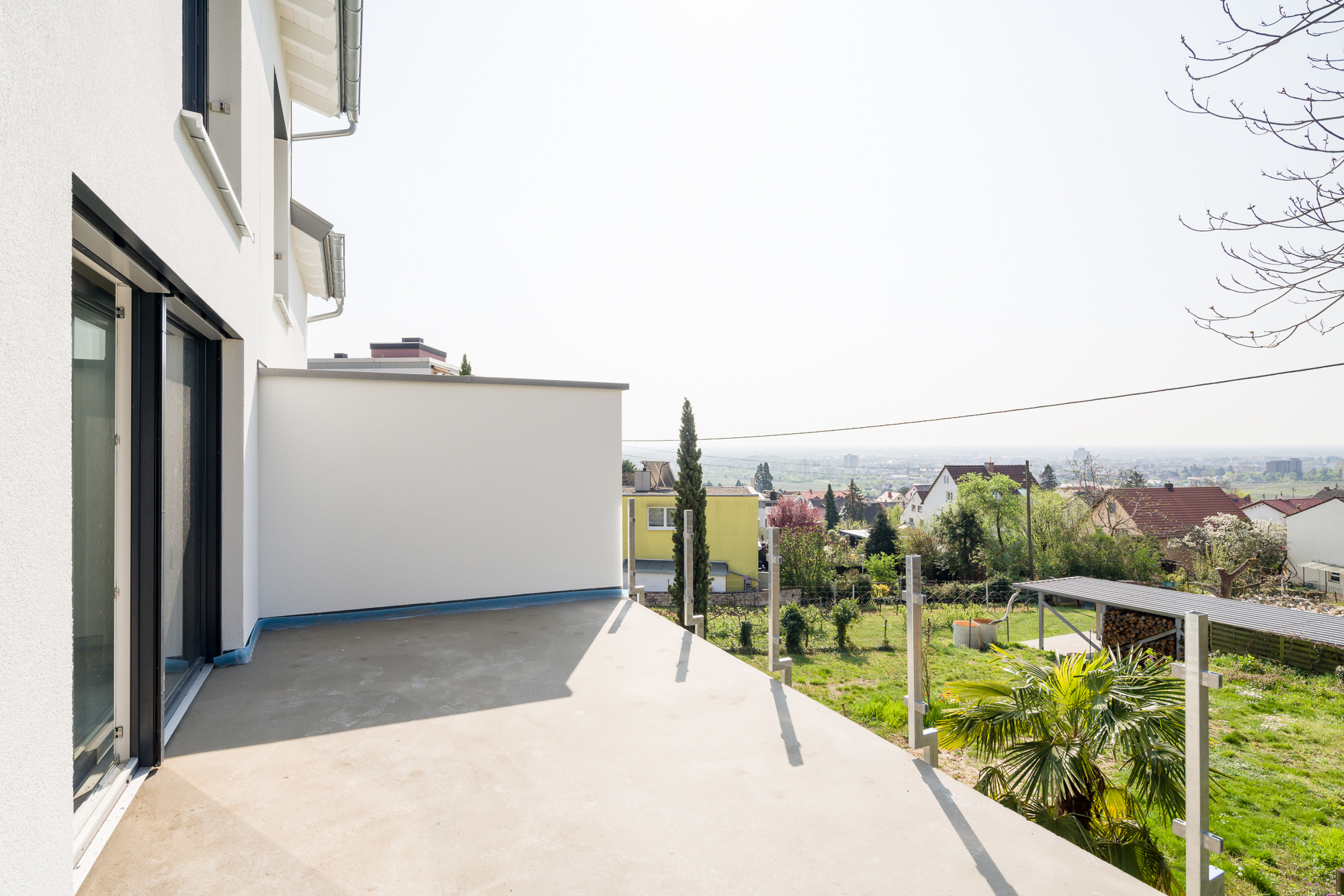 Überwiegend bodentiefe und breite Fensterfronten in 3-fach Iso-Verglasung sorgen auf allen Ebenen für helle und freundliche Räume. Eine besonders energieeffiziente Luft-Wasser-Wärmepumpe versorgt die Fußbodenheizung auf allen Geschossen im ganzen Haus. Von dem 18 qm großen Sonnenbalkon und der gleichgroßen Gartenterrasse genießen Sie ebenso wie vom Masterschlafraum eine unverbaubare Aussicht in die Rheinebene und auf das Hambacher Schloss. Ein besonderes Wohnambiente versprüht das Dachgeschoss mit 3 Schlafzimmern und Tageslichtbad, das mit seiner firsthohen offenen Deckenlage ein loftartiges Raumgefühl vermittelt. Auf Wunsch kann hier noch im Flur eine Zwischendecke für zusätzlichen Stauraum eingezogen werden. Im Gartengeschoss offenbart dieses geräumige Haus mit 3 weiteren Räumen und einem optionalen zusätzlichen Duschbad die Möglichkeit, einen eigenständigen Wohn-, Gäste- oder Arbeitsbereich zu schaffen.