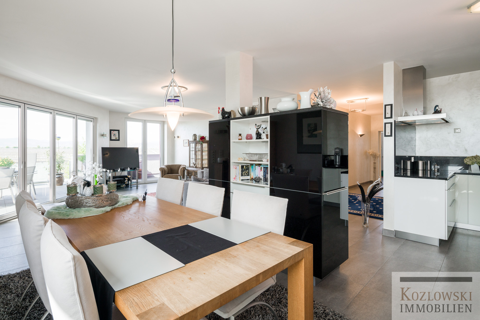 Hinter der massiven Wohnungseingangstür im 2. Obergeschoss empfängt Sie eine geräumige Diele, die bereits den Charakter dieser außergewöhnlichen Wohnung widerspiegelt. Bodentiefe Fenster und die Aluminium-Falttürelemente zur Dachterrasse lassen viel Licht in alle Räume und öffnen einen ungehinderten Blick auf die große umlaufende Panoramaterrasse und das Haardt-Gebirge. Die moderne Einbauküche mit top Markengeräten geht in den offenen knapp 52 qm großen Ess- und Wohnbereich über.