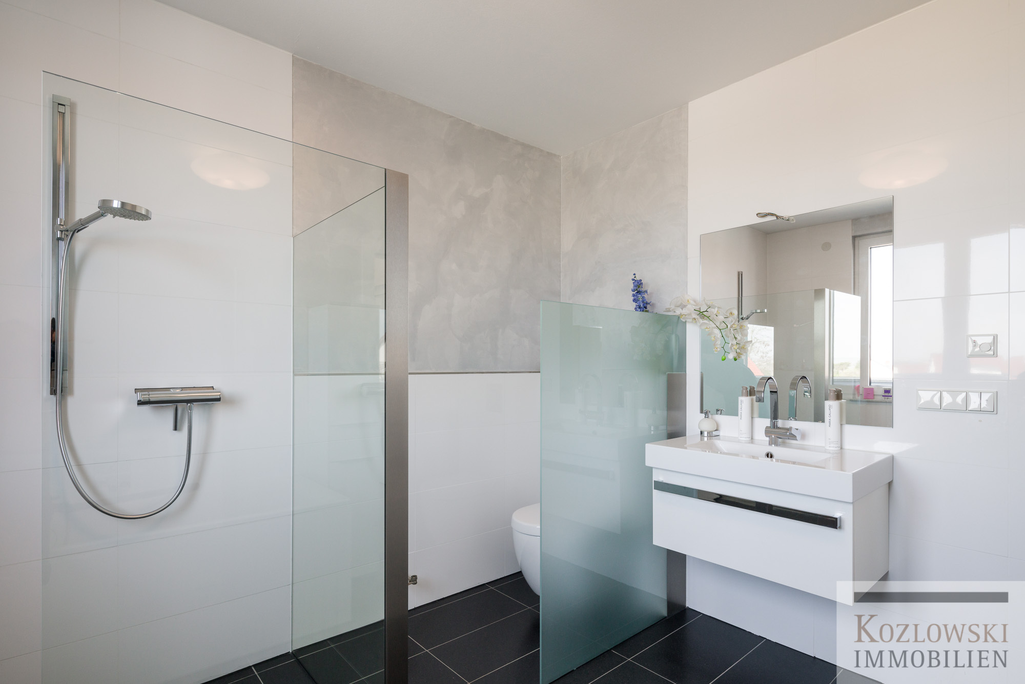 Zum Masterbedroom mit separater Ankleide und dem en-suite Tageslichtbad gelangen Sie auf der Nord-Westseite der Diele durch eine massive hochwertige Schiebetür. Gäste haben ihren separaten Rückzugsraum und können sich ungestört in einem eigenen Duschbad wohlfühlen. Ein geräumiger Kellerraum sowie eine Einzelgarage mit 2 PKW-Stellplätzen daneben (extra EUR 40.000,-) runden dieses besondere Kaufangebot perfekt ab.
