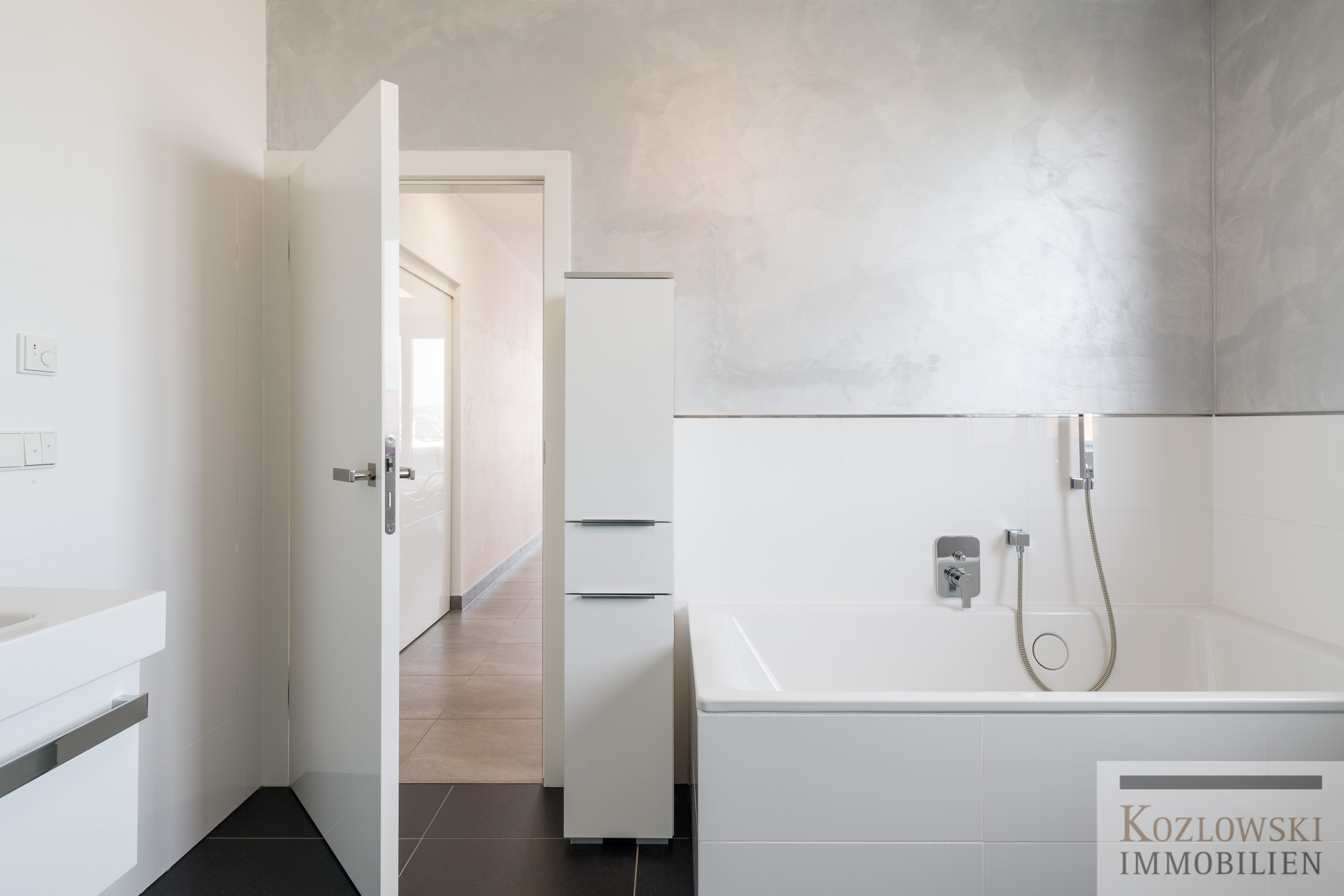 • großformatige Feinsteinzeugfliesen in der Wohnung und auf der Terrasse (30/90 ; 45/90 und 60/120)