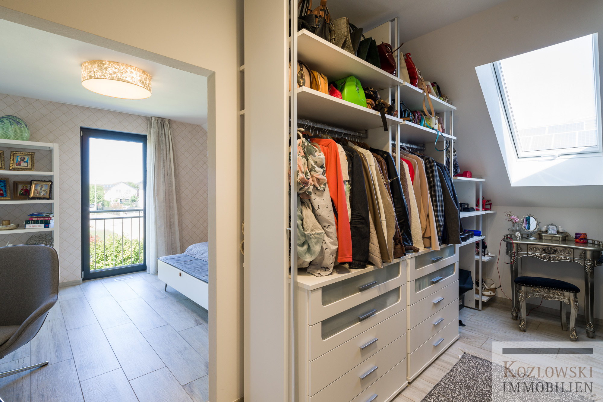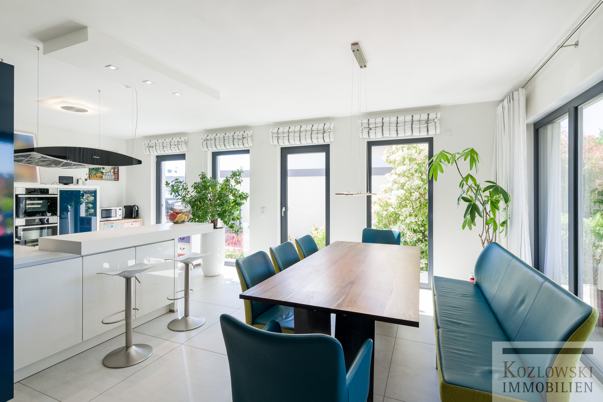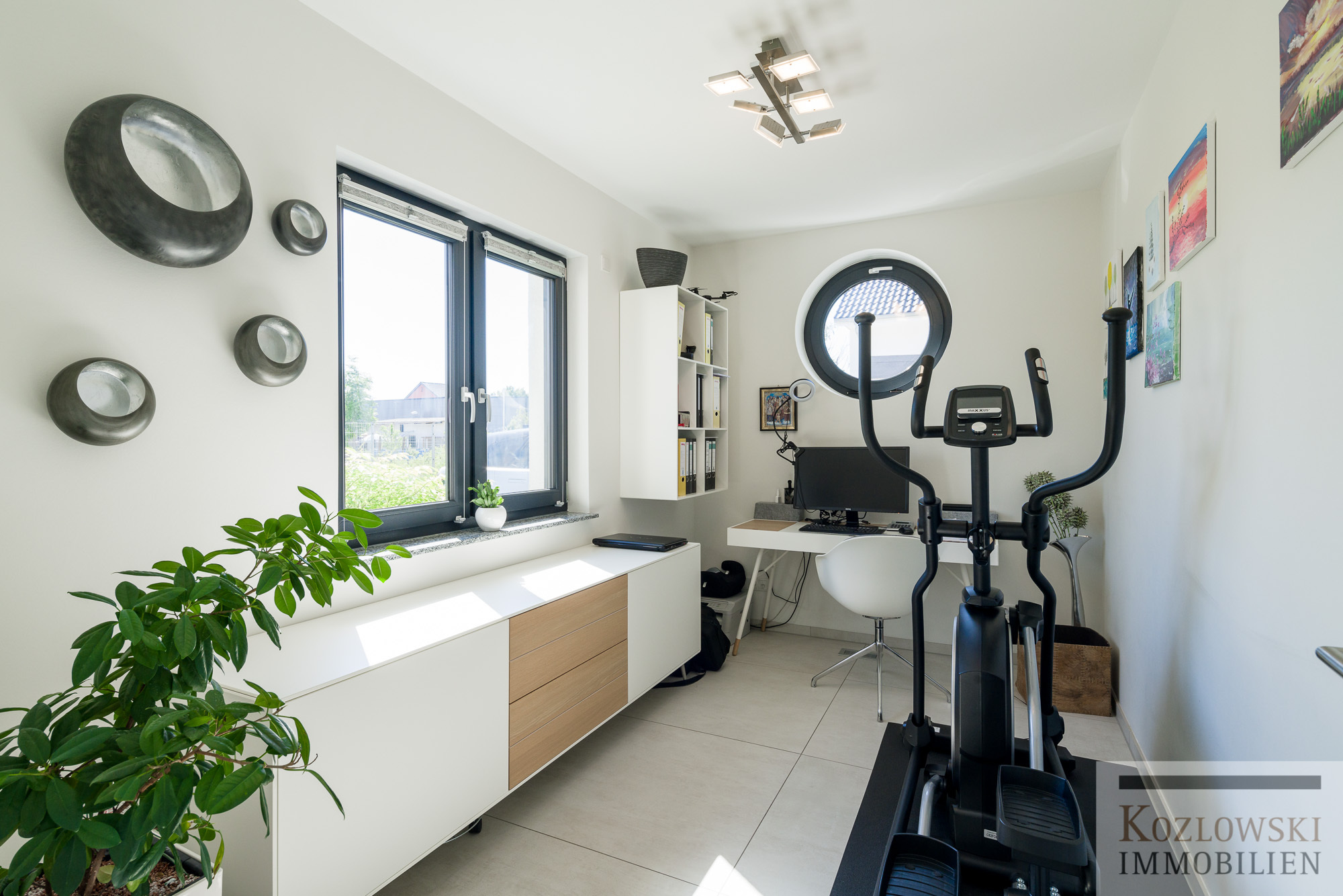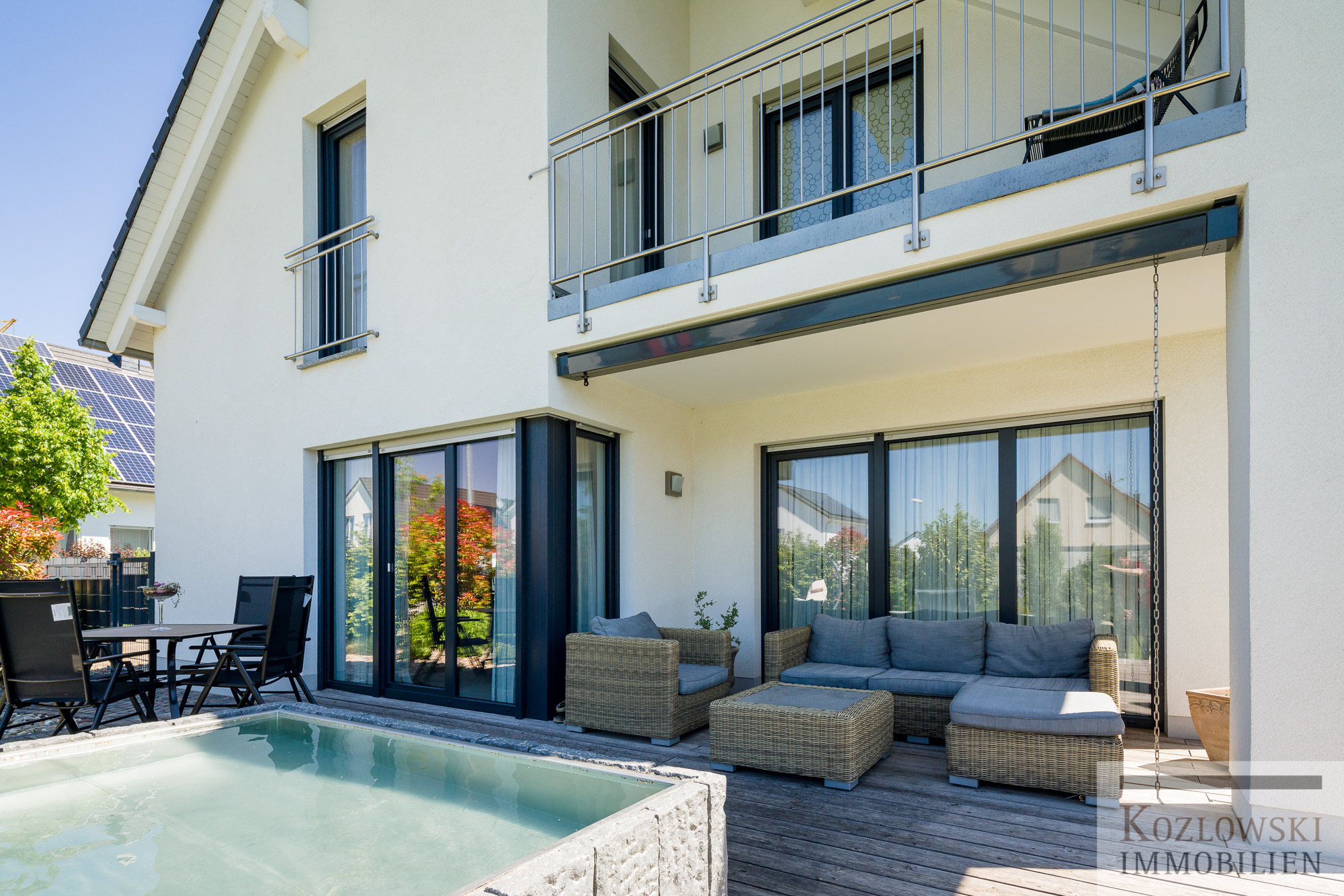 Die ca. 187 qm helle und einladend konzipierte Wohnfläche verteilt sich auf 2 Wohnebenen (EG und DG) mit insgesamt 5,5 Zimmern einem stylischen Master-Badezimmer sowie einem Gäste-Duschbad. Im Erdgeschoss erwartet Sie nach dem Eingangsbereich der offen gestaltete Wohn-Ess- und Küchenbereich mit Glasfront hin zur Gartenterrasse und Blick auf den Springbrunnen und dem Gartenbereich. Des Weiteren finden sich im Erdgeschoss ein Arbeitszimmer, die Garderobe, ein geräumiges Gäste-Duschbad mit WC sowie der Hauswirtschafts- und Technikraum. Über die Holztreppe gelangen Sie in das Dachgeschoss wo Sie der Masterbedroom mit begehbarer Ankleide, einem Design-Bad mit freistehender Badewanne und Dusche, Zugang auf die große West-Loggia und zwei Kinderzimmer erwarten. Der ausgebaute und gedämmte Speicher kann als zusätzlicher Stauraum bzw. als Spielzimmer für Kinder genutzt werden.