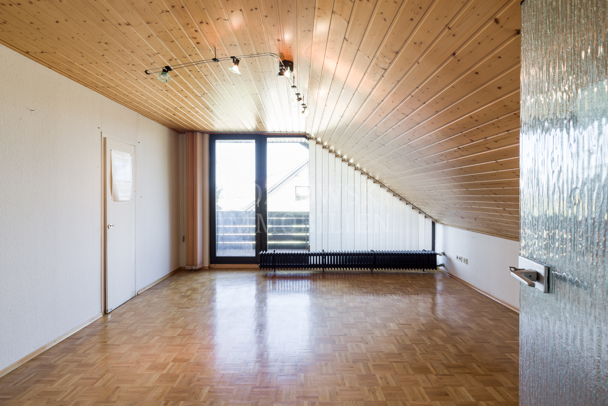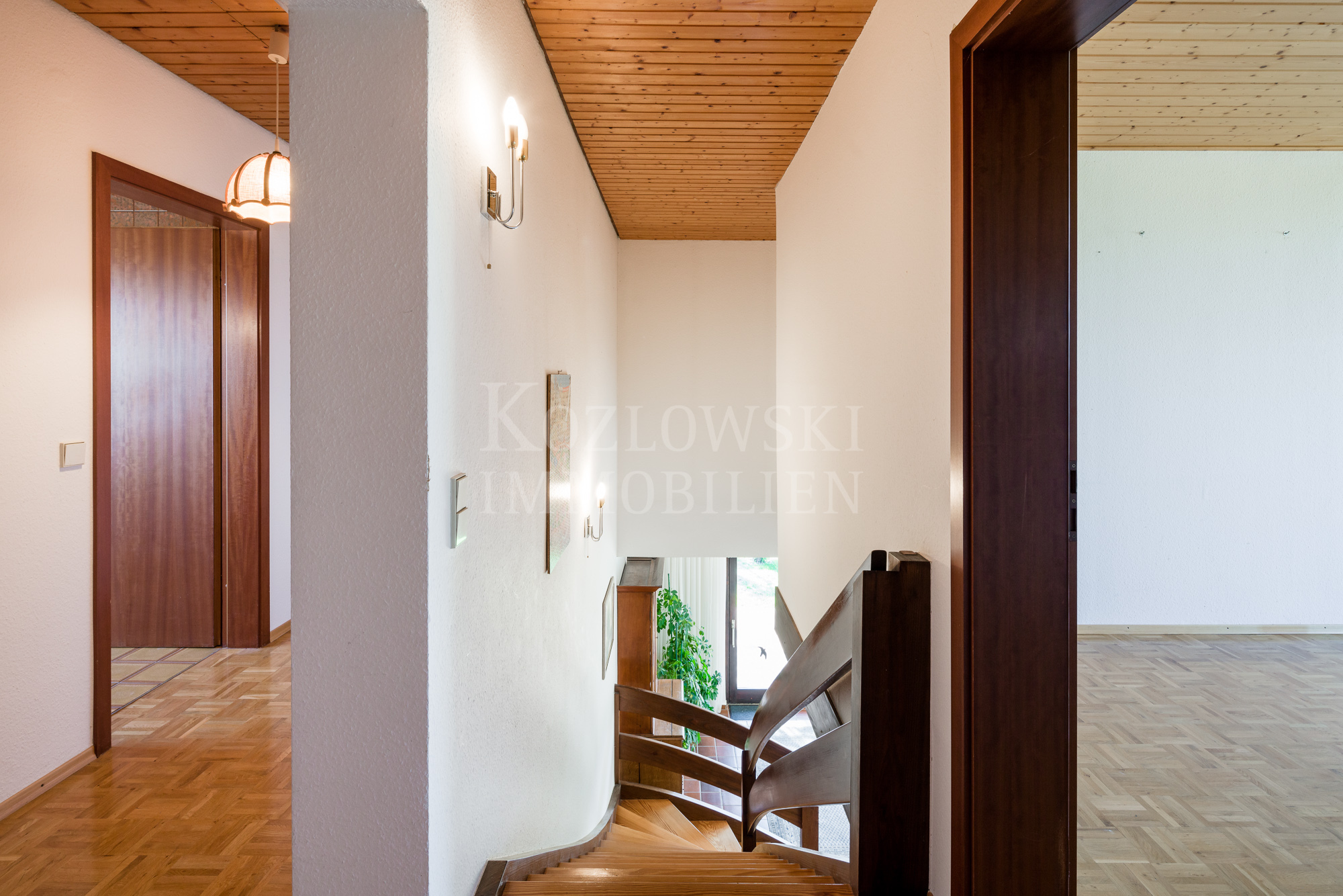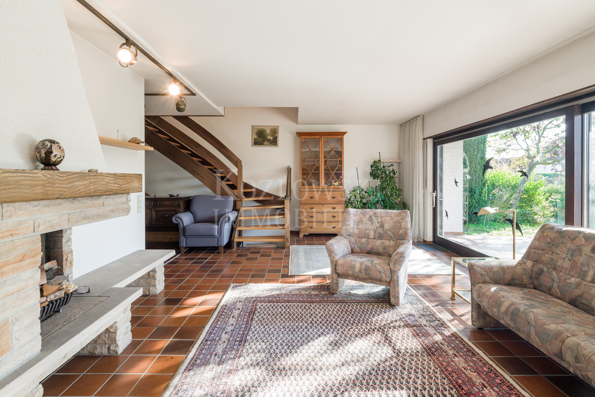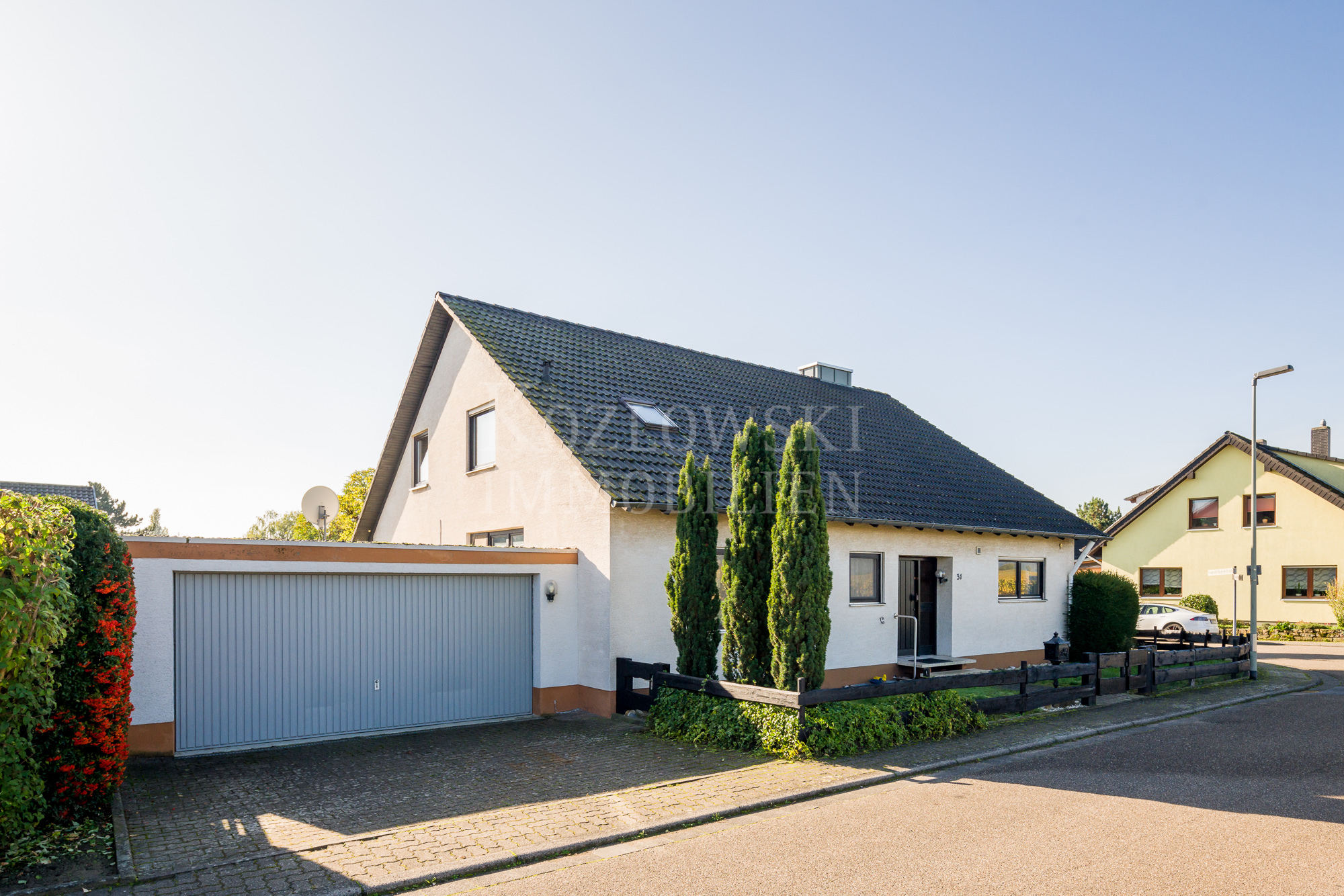 Für Homeoffice und Gäste gibt es alternative Möglichkeiten sowie Ausbaureserve im Dachgeschoss. Ein Kellergeschoss mit viel Platz für Hobbys, Wirtschaftsraum sowie Stau- und Nutzfläche runden das Angebot ab. Das Raumkonzept mit fünf Schlafzimmern und zwei Bädern begeistert vor allem durch das großzügige und helle Wohn- und Kaminzimmer mit schönem Blick in den nahezu uneinsehbaren Sonnengarten. Die Doppelgarage am Haus verfügt zudem über einen Zugang zum Garten.