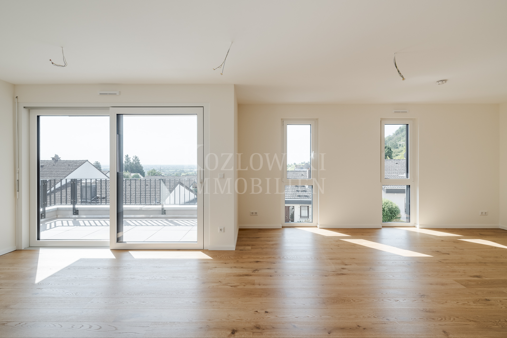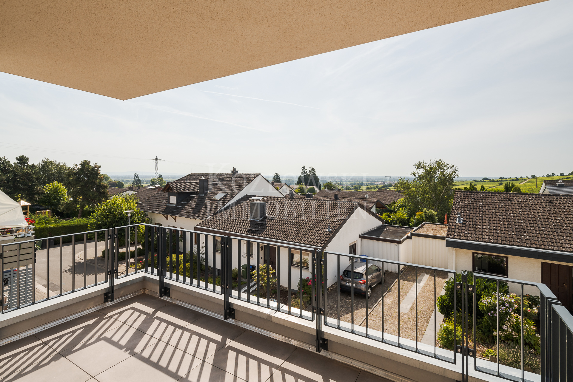Mit dem Lift gelangen Sie bequem direkt vor Ihre Wohnungstür. Hier erwartet Sie ein großzügiger Wohn-/Essbereich mit offener Küche, ein gemütliches Schlafzimmer, ein zusätzliches Zimmer, ein modernes Tageslichtbad mit Badewanne und Regendusche, ein Gäste-WC sowie ein geräumiger Hauswirtschaftsraum. Der sonnige Panorama-Balkon in Süd-Ost-Ausrichtung bietet Ihnen atemberaubende Ausblicke über die Rheinebene.
