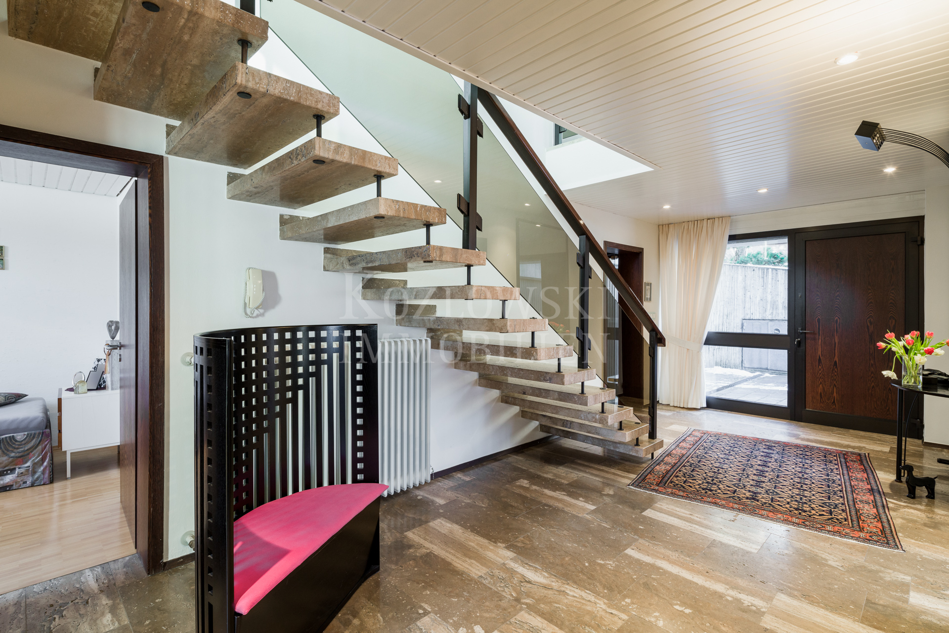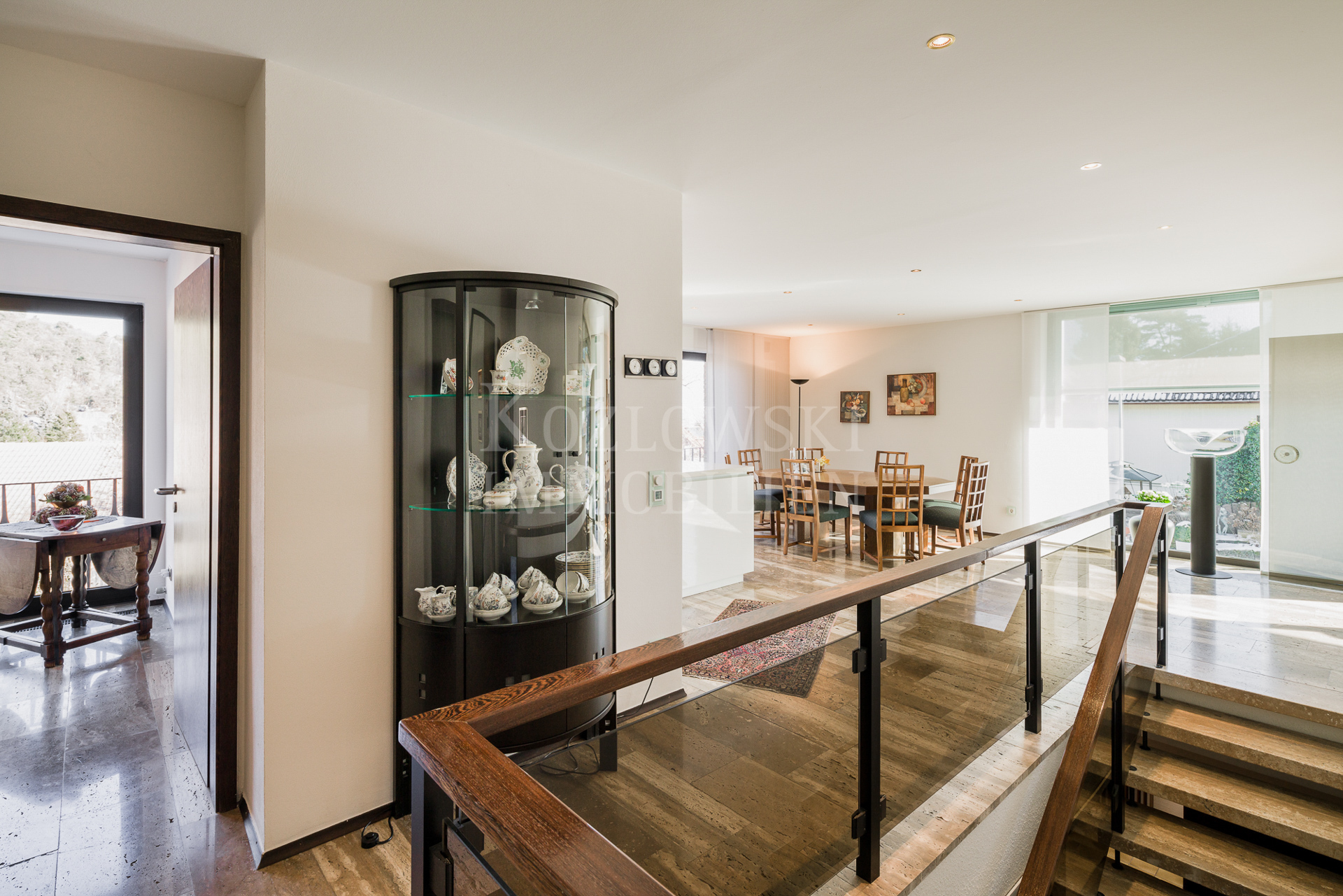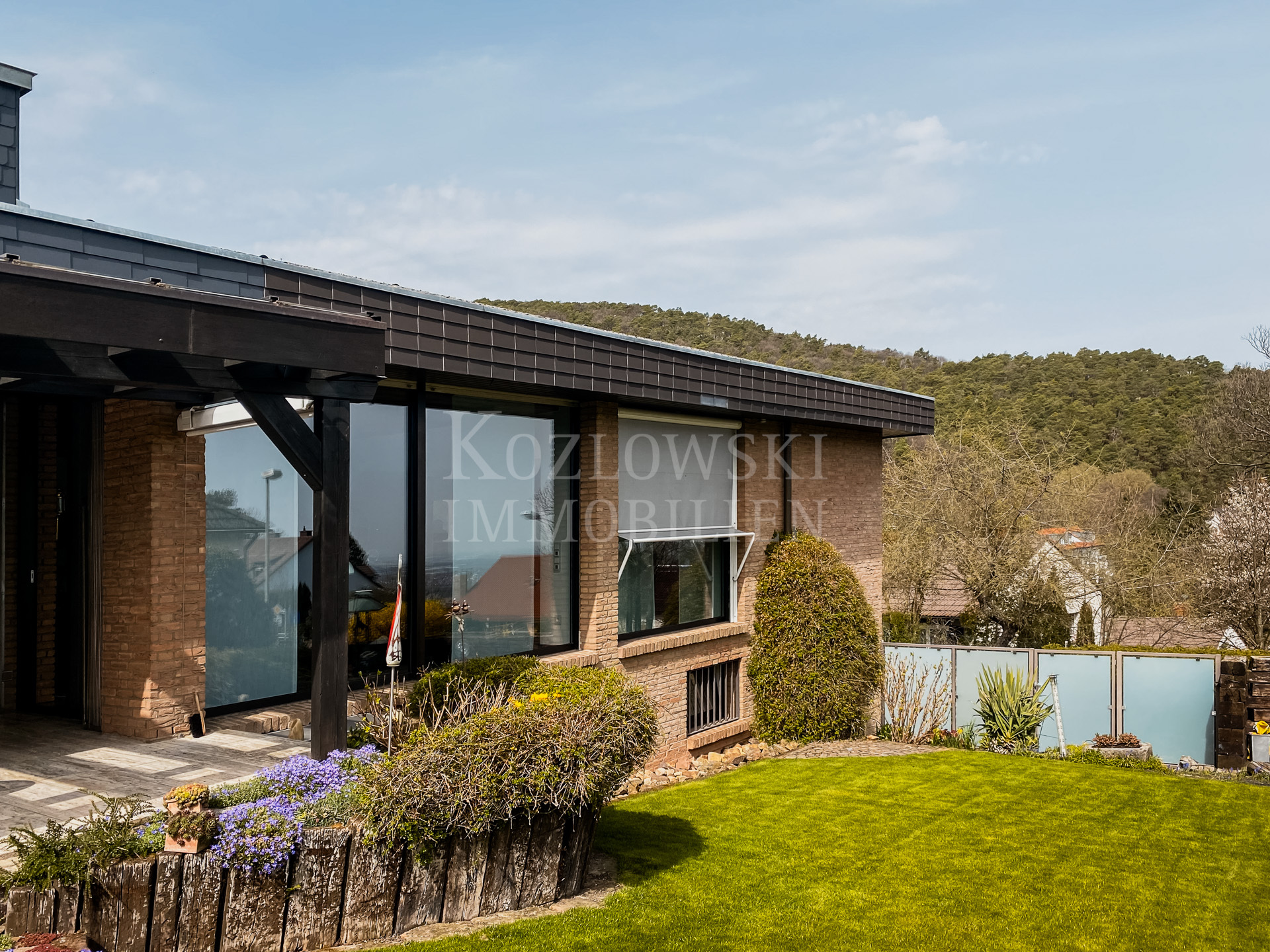 Auf der Hauptwohnebene im Oberschoss, das Sie über eine markante Innentreppe erreichen, erwartet Sie der großzügige und üppig verglaste Wohn- und Essbereich mit Kamin und offener Markenküche. Die Panoramafenster im Wohnzimmer eröffnen einen ungehinderten Blick auf Haardt und Rheinebene. Im rückwärtigen Schlaftrakt betreten Sie den Master-Bedroom mit deckenhohen Cabinet-Einbauschränken und direktem Zugang zur 2. Gartenterrasse, das Masterbad mit Dusche, Wanne, Bidet sowie ein Arbeitszimmer und Gäste WC. Das 2013 modernisierte Anwesen präsentiert sich in einem außergewöhnlich gepflegten Zustand mit hochklassigen Materialien mit 70er Jahre Flair.