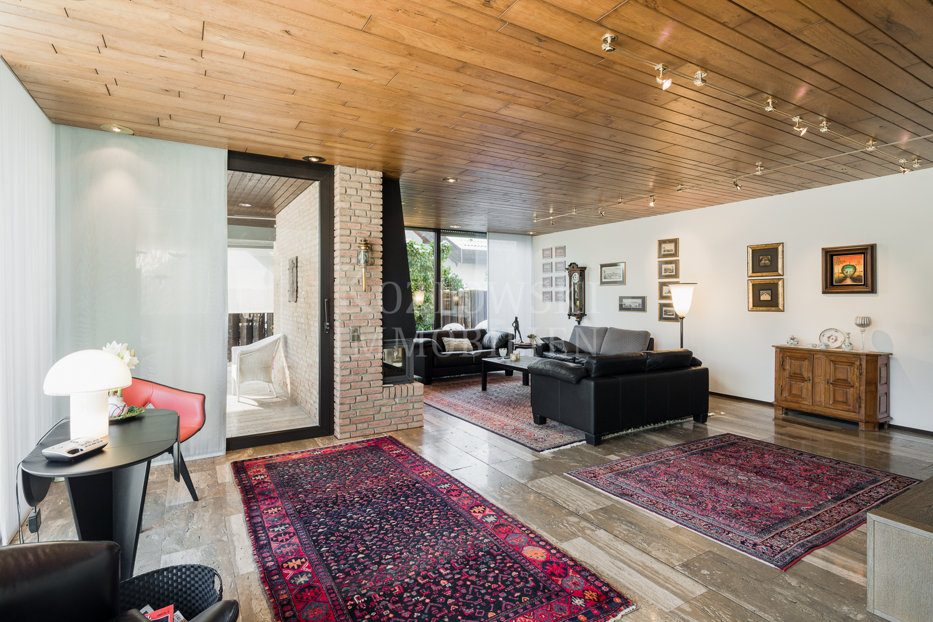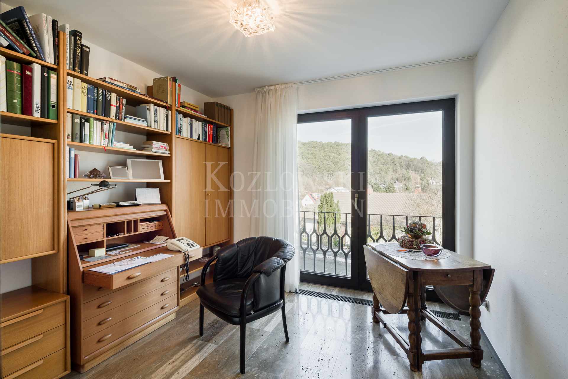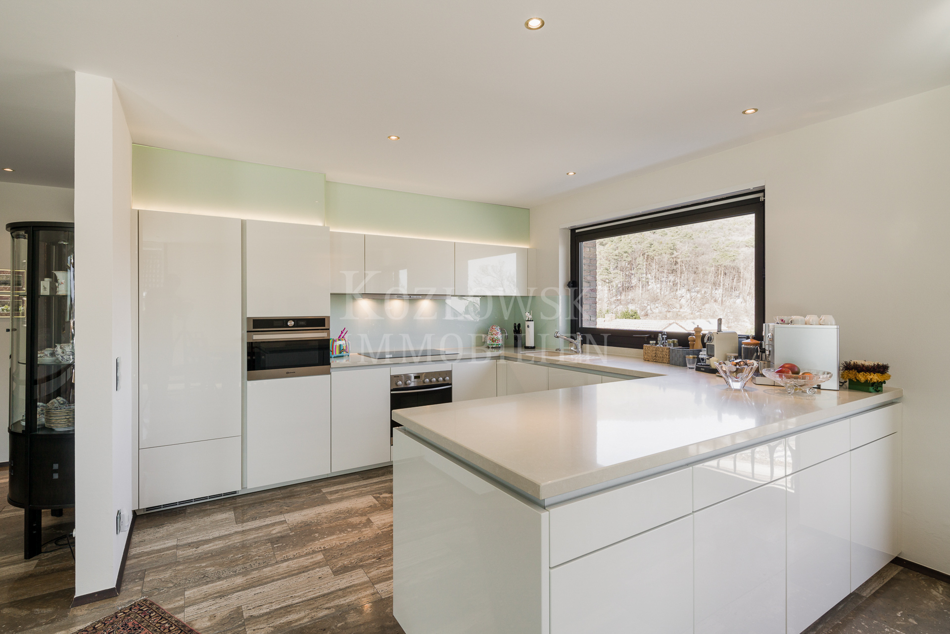 Auf der Hauptwohnebene im Oberschoss, das Sie über eine markante Innentreppe erreichen, erwartet Sie der großzügige und üppig verglaste Wohn- und Essbereich mit Kamin und offener Markenküche. Die Panoramafenster im Wohnzimmer eröffnen einen ungehinderten Blick auf Haardt und Rheinebene. Im rückwärtigen Schlaftrakt betreten Sie den Master-Bedroom mit deckenhohen Cabinet-Einbauschränken und direktem Zugang zur 2. Gartenterrasse, das Masterbad mit Dusche, Wanne, Bidet sowie ein Arbeitszimmer und Gäste WC. Das 2013 modernisierte Anwesen präsentiert sich in einem außergewöhnlich gepflegten Zustand mit hochklassigen Materialien mit 70er Jahre Flair.