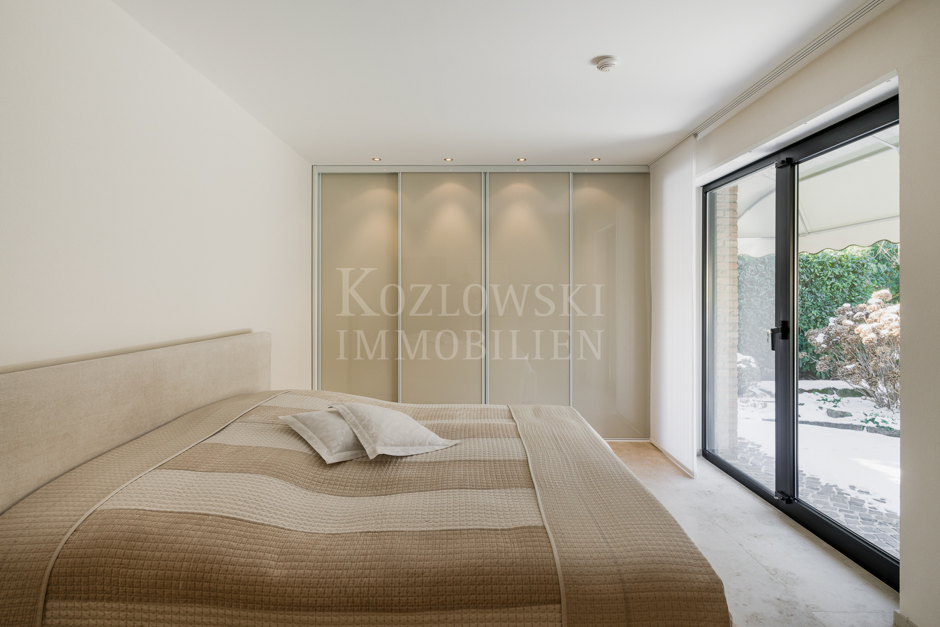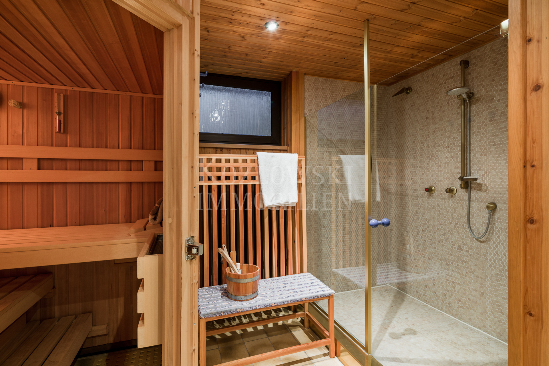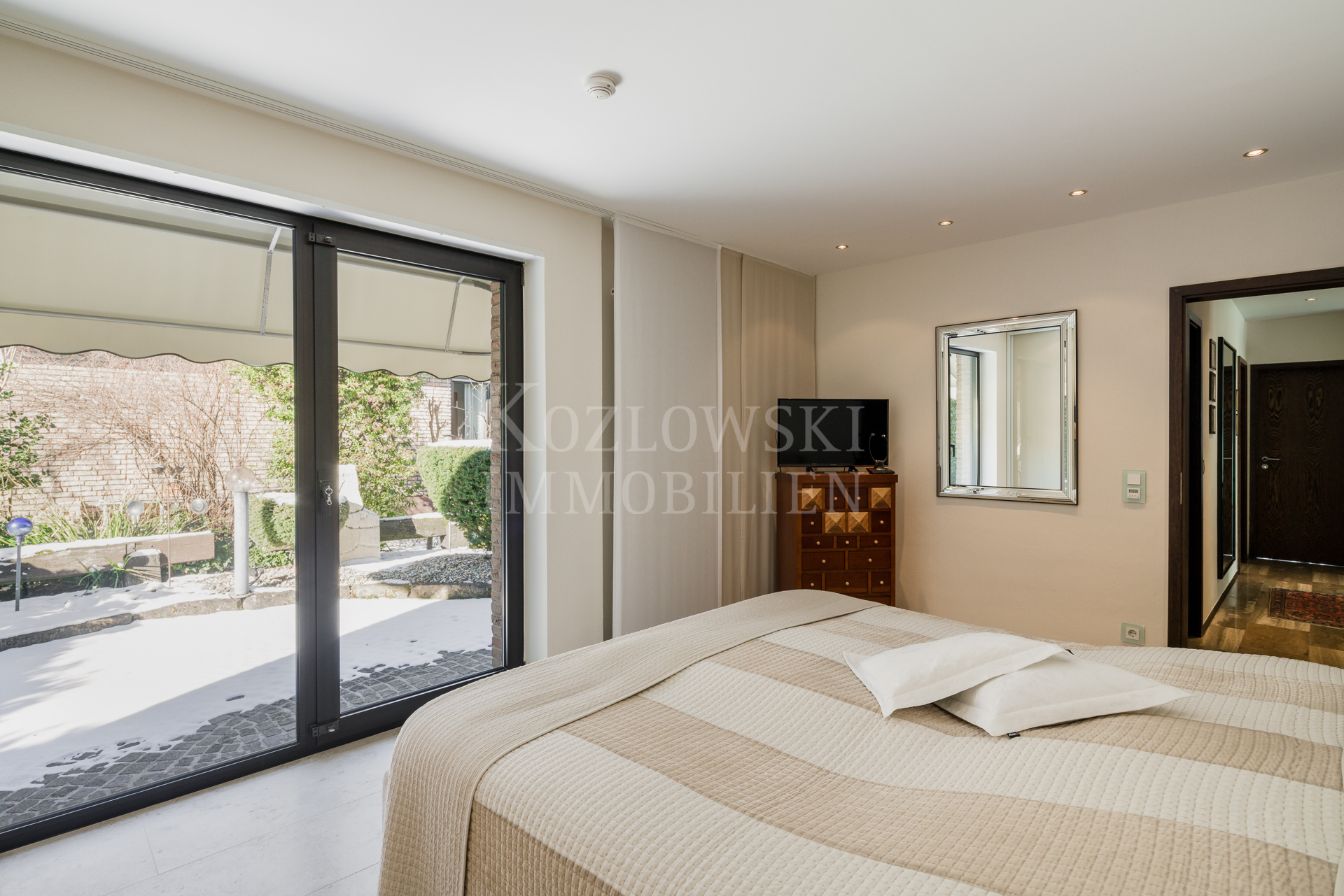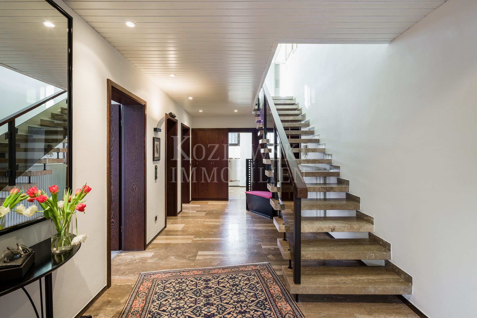 Auf 2 Etagen bietet Ihnen dieses ausgefallene Objekt ca. 196 qm Wohnfläche und einen schön angelegten Garten mit 2 Terrassen und einem Grillplatz. Ein großflächig mit Travertinstein ausgelegtes Entreé mit hell verputzten Wänden und Downlights empfängt Sie im Erdgeschoss mit 3 Schlafräumen/Kinder- oder Gästezimmern, einem Duschbad, einem Küchen- und Hauswirtschaftsraum. Im hangseitigen Trakt verlockt der ebenfalls geflieste und beheizte Wellnessbereich mit Sauna, Fitnessraum und Erlebnisdusche. Kellerräume bieten viel Stauraum.