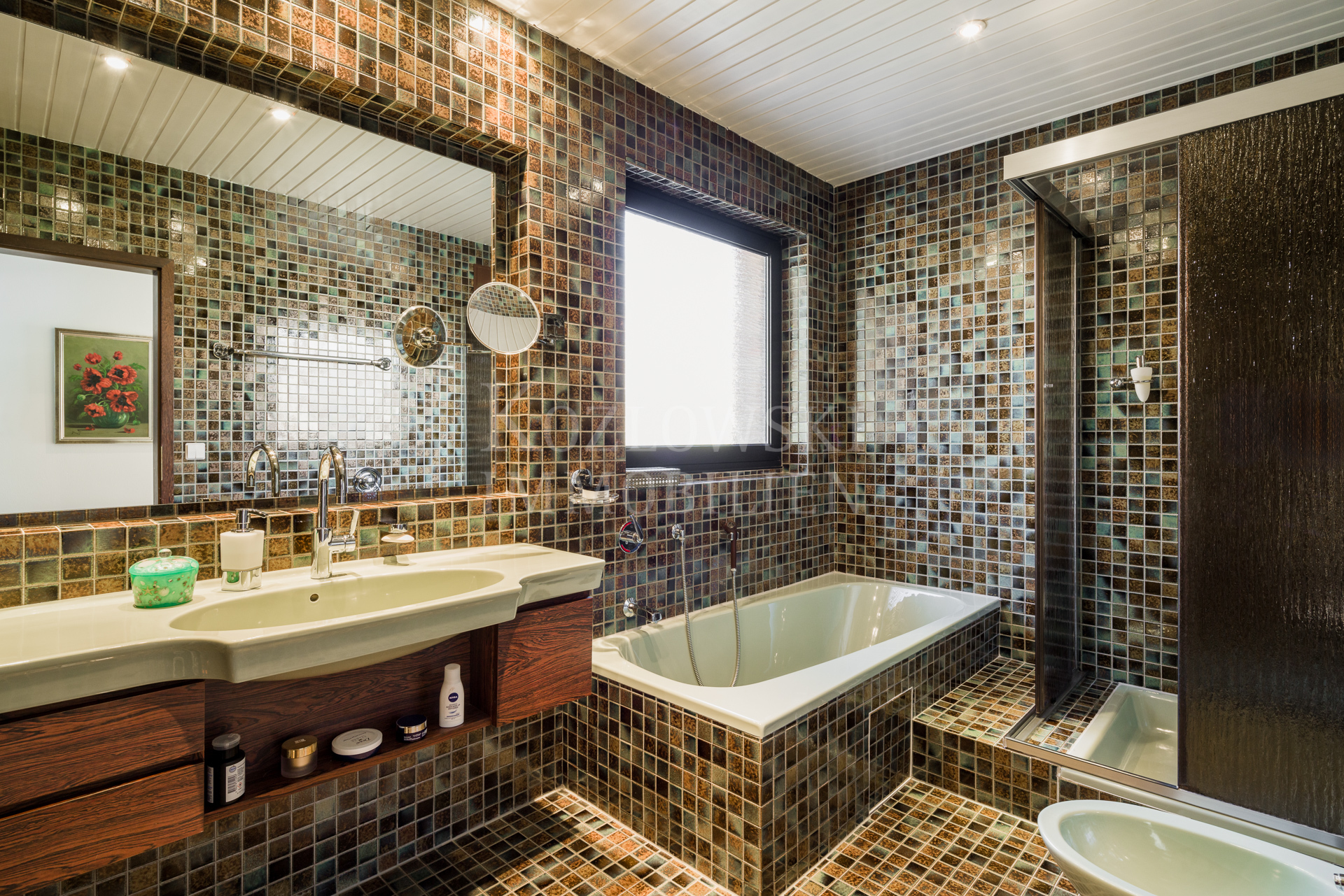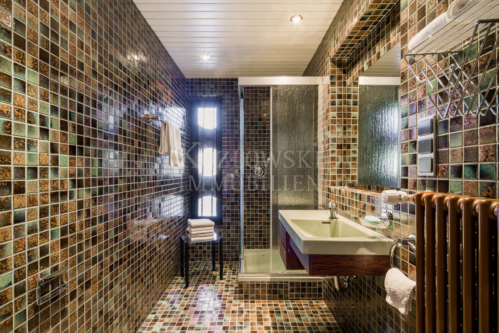• Glasierte Mosaikfliesen in den Bädern