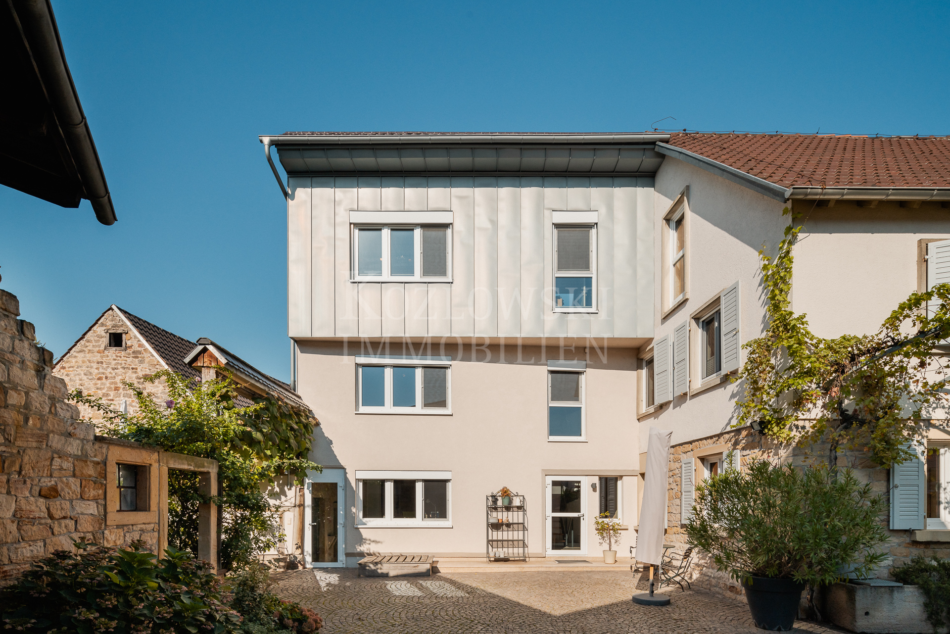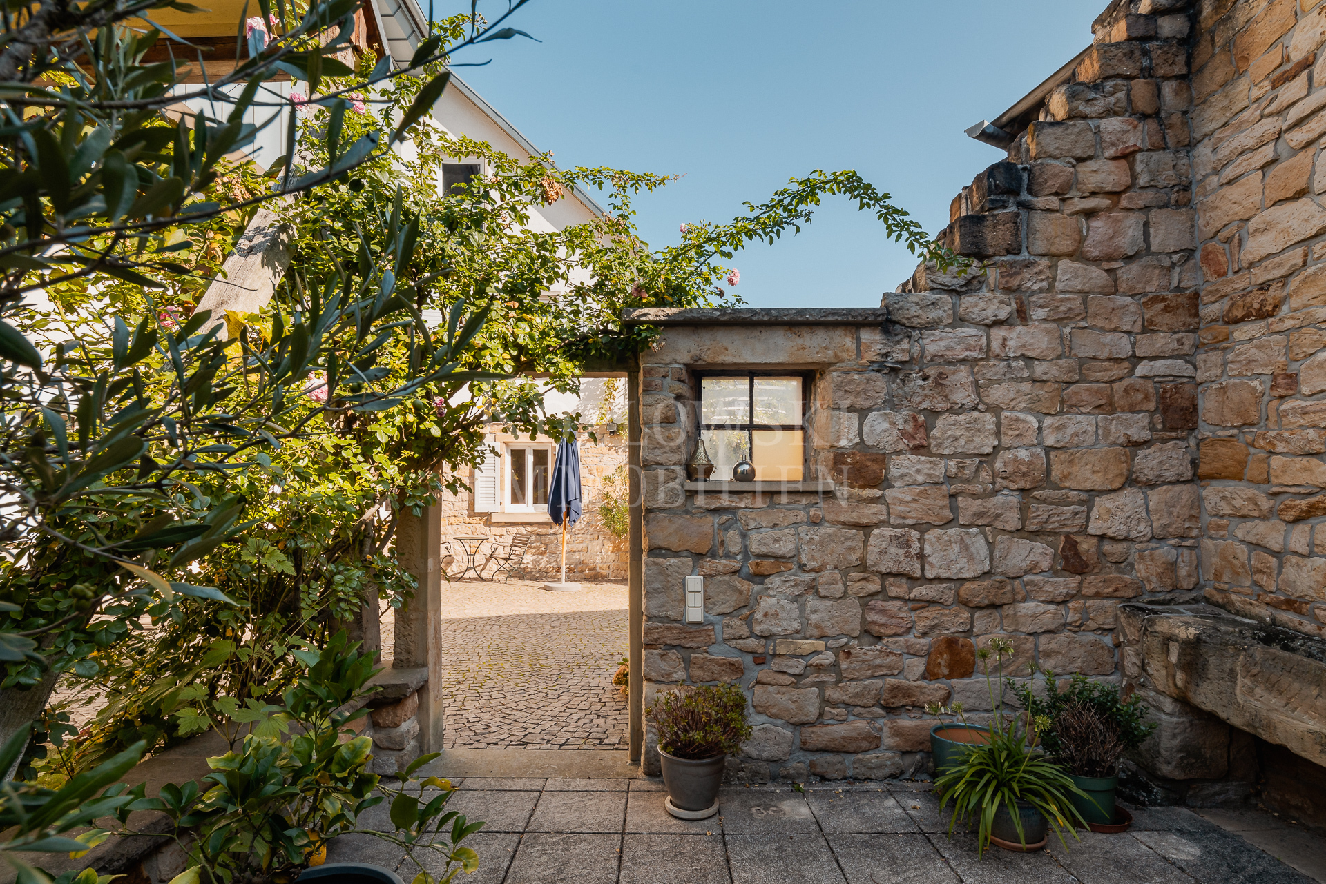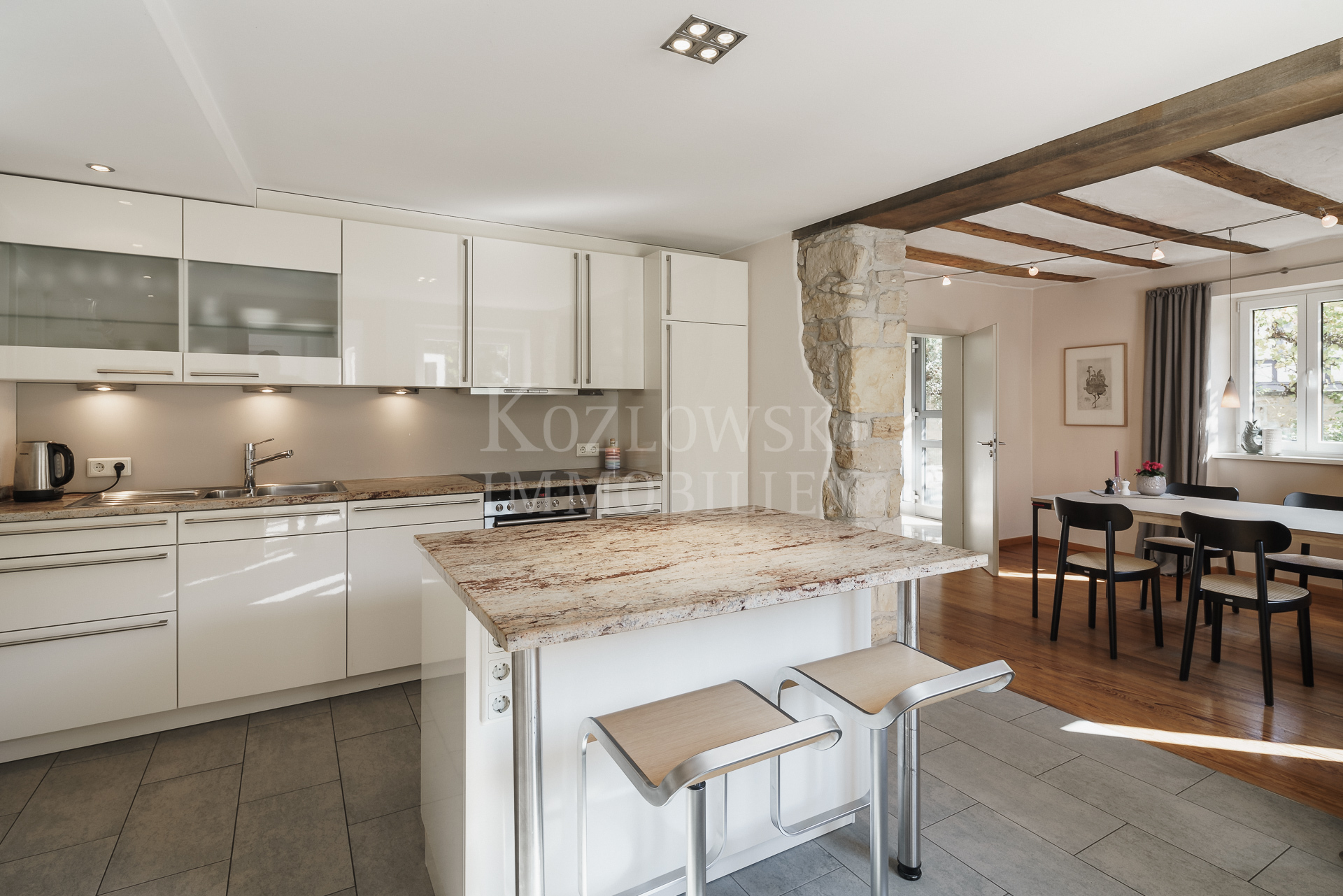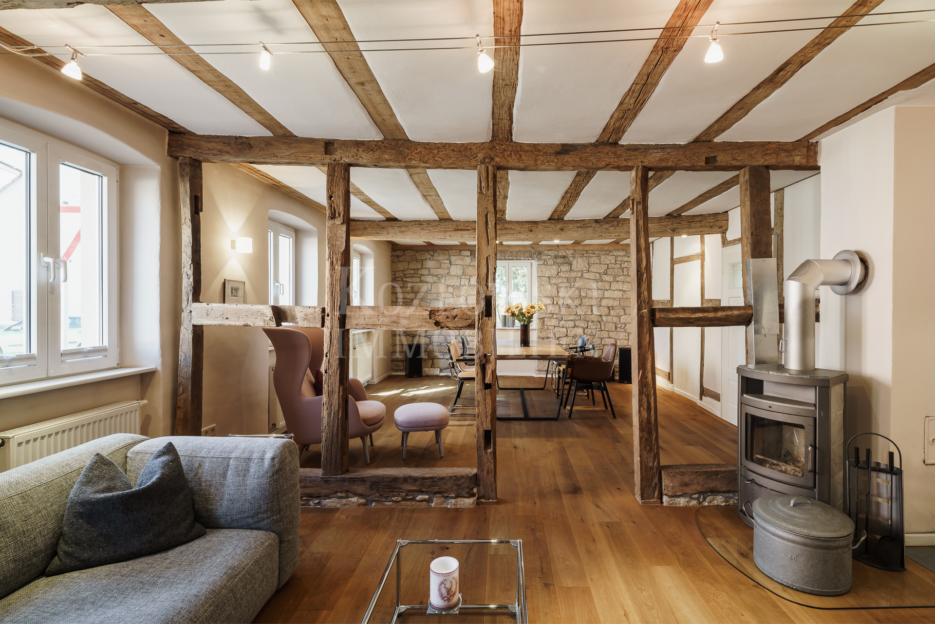 Das Raumangebot dieses 2010 aufwendig sanierten und aufgestockten Ensembles umfasst 8 Zimmer mit ca. 300 qm Wohn-/Arbeitsfläche und erstreckt sich über drei Wohnetagen, die im alten Teil über eine massive Granittreppe und im Anbau mit freitragender Designtreppe verbunden sind. Diese besondere Immobilie imponiert mit einem weitläufigen Wohn-/Essbereich mit Kaminofen, und historischem Ständerwerk und Sichtmauerwerk, der an eine offene, voll ausgestattete Küche mit Esstheke und großer Speisekammer anschließt. Im Untergeschoss befindet sich der passende Weinkeller. Im OG stehen Ihnen vier perfekt geschnittene Schlaf-/Kinder-/Gästezimmer mit Tageslichtbad, HWR und großer Sonnenterrasse zur Verfügung. Im aufgebauten Dachgeschoss in Holzständerbauweise beeindruckt der Masterbedroom mit großen Fensterfronten und firsthoher Balkenlage , einem Ankleideraum mit Einbauschränken, sowie das Masterbad mit bodengleicher „walk-in-Dusche“. Der anschließende geräumige Dachspeicher bietet viel zusätzlichen Stauraum.