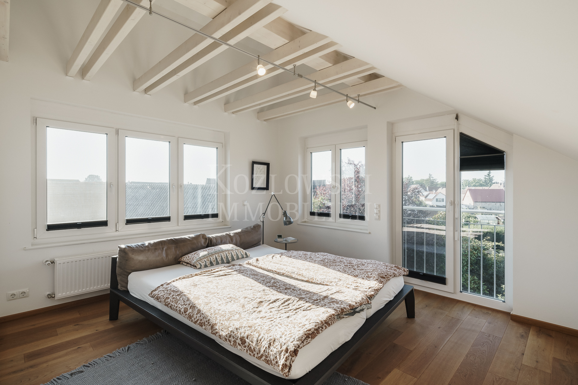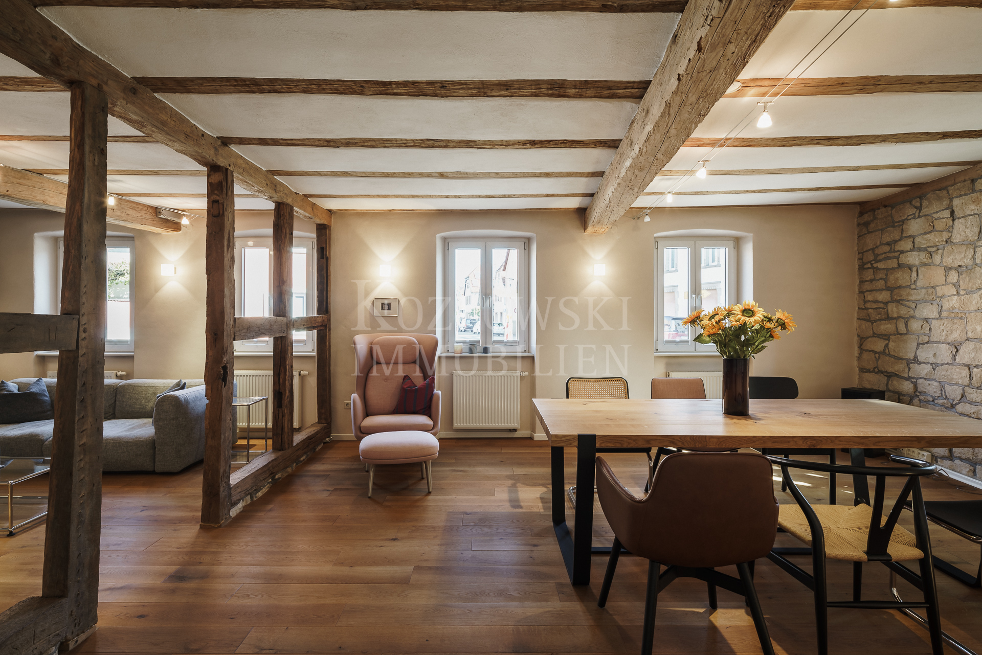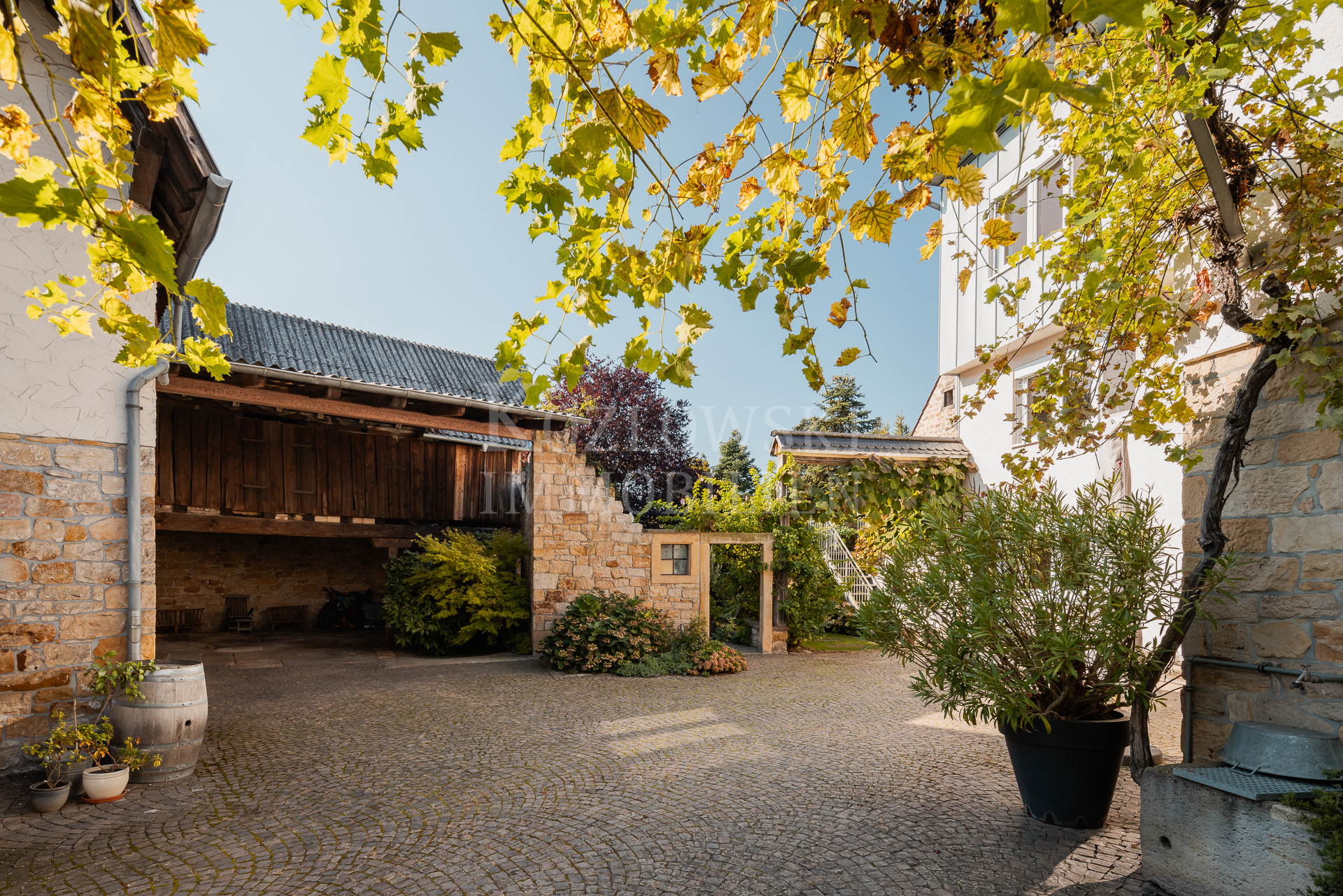 Das Raumangebot dieses 2010 aufwendig sanierten und aufgestockten Ensembles umfasst 8 Zimmer mit ca. 300 qm Wohn-/Arbeitsfläche und erstreckt sich über drei Wohnetagen, die im alten Teil über eine massive Granittreppe und im Anbau mit freitragender Designtreppe verbunden sind. Diese besondere Immobilie imponiert mit einem weitläufigen Wohn-/Essbereich mit Kaminofen, und historischem Ständerwerk und Sichtmauerwerk, der an eine offene, voll ausgestattete Küche mit Esstheke und großer Speisekammer anschließt. Im Untergeschoss befindet sich der passende Weinkeller. Im OG stehen Ihnen vier perfekt geschnittene Schlaf-/Kinder-/Gästezimmer mit Tageslichtbad, HWR und großer Sonnenterrasse zur Verfügung. Im aufgebauten Dachgeschoss in Holzständerbauweise beeindruckt der Masterbedroom mit großen Fensterfronten und firsthoher Balkenlage , einem Ankleideraum mit Einbauschränken, sowie das Masterbad mit bodengleicher „walk-in-Dusche“. Der anschließende geräumige Dachspeicher bietet viel zusätzlichen Stauraum.