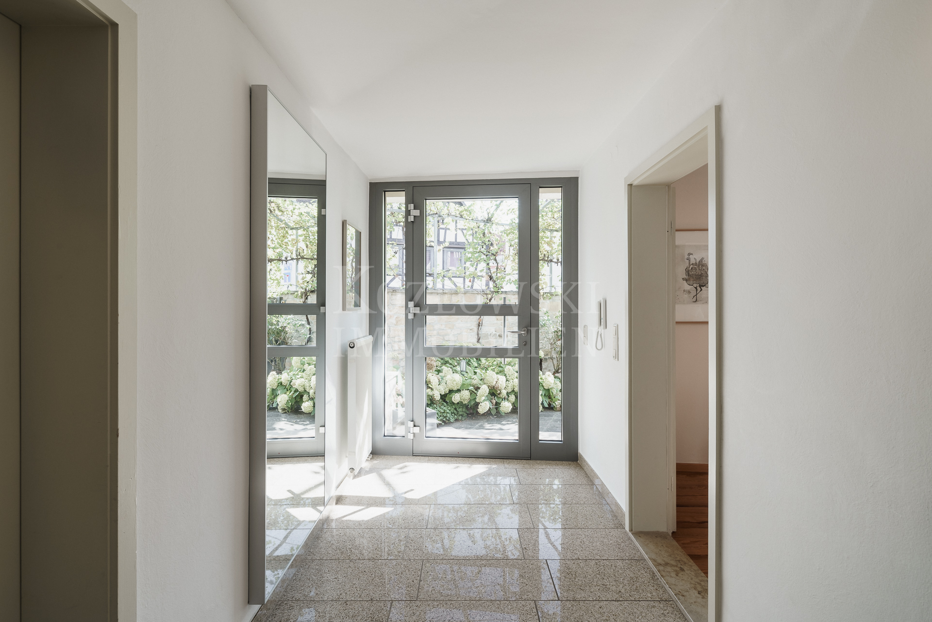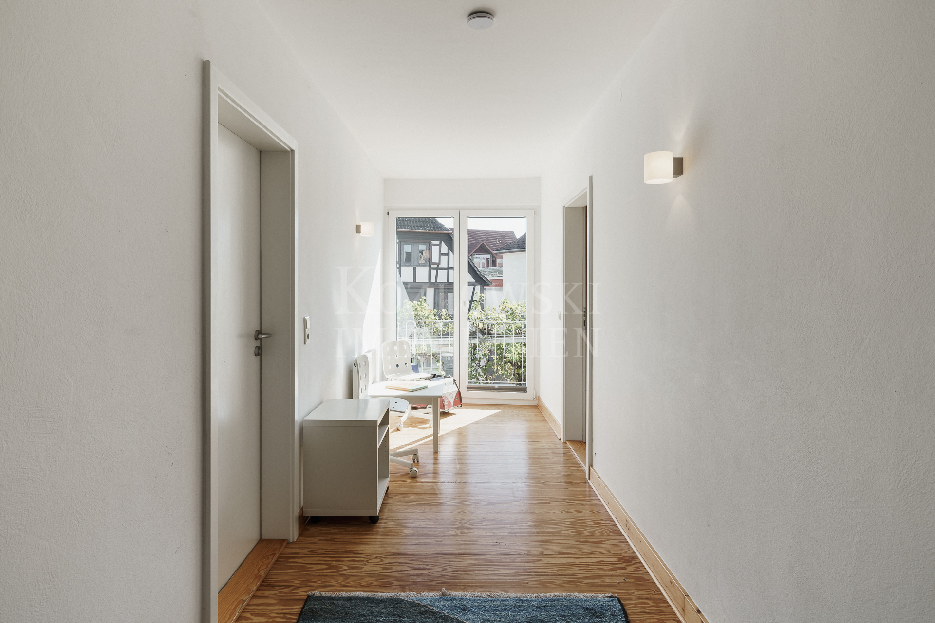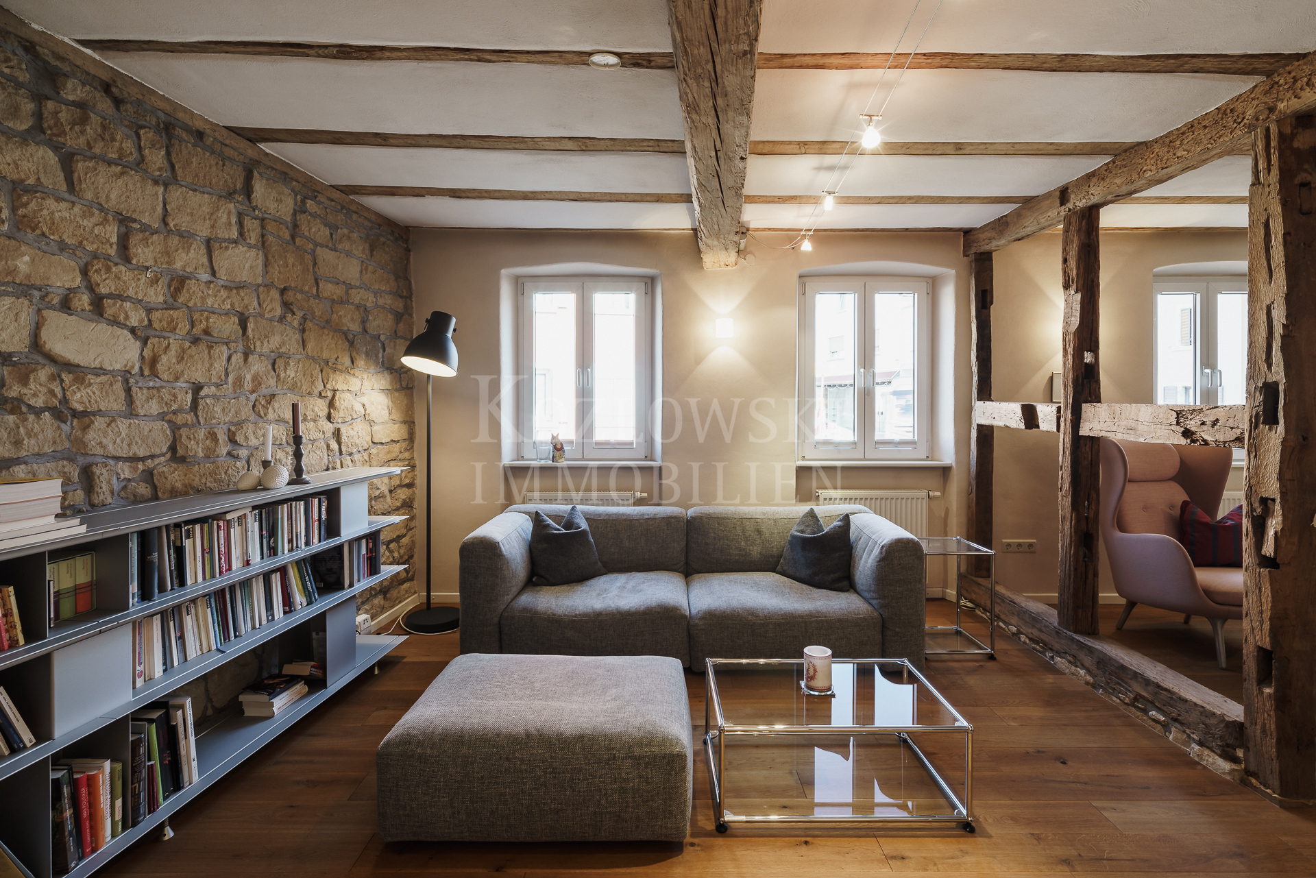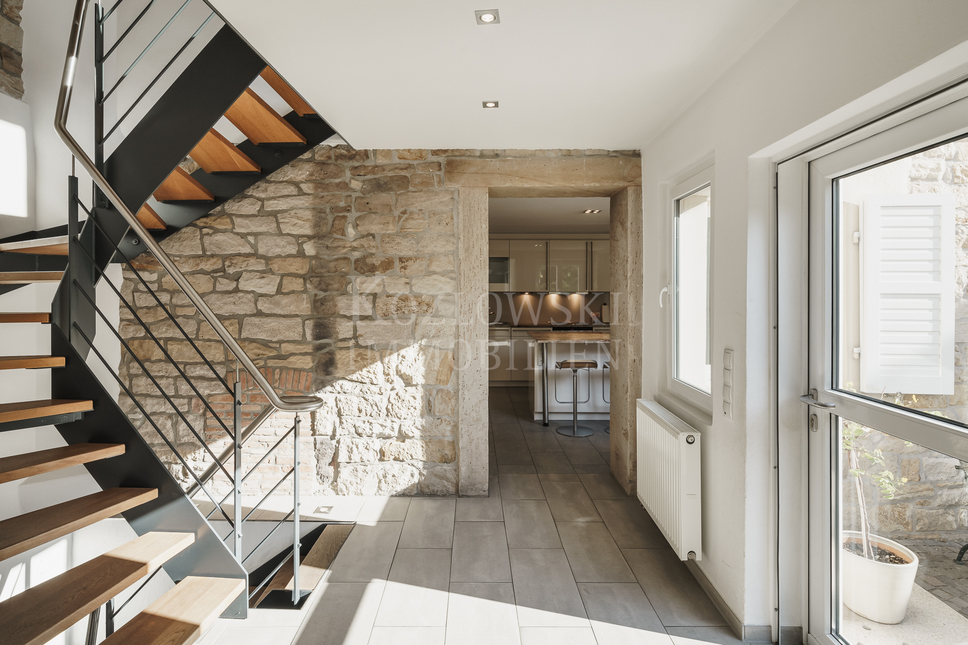 Das Raumangebot dieses 2010 aufwendig sanierten und aufgestockten Ensembles umfasst 8 Zimmer mit ca. 300 qm Wohn-/Arbeitsfläche und erstreckt sich über drei Wohnetagen, die im alten Teil über eine massive Granittreppe und im Anbau mit freitragender Designtreppe verbunden sind. Diese besondere Immobilie imponiert mit einem weitläufigen Wohn-/Essbereich mit Kaminofen, und historischem Ständerwerk und Sichtmauerwerk, der an eine offene, voll ausgestattete Küche mit Esstheke und großer Speisekammer anschließt. Im Untergeschoss befindet sich der passende Weinkeller. Im OG stehen Ihnen vier perfekt geschnittene Schlaf-/Kinder-/Gästezimmer mit Tageslichtbad, HWR und großer Sonnenterrasse zur Verfügung. Im aufgebauten Dachgeschoss in Holzständerbauweise beeindruckt der Masterbedroom mit großen Fensterfronten und firsthoher Balkenlage , einem Ankleideraum mit Einbauschränken, sowie das Masterbad mit bodengleicher „walk-in-Dusche“. Der anschließende geräumige Dachspeicher bietet viel zusätzlichen Stauraum.