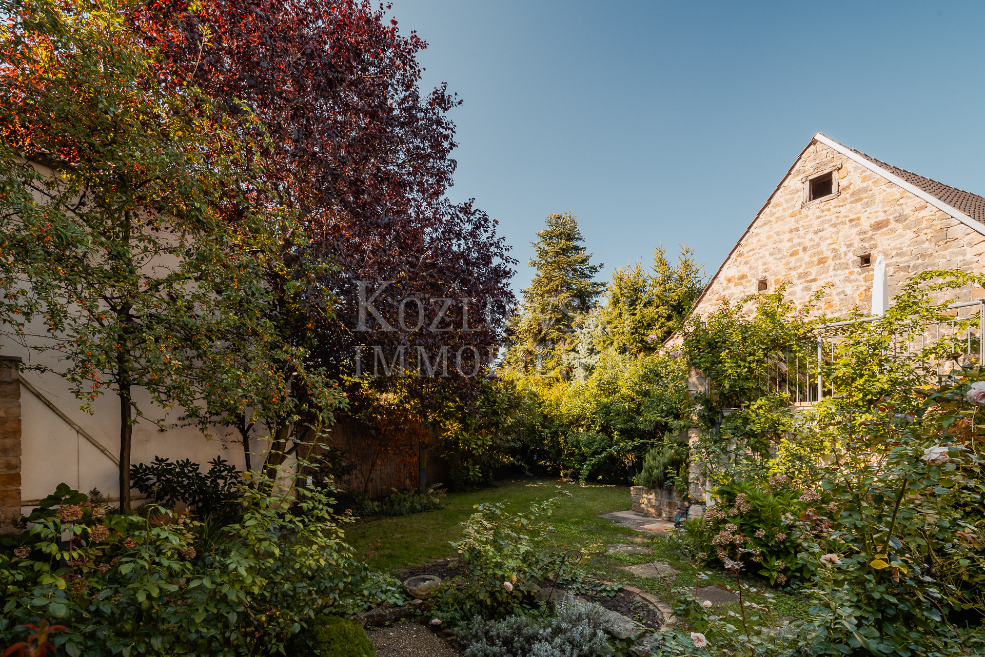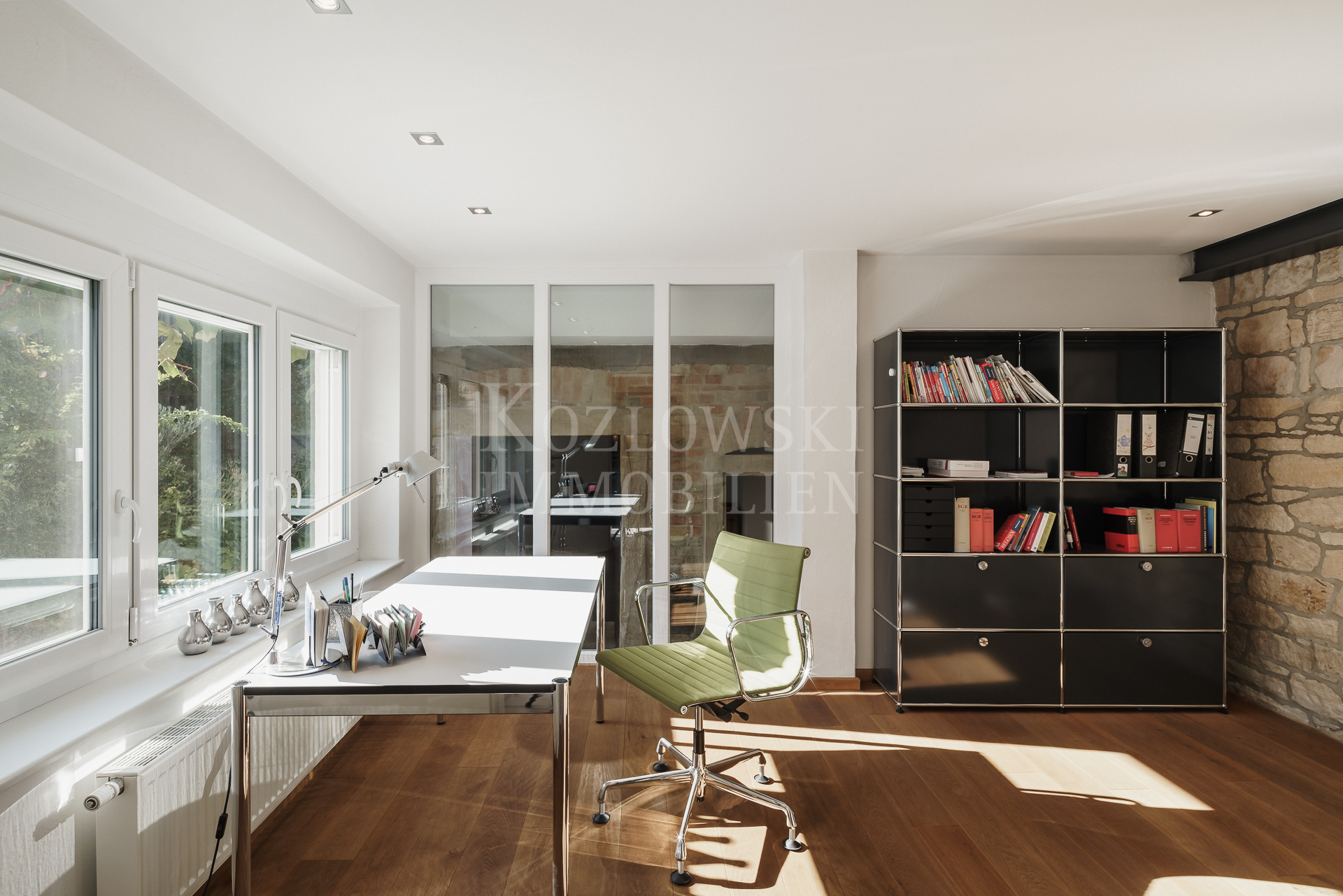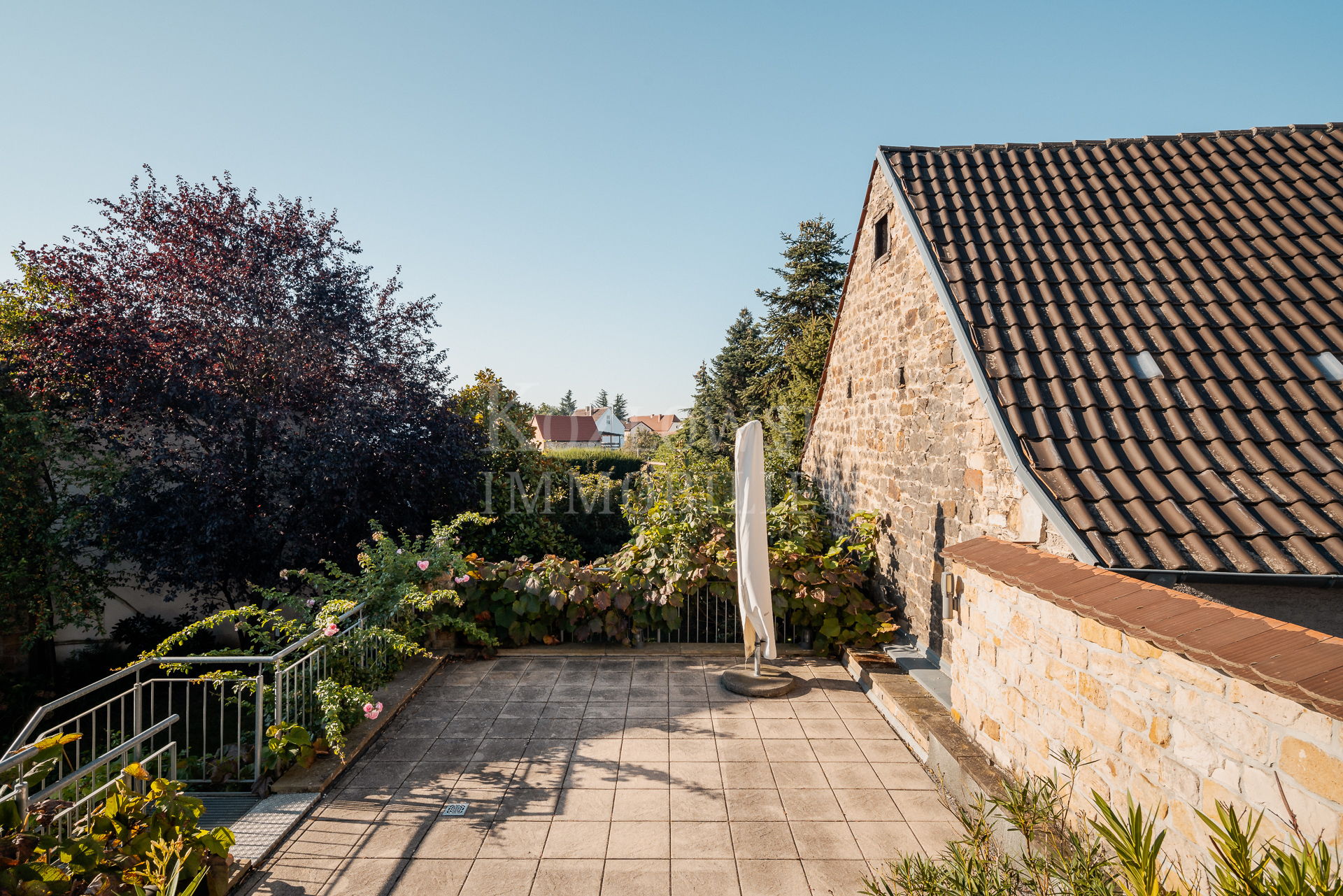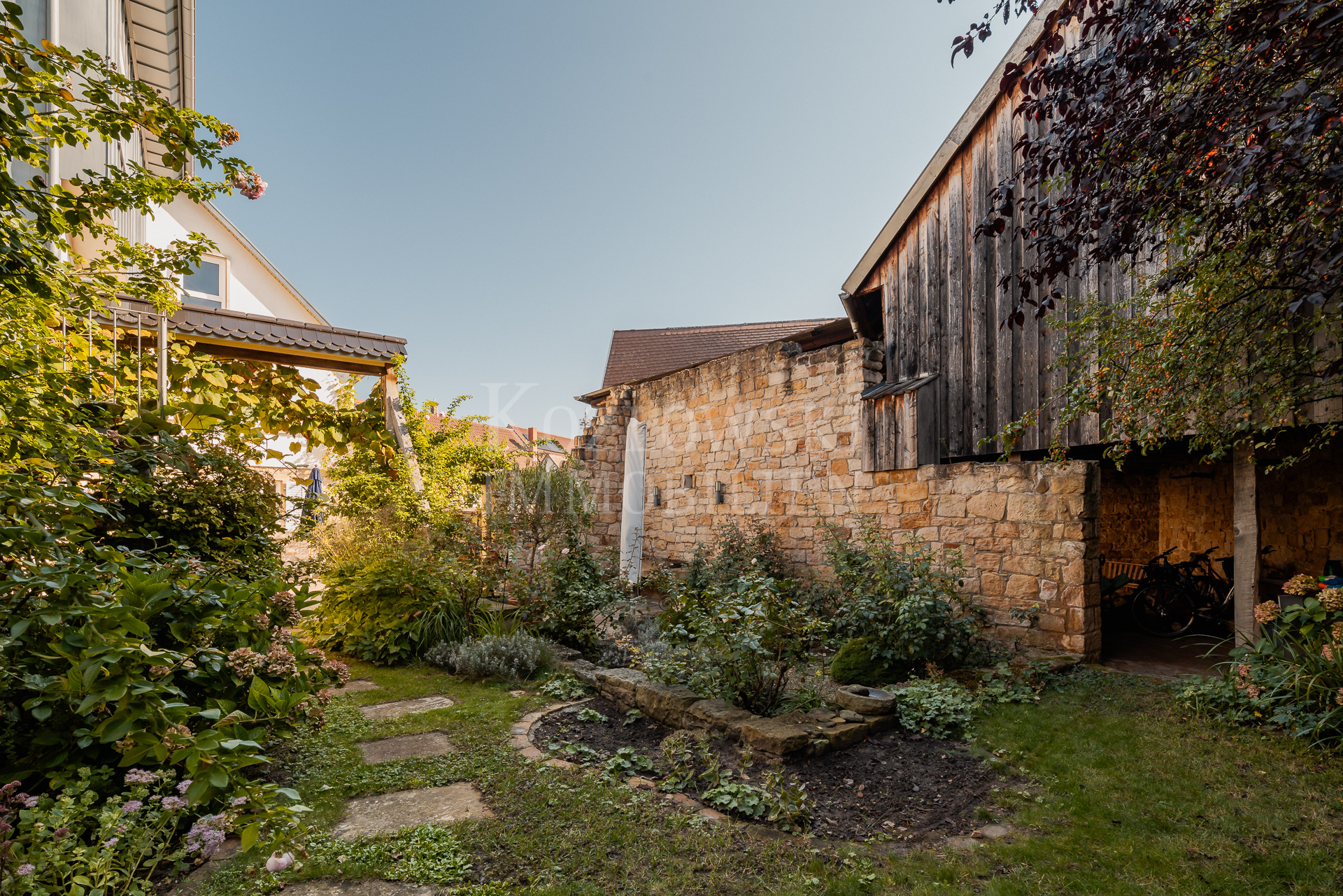 Dank des ausgezeichneten Grundrisses bietet Ihnen dieses Objekt einen autarken Bürotrakt mit stylischem WC und eigenem Außenzugang . Ein echter „eye-catcher“ ist der Sandstein-Freisitz im idyllischen Garten neben der ehemaligen Scheune. Diese bietet im EG Lager- oder Stellplätze und im OG eine Ausbaureserve von ca. 110 qm.