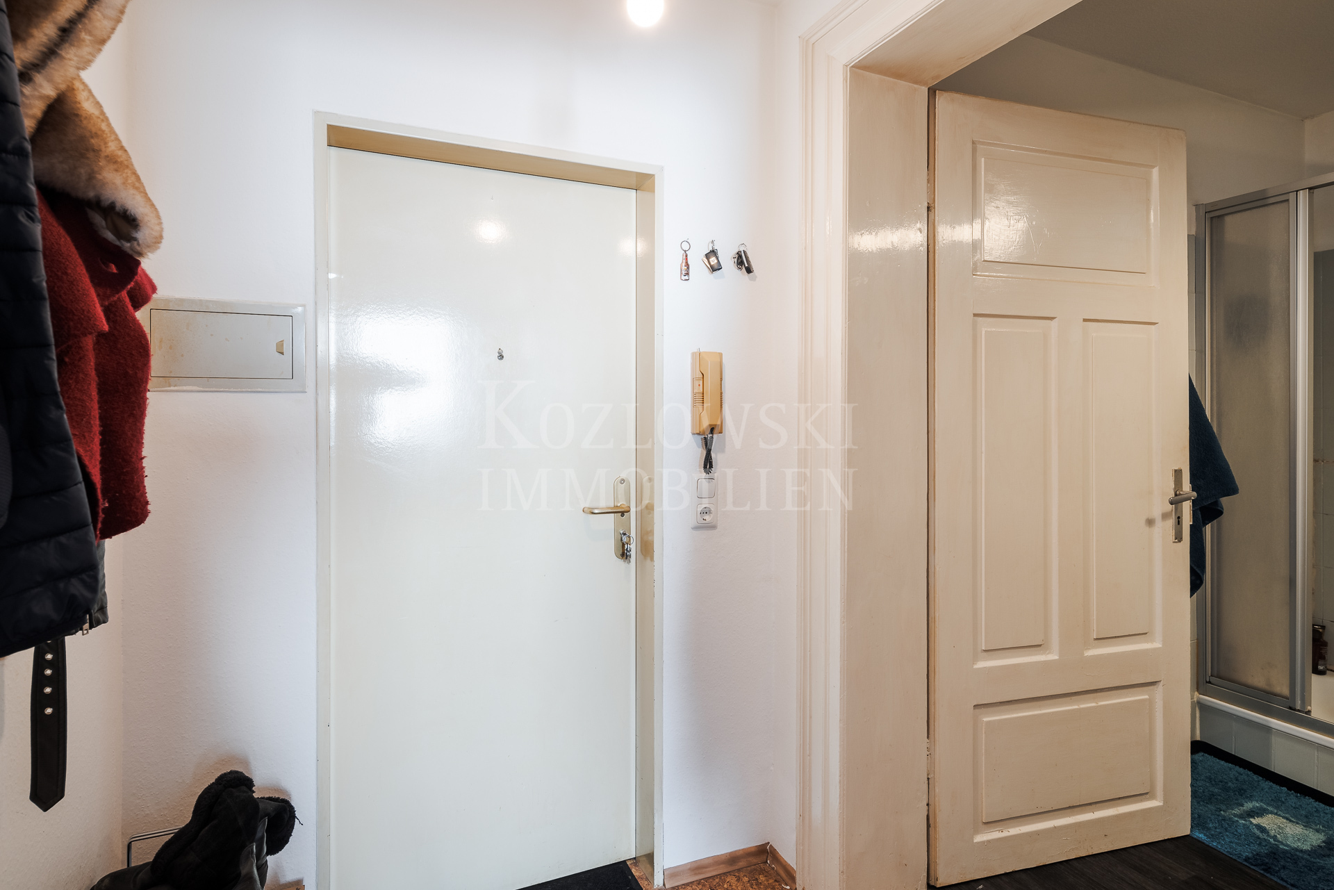 – Rechts WE 2: 2,5 ZKB, ca. 54,77 qm Wfl., Flur, 1 Dusche/WC, 1 Abstellkammer, vermietet seit 01.05.2023