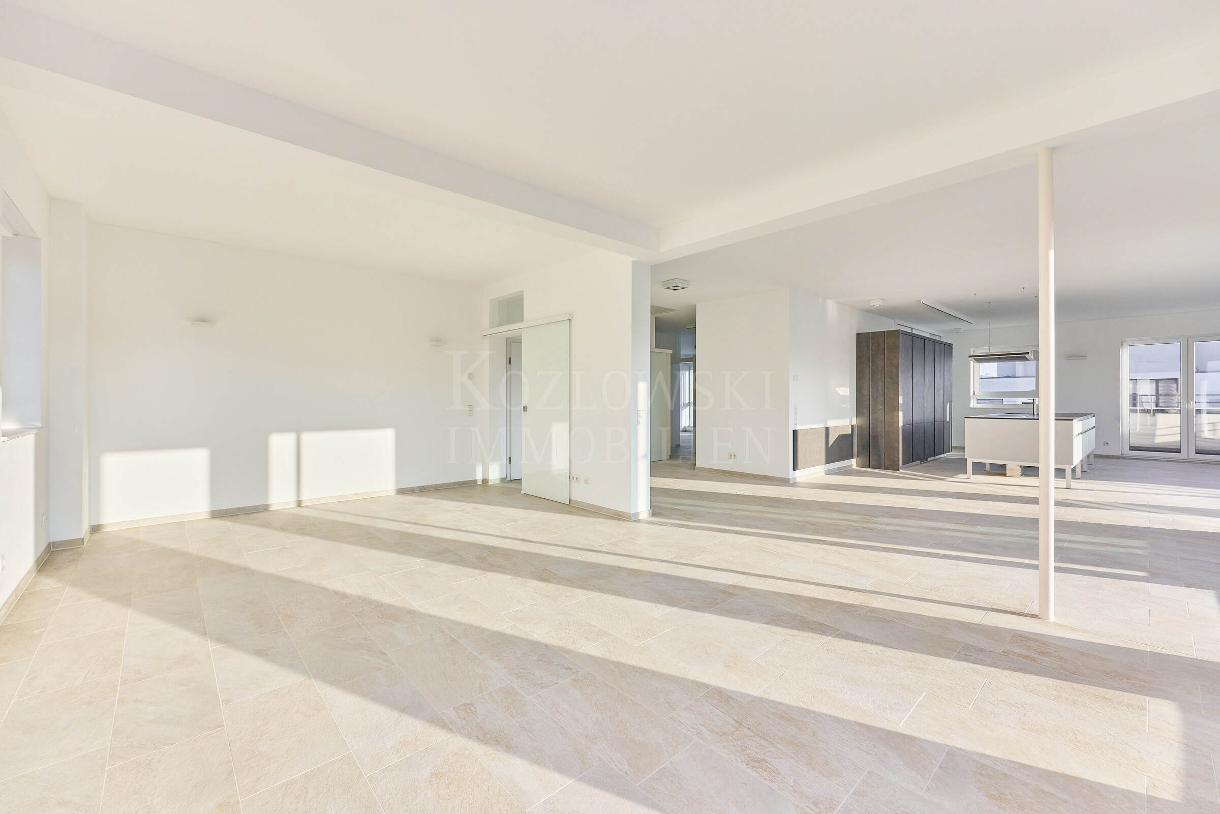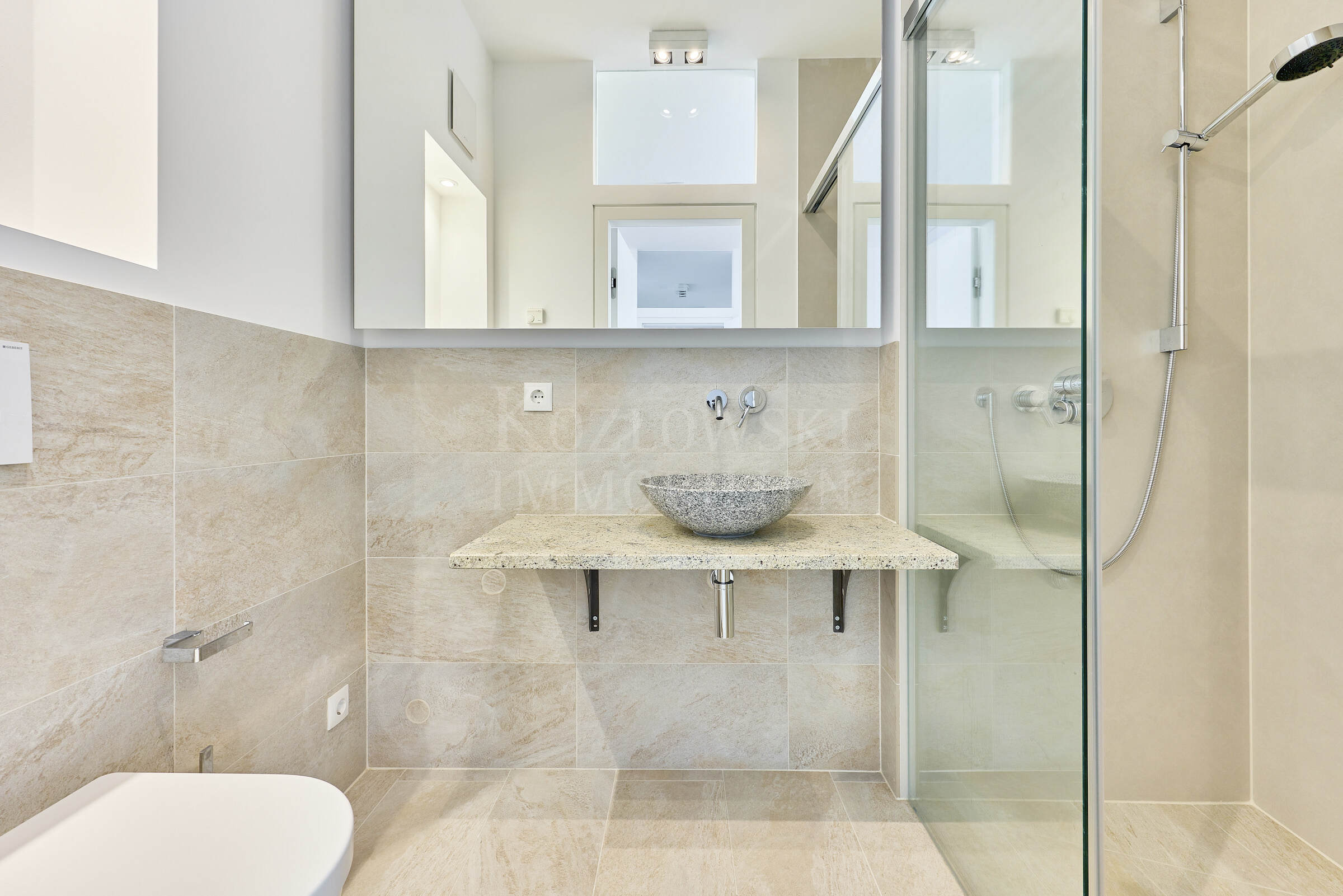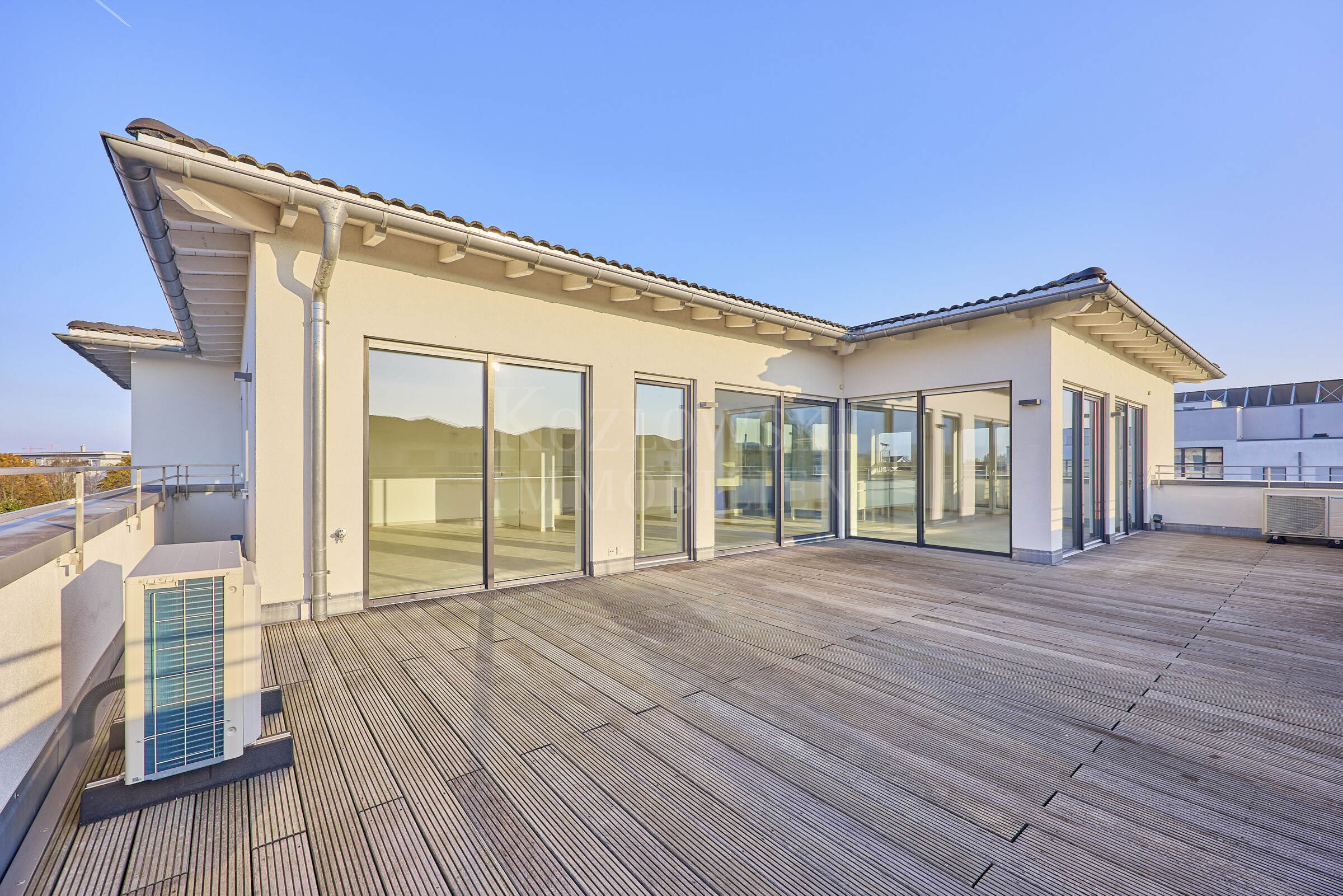 Erbaut im Jahr 2015, überzeugt das klimatisierte Penthouse mit seinem extravagant großzügigen Grundriss, über 2,70 m hohen Decken und einer sehr geschmackvollen und luxuriösen Design-Ausstattung. Der offen gestaltete Wohn-Ess-Küchenbereich mit einer Zeyko-Designküche und modernster Miele-Technik bildet das Herzstück dieser lichtdurchfluteten Wohnung. Der großzügige Master-Bedroom mit begehbarem Kleiderschrank und en suite Masterbad sowie ein stylisches Gäste-WC mit Dusche bieten höchsten Komfort. Das Highlight ist die große, südwestlich ausgerichtete Dachterrasse mit ca. 66 qm, die ganztägig Sonnengenuss ermöglicht. Eine zweite, kleinere Südterrasse lädt ebenfalls zum Entspannen im Freien ein. Durch einfache bauliche Maßnahmen kann ein weiteres Schlafzimmer geschaffen werden.