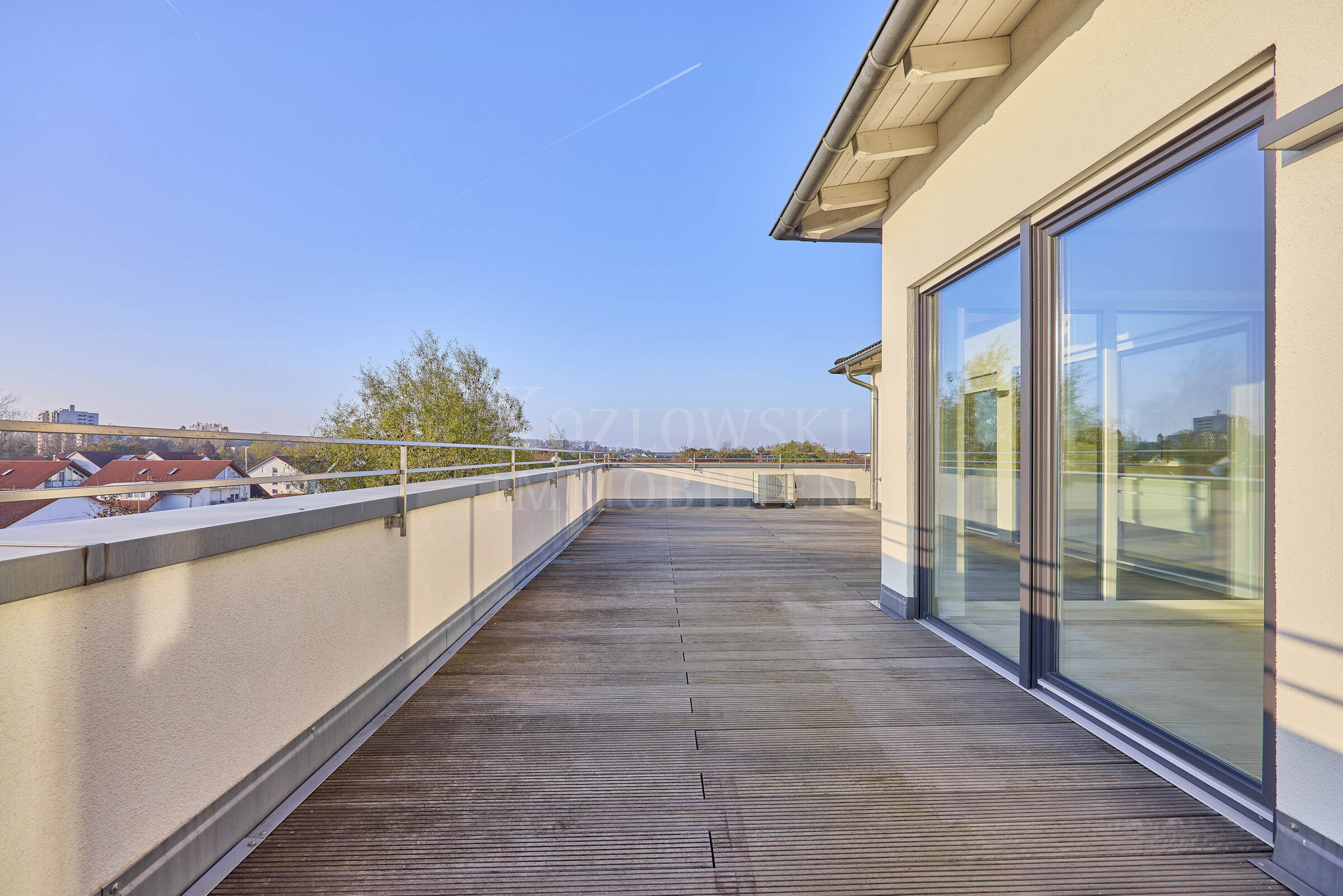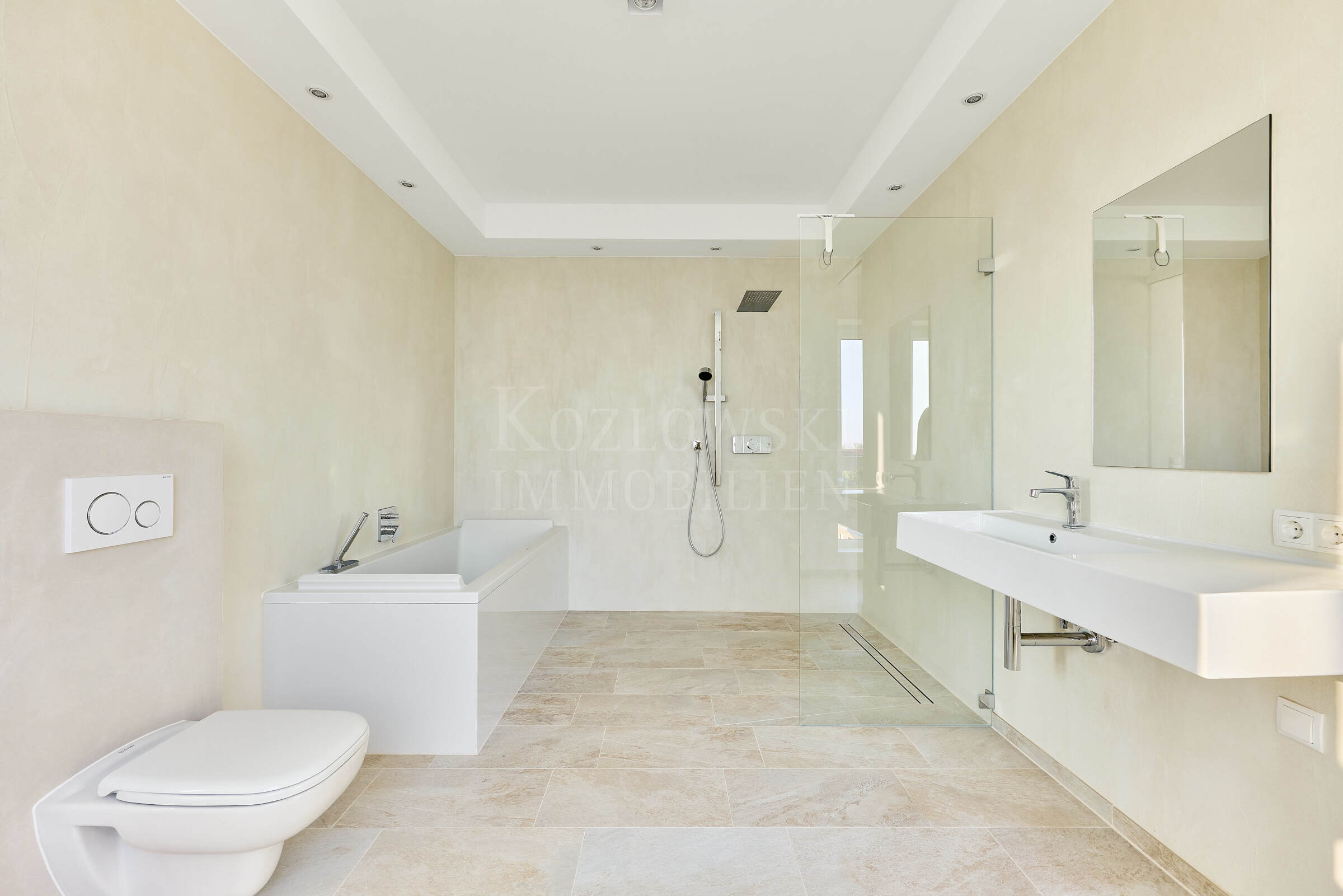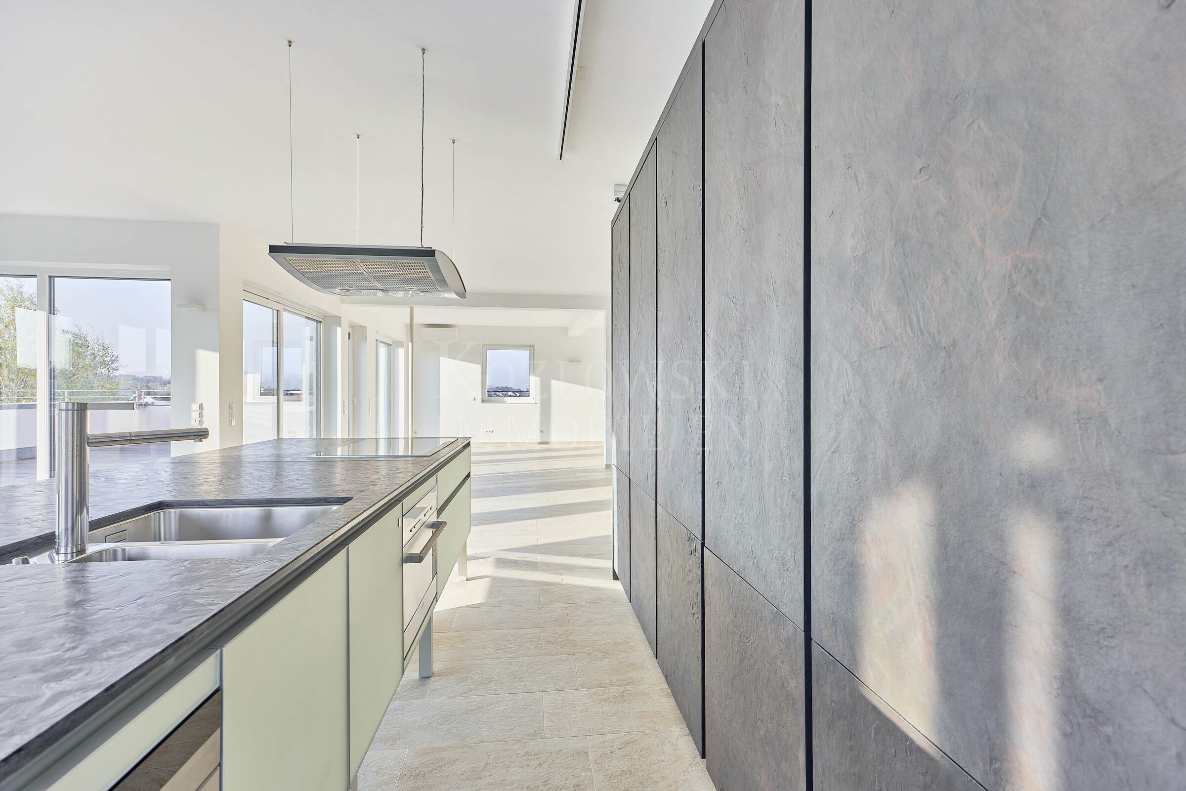 Erbaut im Jahr 2015, überzeugt das klimatisierte Penthouse mit seinem extravagant großzügigen Grundriss, über 2,70 m hohen Decken und einer sehr geschmackvollen und luxuriösen Design-Ausstattung. Der offen gestaltete Wohn-Ess-Küchenbereich mit einer Zeyko-Designküche und modernster Miele-Technik bildet das Herzstück dieser lichtdurchfluteten Wohnung. Der großzügige Master-Bedroom mit begehbarem Kleiderschrank und en suite Masterbad sowie ein stylisches Gäste-WC mit Dusche bieten höchsten Komfort. Das Highlight ist die große, südwestlich ausgerichtete Dachterrasse mit ca. 66 qm, die ganztägig Sonnengenuss ermöglicht. Eine zweite, kleinere Südterrasse lädt ebenfalls zum Entspannen im Freien ein. Durch einfache bauliche Maßnahmen kann ein weiteres Schlafzimmer geschaffen werden.