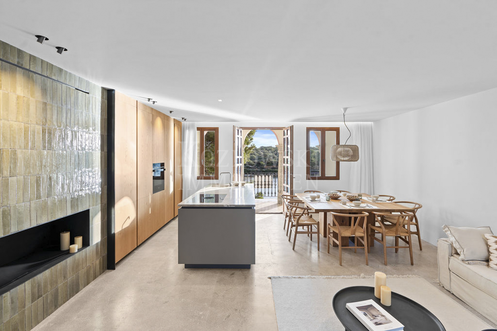 Das Stadthaus verfügt über zwei Zugänge, einen großzügigen Innenhof und eine Raumaufteilung in Split-Level-Bauweise, die optimal an die umliegenden Straßenniveaus angepasst ist. Der Eingangsbereich an der Hafenseite bietet Platz für Fahrräder und führt in den Masterbedroom. Dieser lichtdurchflutete Raum mit hohen Decken umfasst ein Ankleidezimmer, ein großzügiges Masterbad mit Badewanne und Doppeldusche. Er führt zur privaten Terrasse, die in moderner Designsprache gestaltet ist und den Charme eines Atriums widerspiegelt. Ein angrenzender Multifunktionsraum, der auch als weiteres Schlafzimmer genutzt werden kann, sowie ein weiteres Badezimmer mit Dusche vervollständigen diese Ebene. Auf der oberen Ebene, die über die hintere Straße zugänglich ist, befinden sich ein zweiter Eingangsbereich sowie ein weiteres Schlafzimmer mit Doppelbett und En-suite-Bad. Die nächste Ebene beherbergt den offenen Wohnbereich, in dem Küche, Esszimmer und Wohnzimmer mit Kamin harmonisch vereint sind. Der lichtdurchflutete Raum erstreckt sich mit eleganten Arkaden zur Loggia und bietet einen traumhaften Panoramablick.