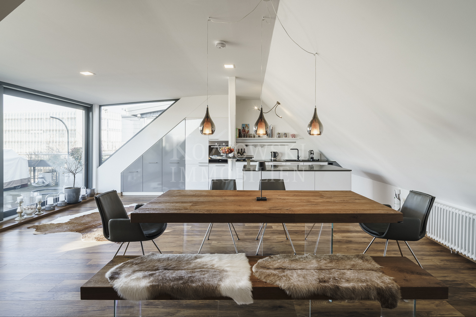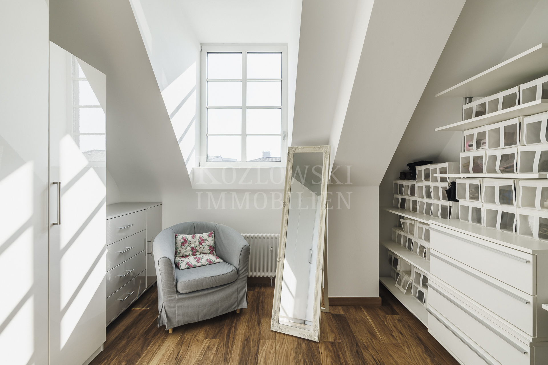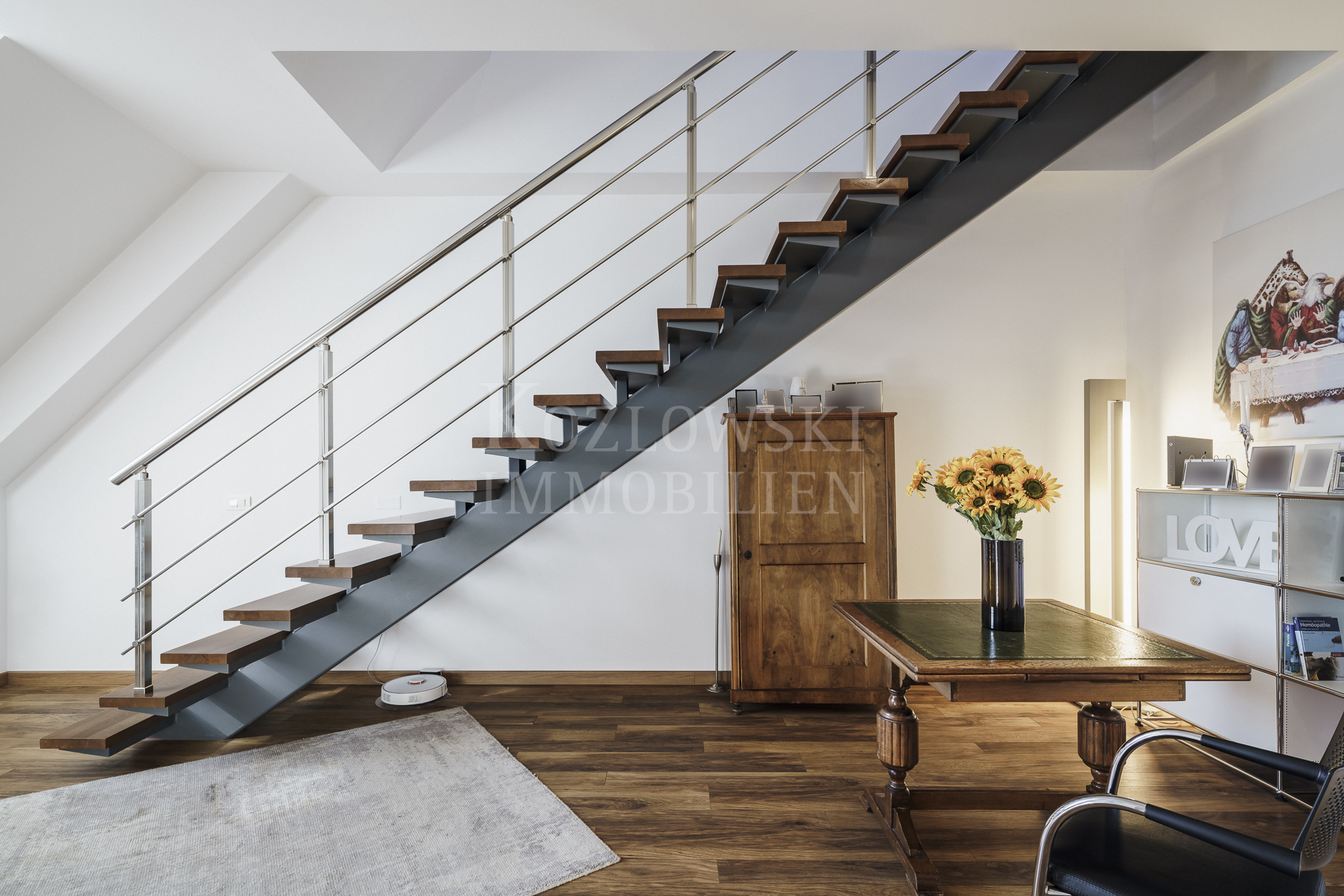 Das Gebäude wurde 1970 von der MVV als Bürogebäude wieder hergestellt, 2016 auf Neubauniveau kernsaniert und in Wohnungen umgewandelt. Sie erreichen die Maisonette durch die historische Hauseingangstür über einen der beiden Aufzüge, die vom Keller bis in das 3. OG fahren. Von der großzügigen Diele mit Garderobe und den Flur erreichen Sie das modernisierte Gäste-Duschbad, das Kinder-/Gäste-Zimmer sowie das Hauptschlafzimmer mit dem gegenüberliegenden ebenso modernisierten Badezimmer mit Duschwanne und Doppelwaschtisch. Am Ende des Flurs gelangen Sie in einen für das Homeoffice idealen Bereich, von dem auch die markante Innentreppe in das Dachstudio führt. Oben überrascht Sie ein großer offener Wohn- und Essbereich mit einer hochwertigen Einbauküche mit Vorrats- und Abstellraum, Küchenblock, Zugang zur sonnigen Dachterrasse sowie eine gemütliche Sitz- und Fernsehecke mit genügend Platz für eine große Sofalandschaft. Panorama- und Dachfenster liefern viel Licht, die vorhandenen Dachstützen eine besondere Wohnatmosphäre.