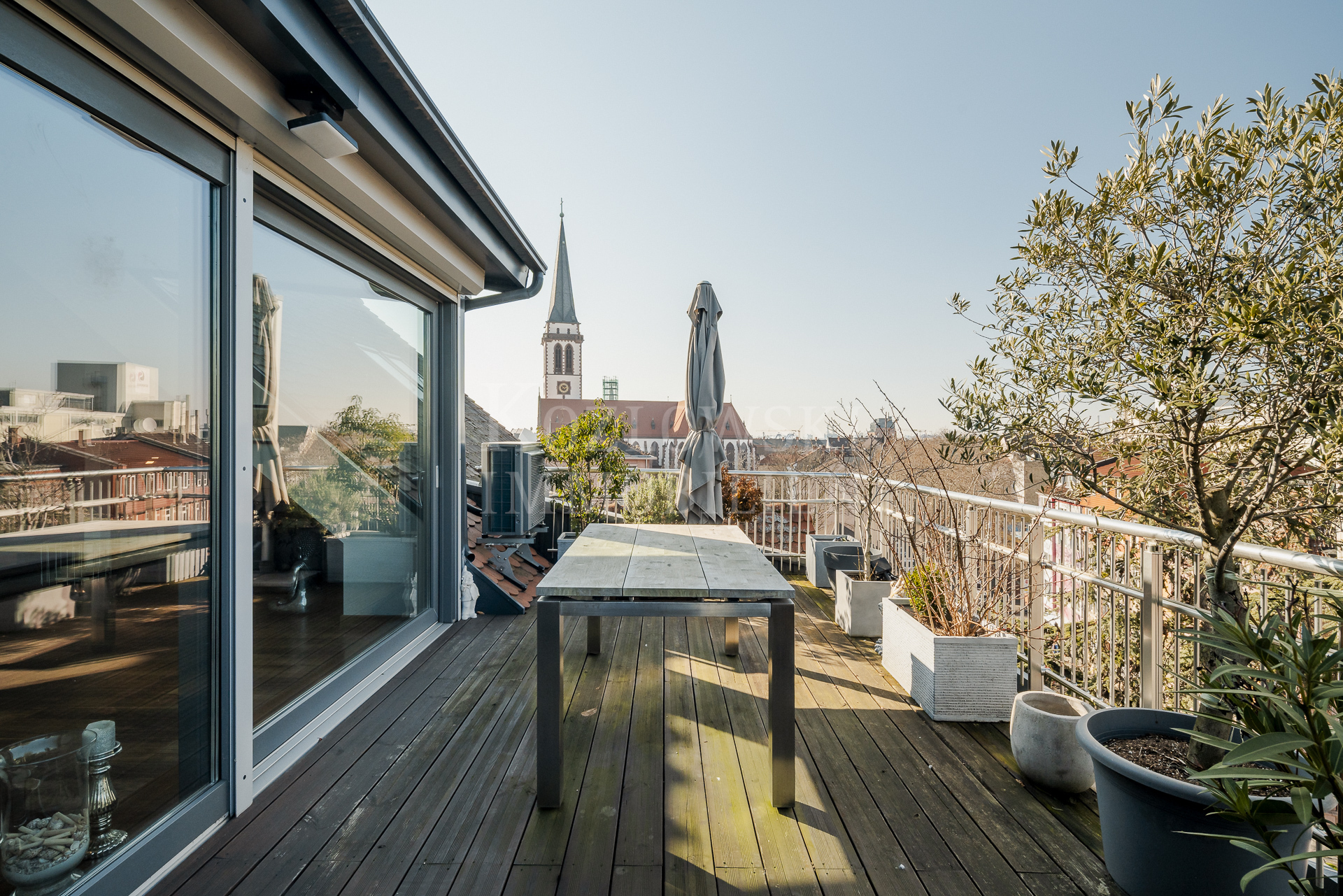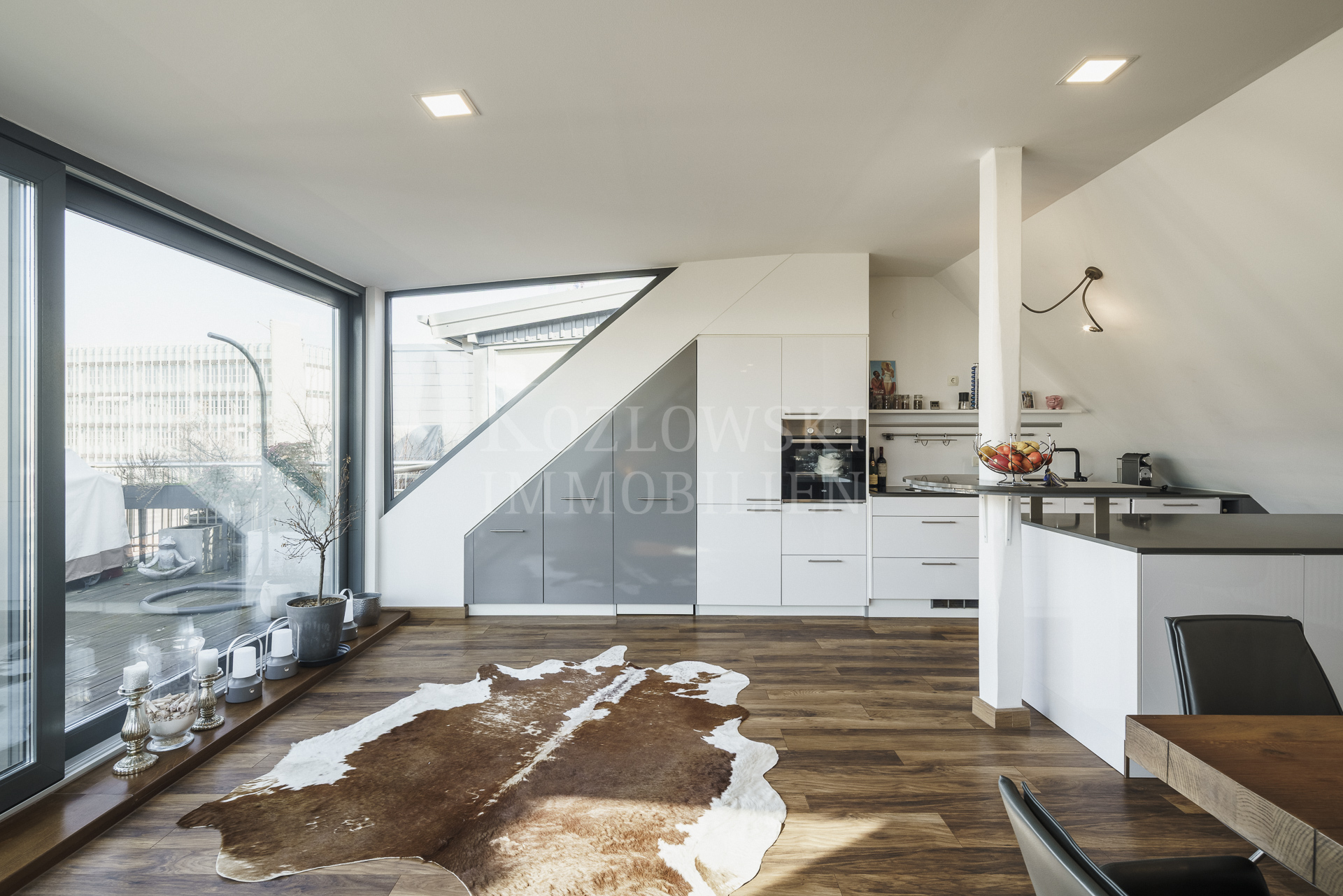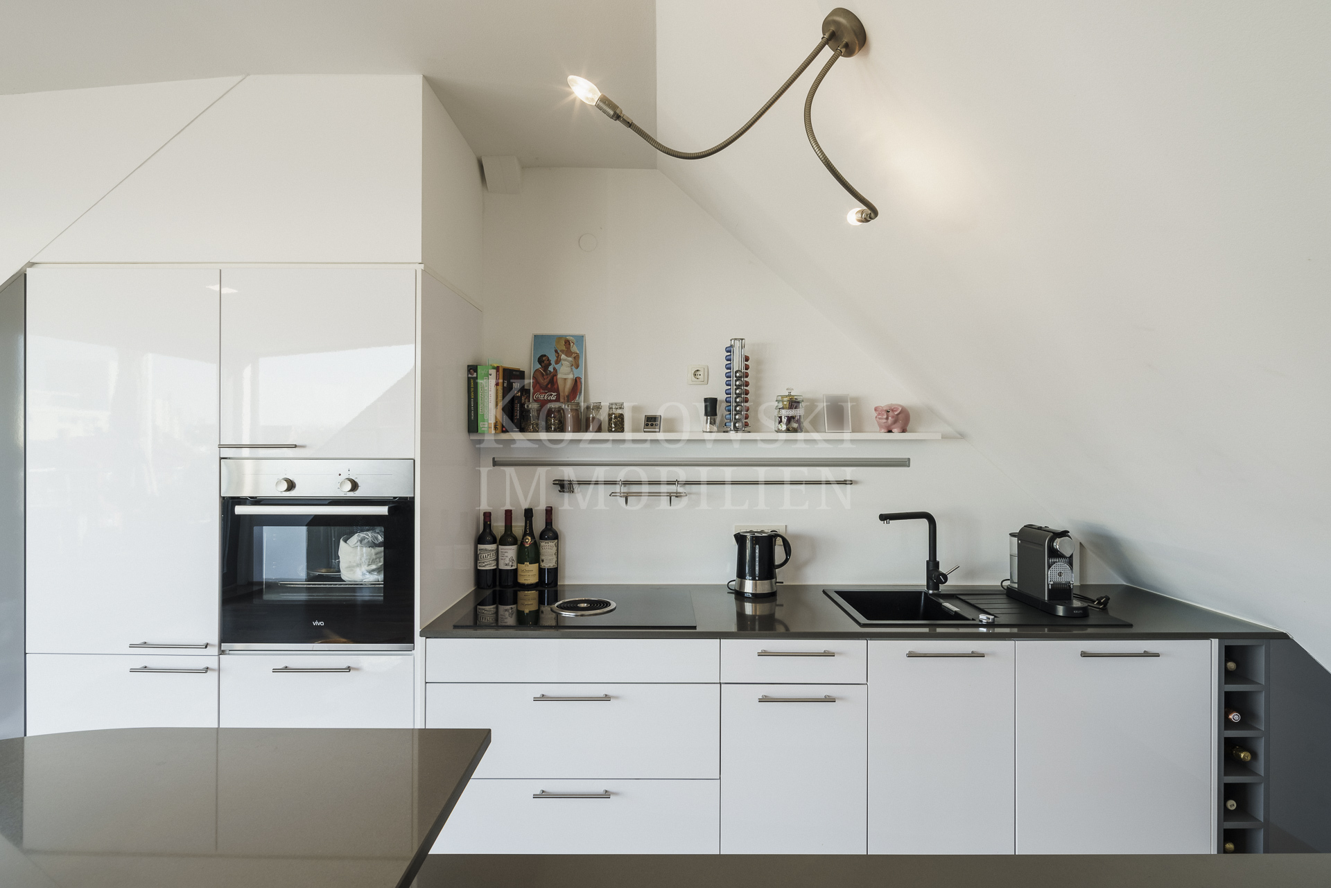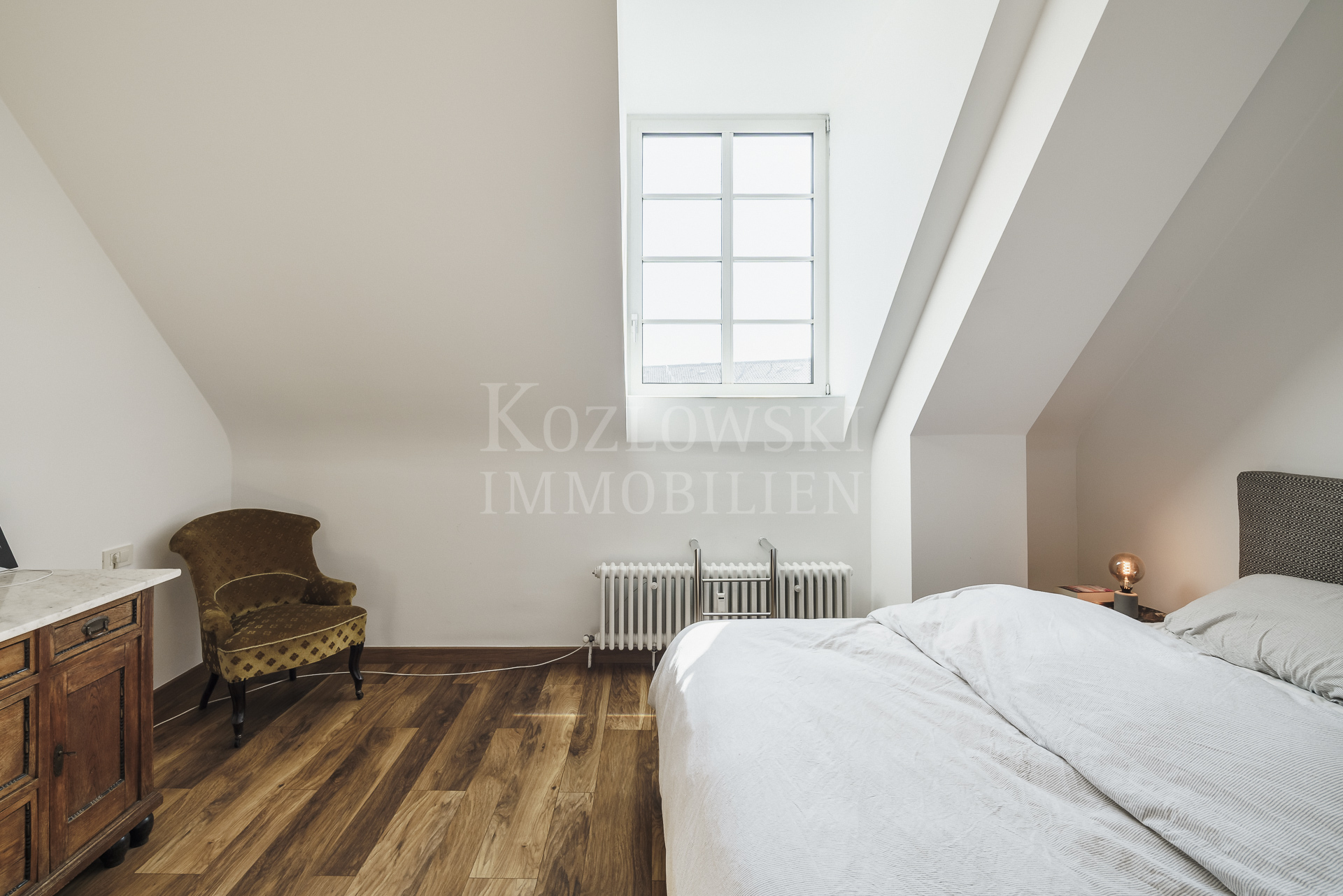 Das Gebäude wurde 1970 von der MVV als Bürogebäude wieder hergestellt, 2016 auf Neubauniveau kernsaniert und in Wohnungen umgewandelt. Sie erreichen die Maisonette durch die historische Hauseingangstür über einen der beiden Aufzüge, die vom Keller bis in das 3. OG fahren. Von der großzügigen Diele mit Garderobe und den Flur erreichen Sie das modernisierte Gäste-Duschbad, das Kinder-/Gäste-Zimmer sowie das Hauptschlafzimmer mit dem gegenüberliegenden ebenso modernisierten Badezimmer mit Duschwanne und Doppelwaschtisch. Am Ende des Flurs gelangen Sie in einen für das Homeoffice idealen Bereich, von dem auch die markante Innentreppe in das Dachstudio führt. Oben überrascht Sie ein großer offener Wohn- und Essbereich mit einer hochwertigen Einbauküche mit Vorrats- und Abstellraum, Küchenblock, Zugang zur sonnigen Dachterrasse sowie eine gemütliche Sitz- und Fernsehecke mit genügend Platz für eine große Sofalandschaft. Panorama- und Dachfenster liefern viel Licht, die vorhandenen Dachstützen eine besondere Wohnatmosphäre.