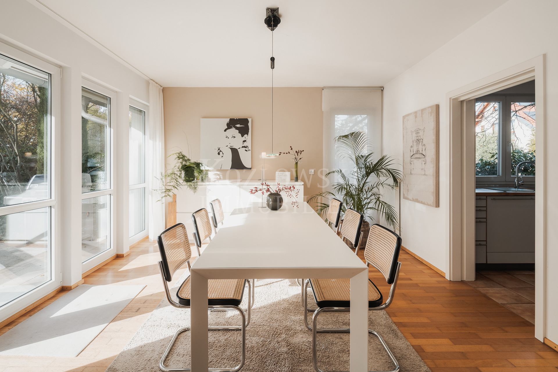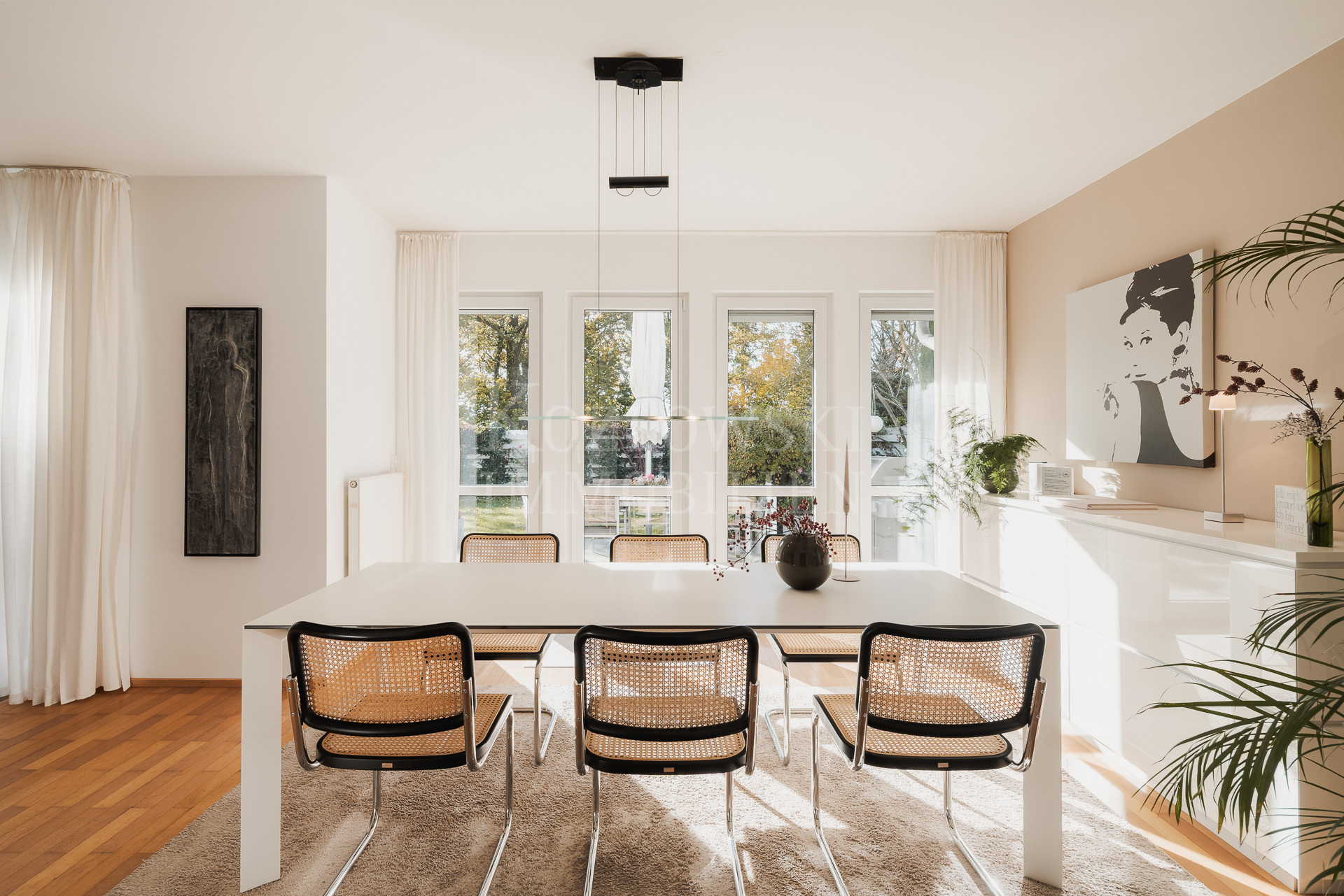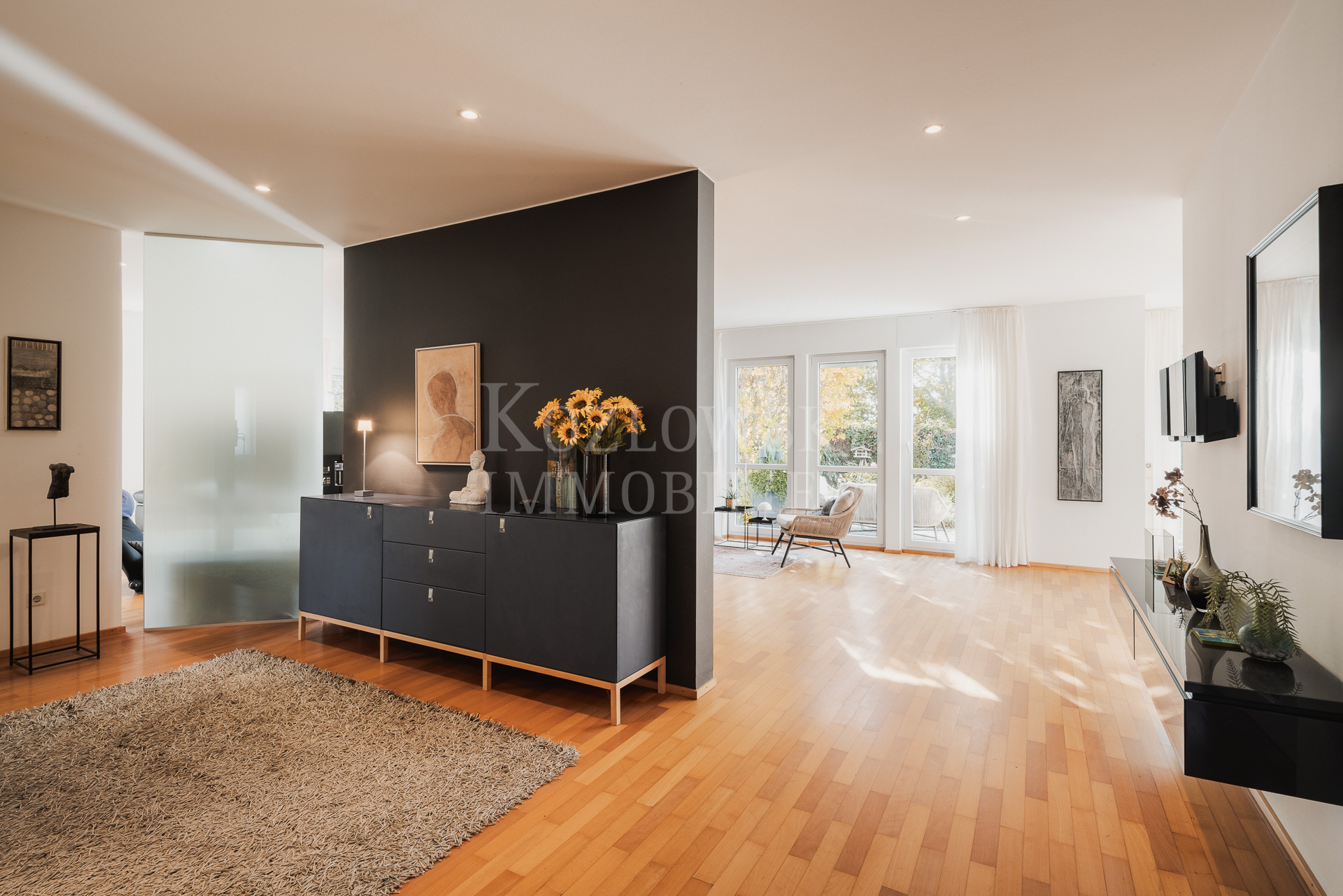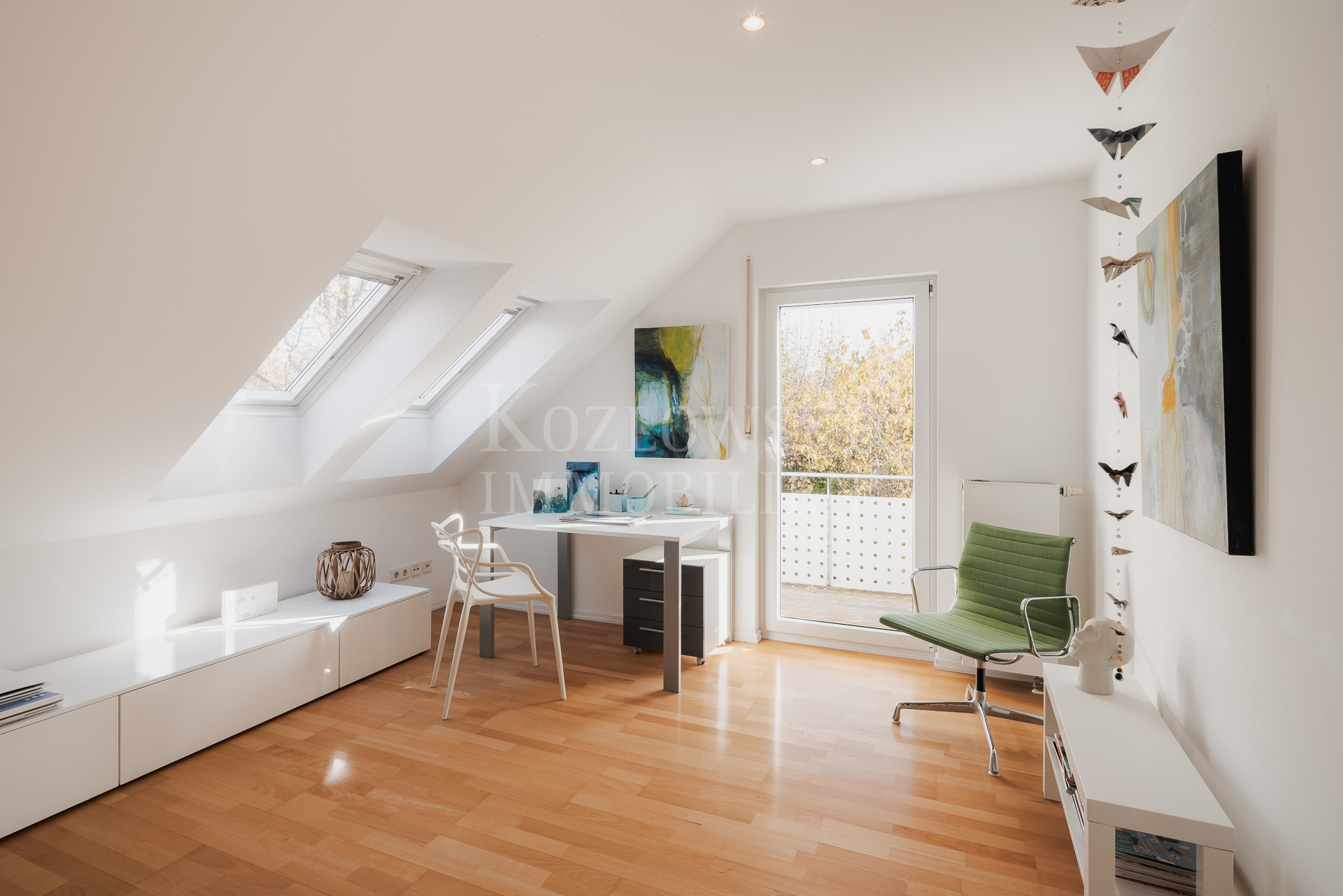 Insgesamt stehen 7,5 Zimmer, ein großzügiges Masterbad sowie zwei weitere moderne Duschbäder zur Verfügung. Mittelpunkt des Erdgeschosses ist der großzügige, bodentief verglaste Wohn- und Essbereich mit rund 65 qm, der einen direkten Zugang zur Sonnenterrasse und zum rund 350 qm großen und herrlichen Sonnengarten bietet. Die funktional-orientierte Einbauküche und praktischer Raumausnutzung grenzt direkt an den Essbereich an. Ergänzt wird diese Ebene durch ein Arbeitszimmer, ein separiert gelegenes Gäste-WC sowie einen geräumigen Hausarbeitsraum. Eine stilvolle Innentreppe führt in das Dachgeschoss, das Sie mit einem zentralen Flur empfängt. Von hier erschließen sich sämtliche Räume dieser Ebene: das nach Süden orientierte, von drei bodentiefen Dachflächenfenstern lichtdurchflutete Atelierzimmer, drei Schlafzimmer – zwei davon mit Balkon – ein großzügiges Masterbad sowie ein weiteres Duschbad.