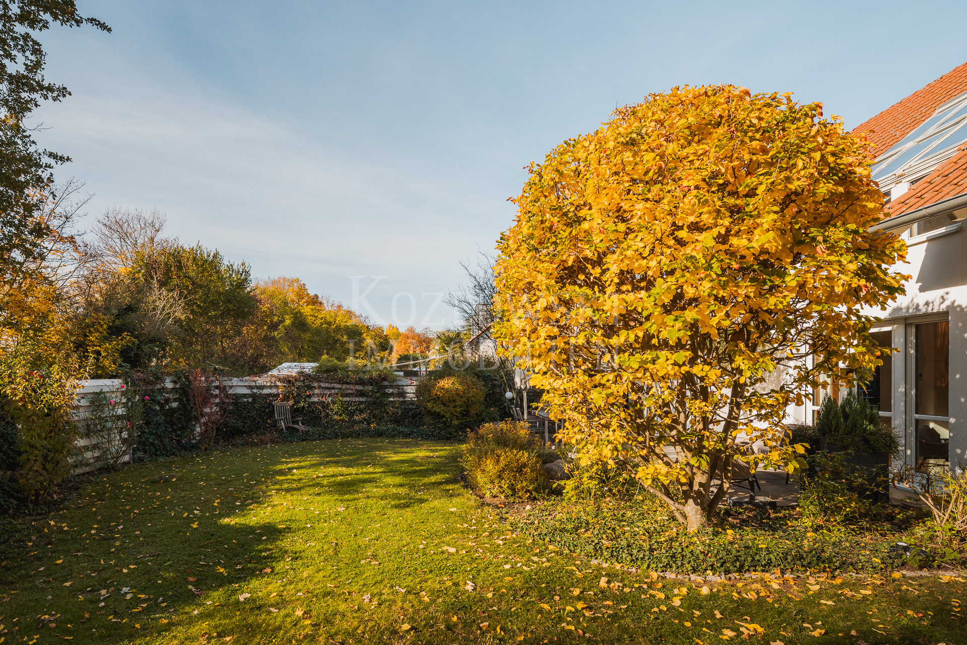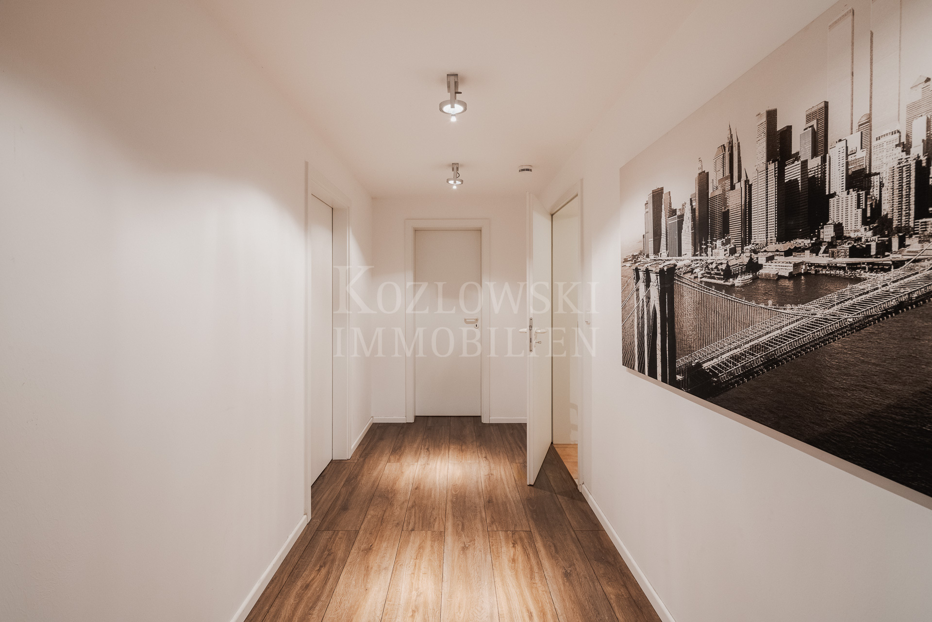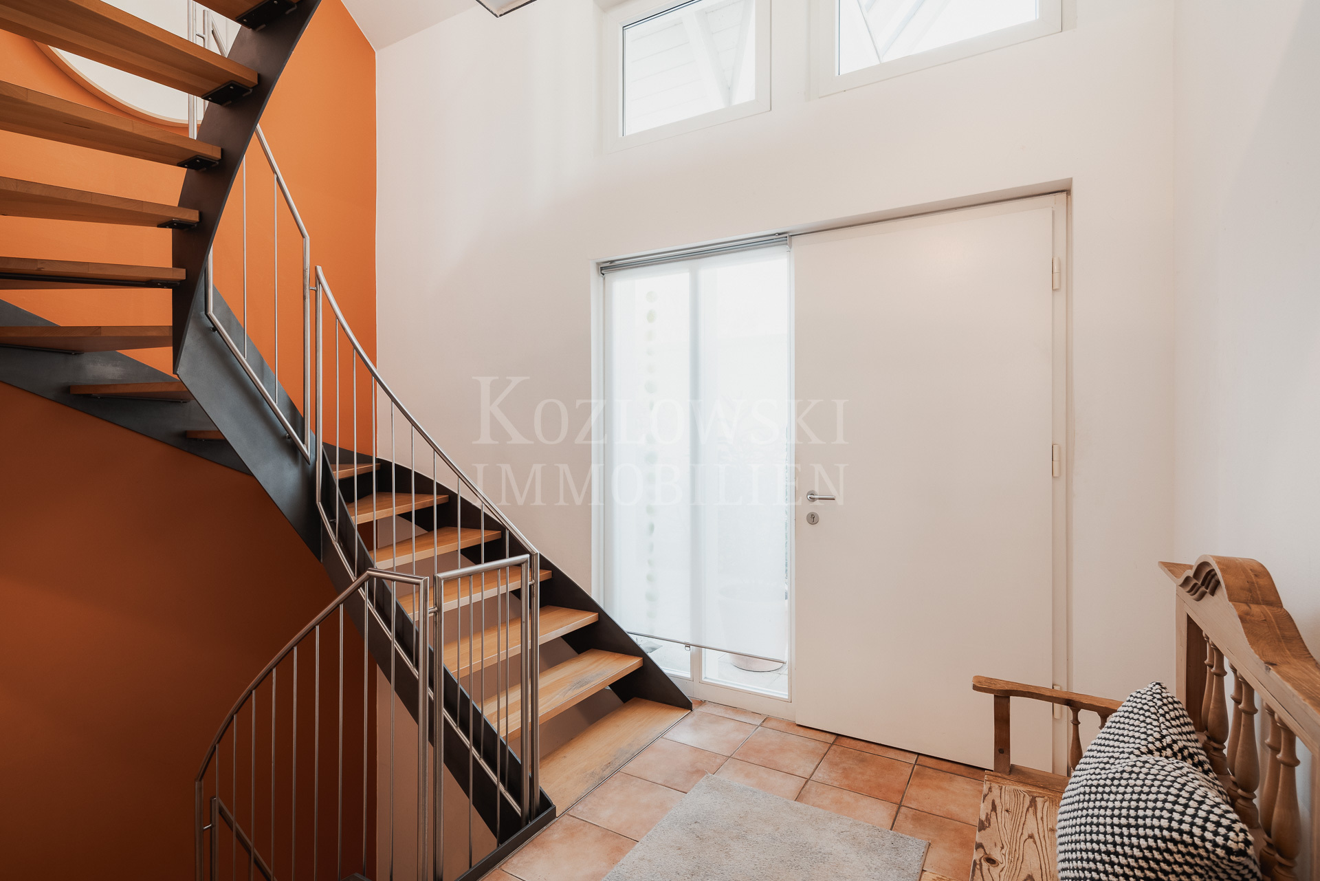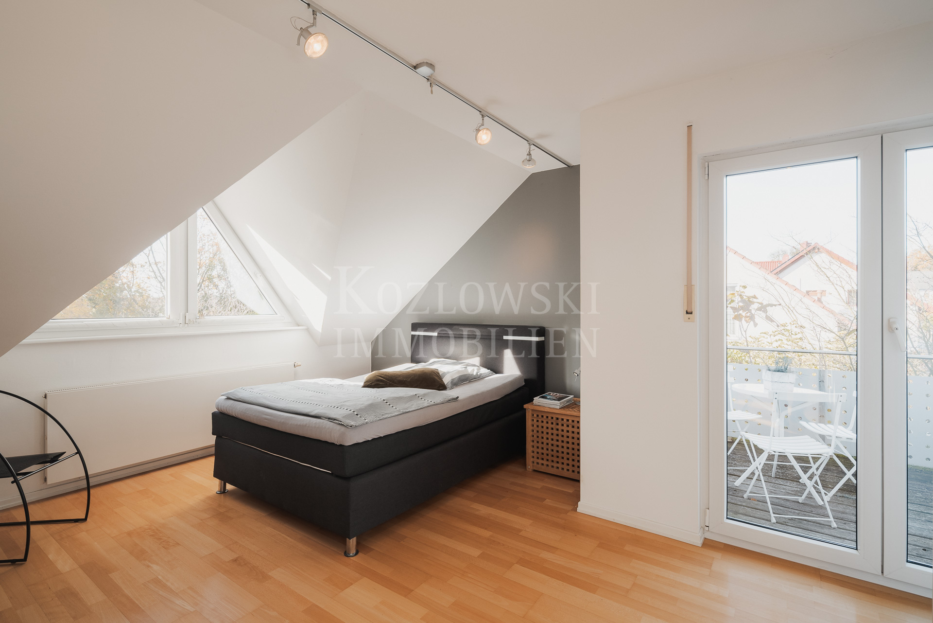 Insgesamt stehen 7,5 Zimmer, ein großzügiges Masterbad sowie zwei weitere moderne Duschbäder zur Verfügung. Mittelpunkt des Erdgeschosses ist der großzügige, bodentief verglaste Wohn- und Essbereich mit rund 65 qm, der einen direkten Zugang zur Sonnenterrasse und zum rund 350 qm großen und herrlichen Sonnengarten bietet. Die funktional-orientierte Einbauküche und praktischer Raumausnutzung grenzt direkt an den Essbereich an. Ergänzt wird diese Ebene durch ein Arbeitszimmer, ein separiert gelegenes Gäste-WC sowie einen geräumigen Hausarbeitsraum. Eine stilvolle Innentreppe führt in das Dachgeschoss, das Sie mit einem zentralen Flur empfängt. Von hier erschließen sich sämtliche Räume dieser Ebene: das nach Süden orientierte, von drei bodentiefen Dachflächenfenstern lichtdurchflutete Atelierzimmer, drei Schlafzimmer – zwei davon mit Balkon – ein großzügiges Masterbad sowie ein weiteres Duschbad.