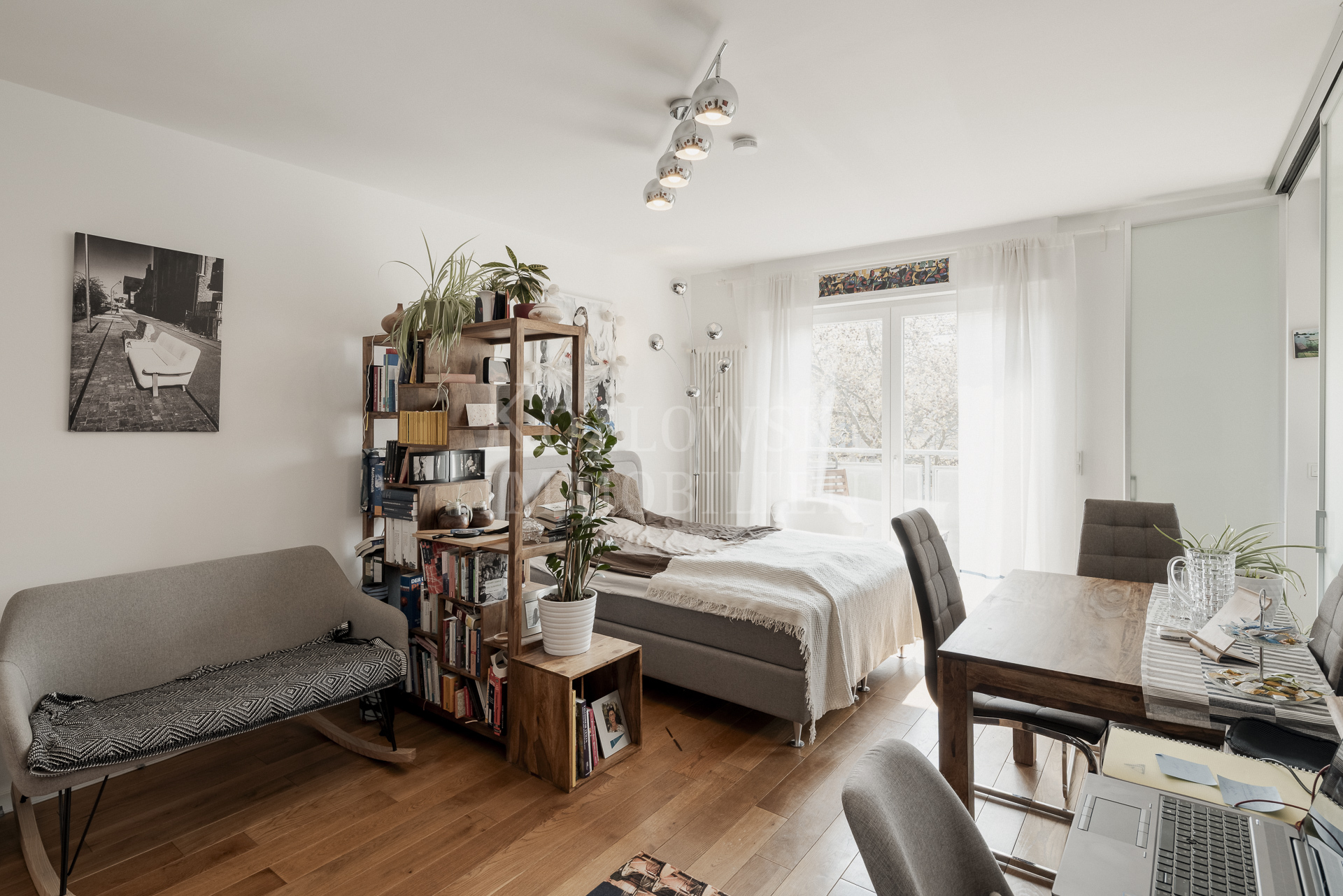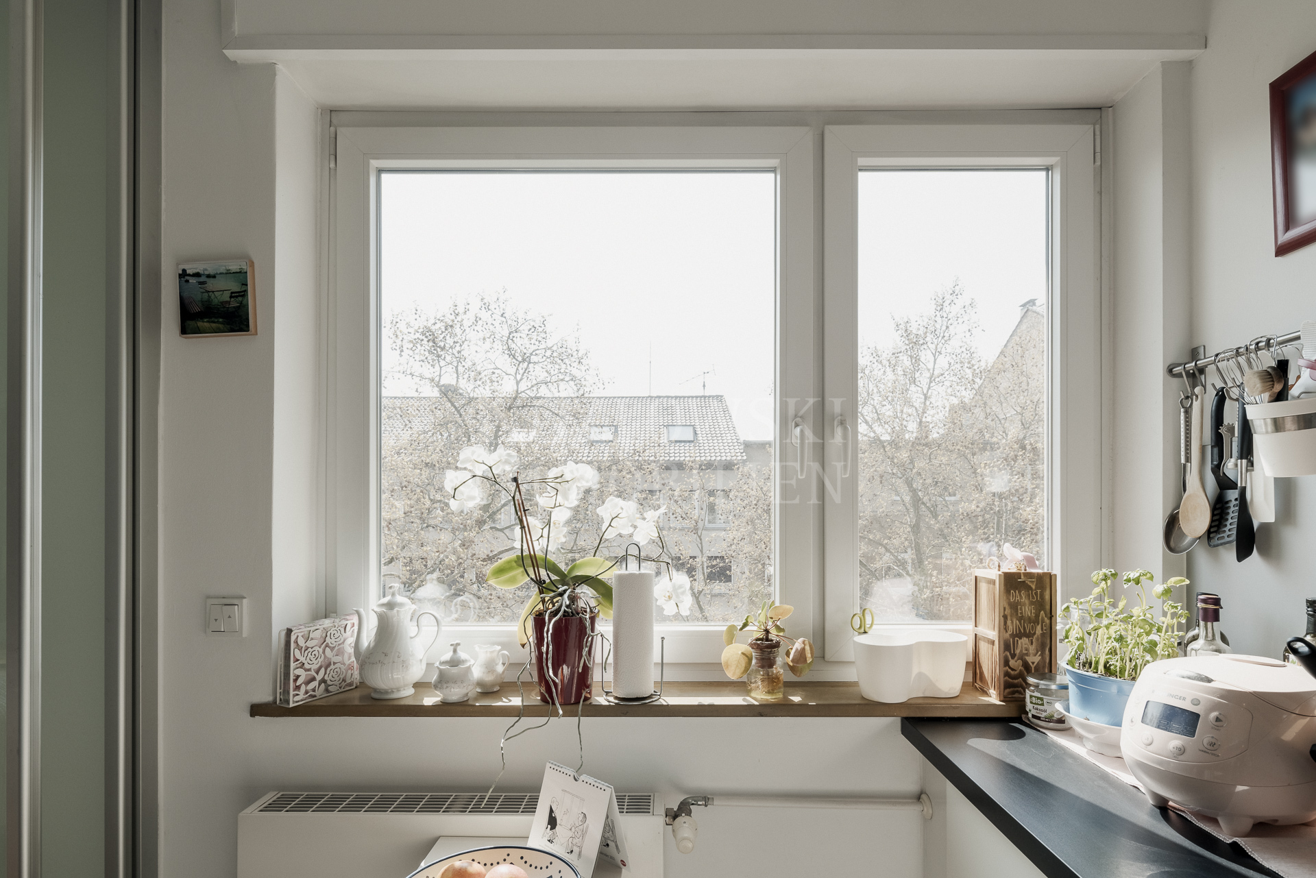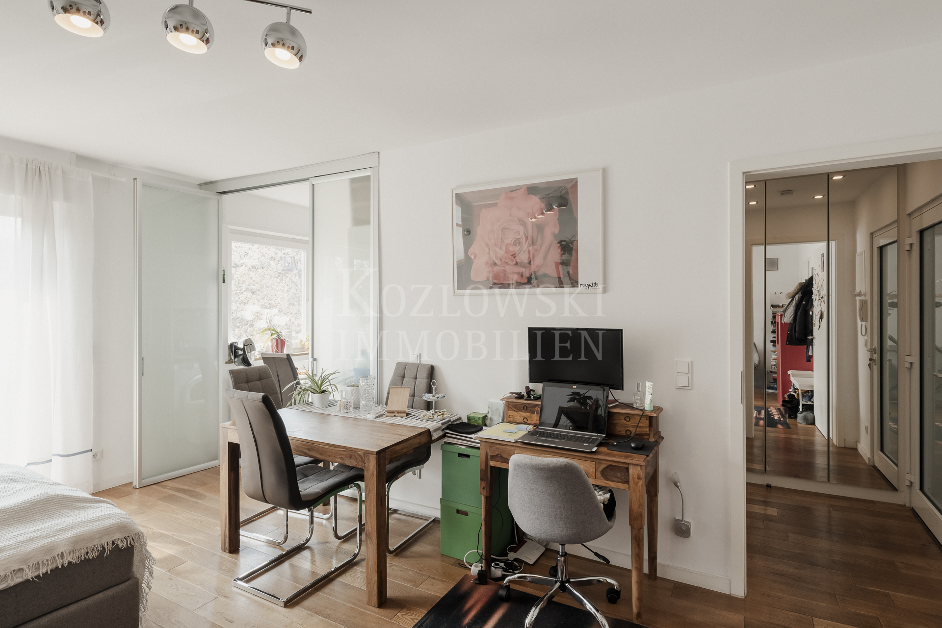 Insgesamt erwarten Sie hier ein stylisches Duschbad mit Oberlicht, ein großzügiger Wohn- und Schlafbereich mit Sonnenbalkon sowie eine mit einem neuen Schiebeelement abgetrennte Einbauküche. Das geölte Massiv-Eichendielenparkett veredelt die durchaus hochwertige Einrichtung. Im Eingangsbereich existiert ein Spiegeleinbauschrank, im Wohn-Schlafzimmer befindet sich zusätzlich noch ein praktischer Abstellraum. Sämtliche Fenster sind mit elektrischen Rollläden ausgestattet. Abgerundet wird die Wohnung durch den dazugehörigen Kellerraum.
