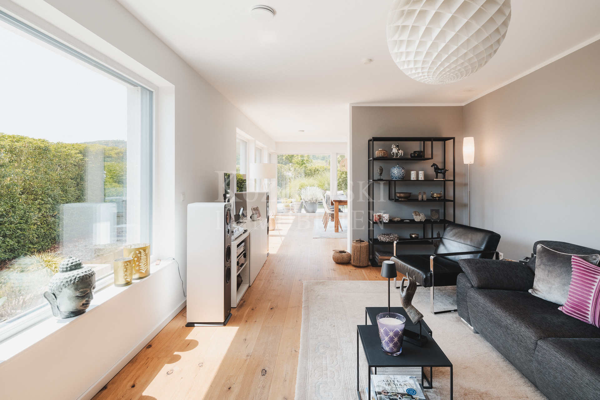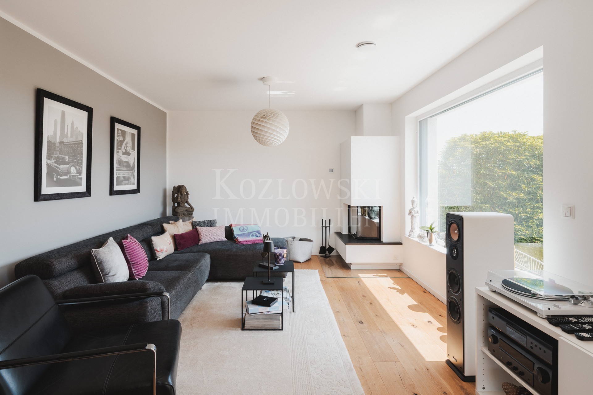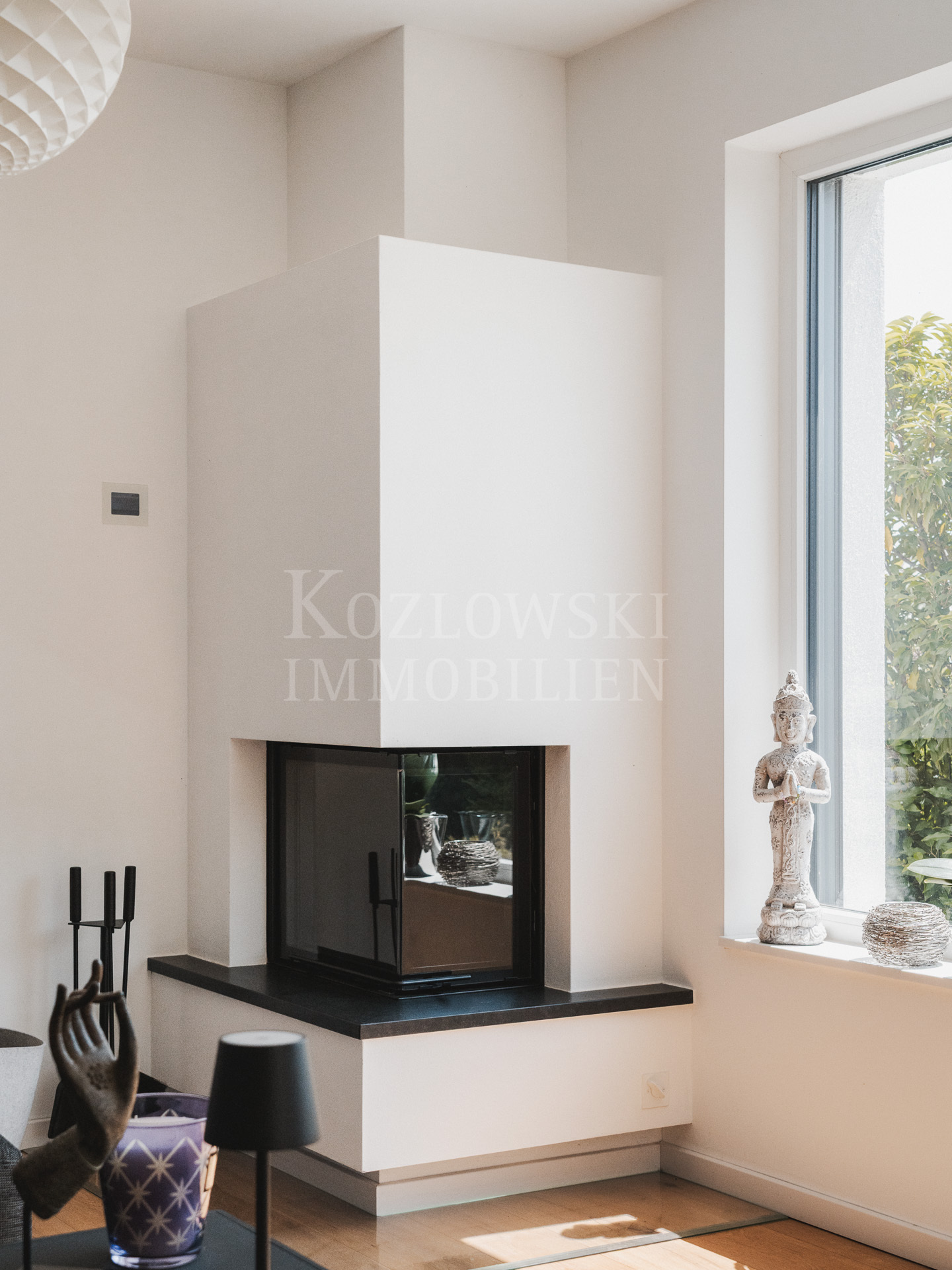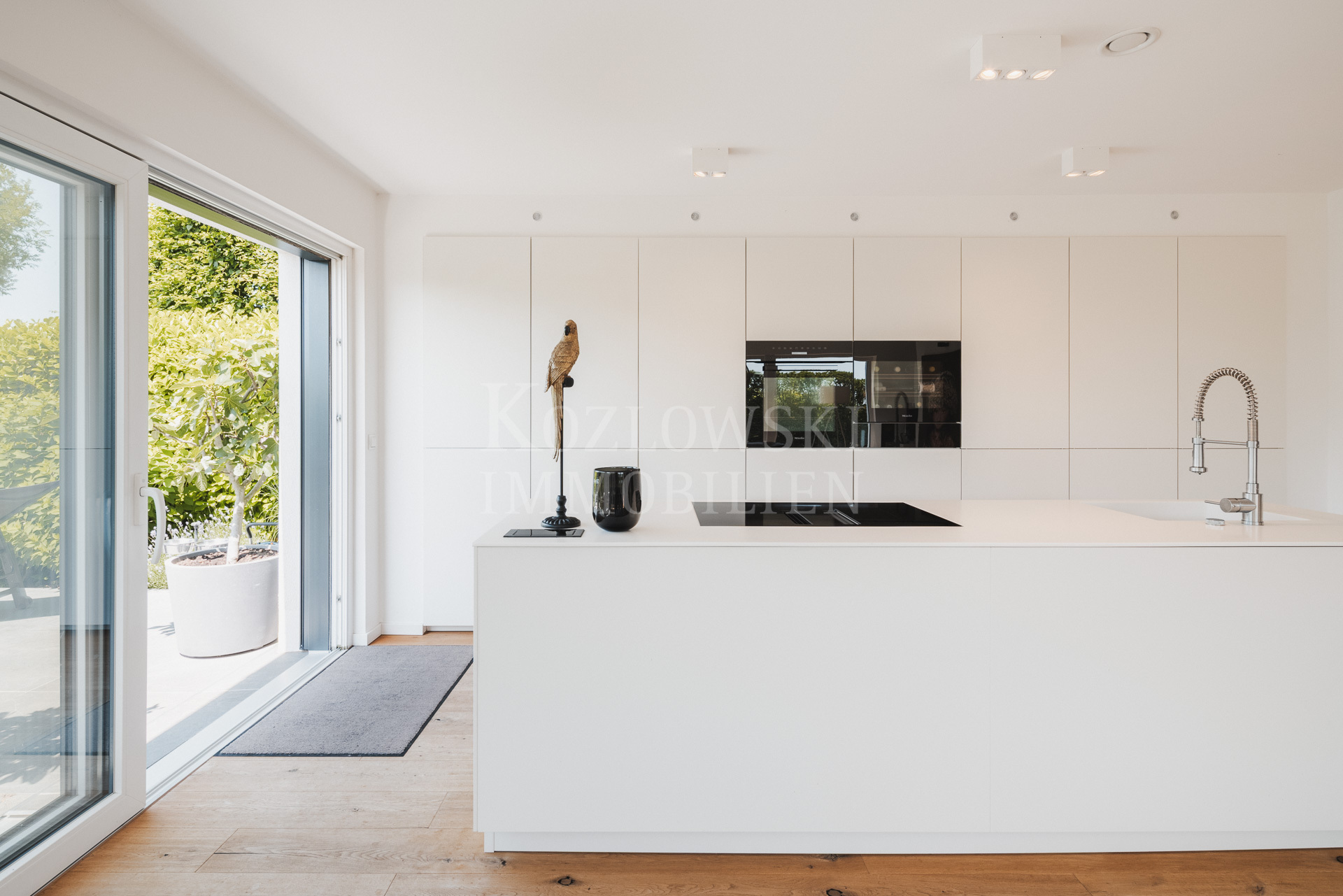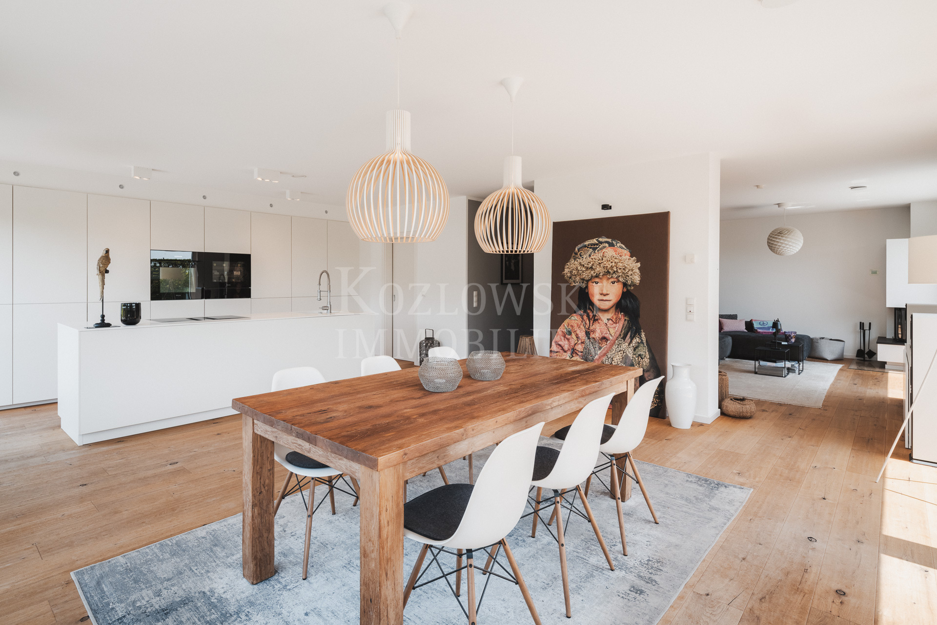 Das Herzstück des Hauses ist der offen gestaltete Wohn-, Ess- und Kochbereich mit etwa 60 qm. Eine hochwertige Designküche mit Kochinsel, ein eleganter Kamin und bodentiefe Fenster schaffen eine helle, einladende Atmosphäre. Der direkte Zugang zur Sonnenterrasse und zum liebevoll angelegten Garten erweitert den Wohnraum ins Freie. Highlight ist der große Naturwasserpool, umgeben von Lavendel, Limelights und Olivenbäumen. Abends sorgt die stimmungsvolle Beleuchtung bei einem guten Glas Wein für besondere Momente mit Familie und Freunden.