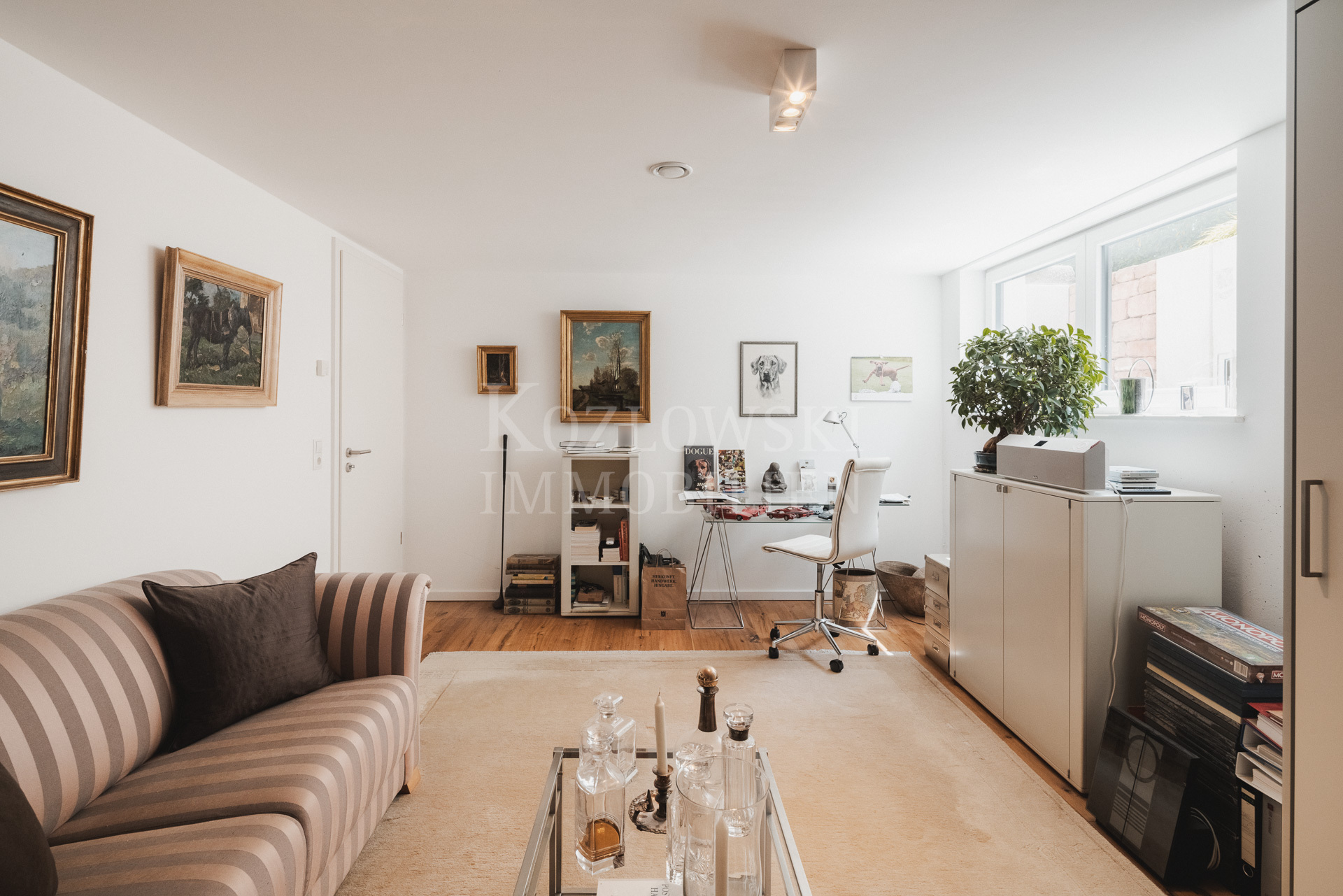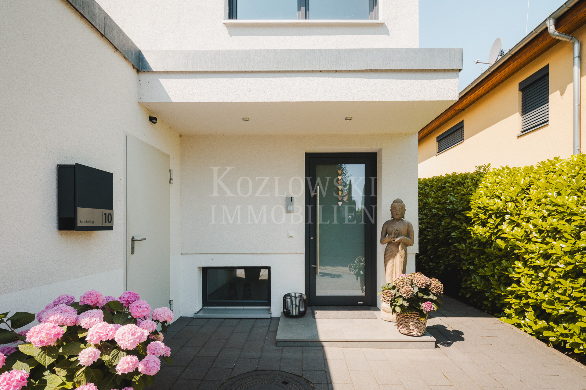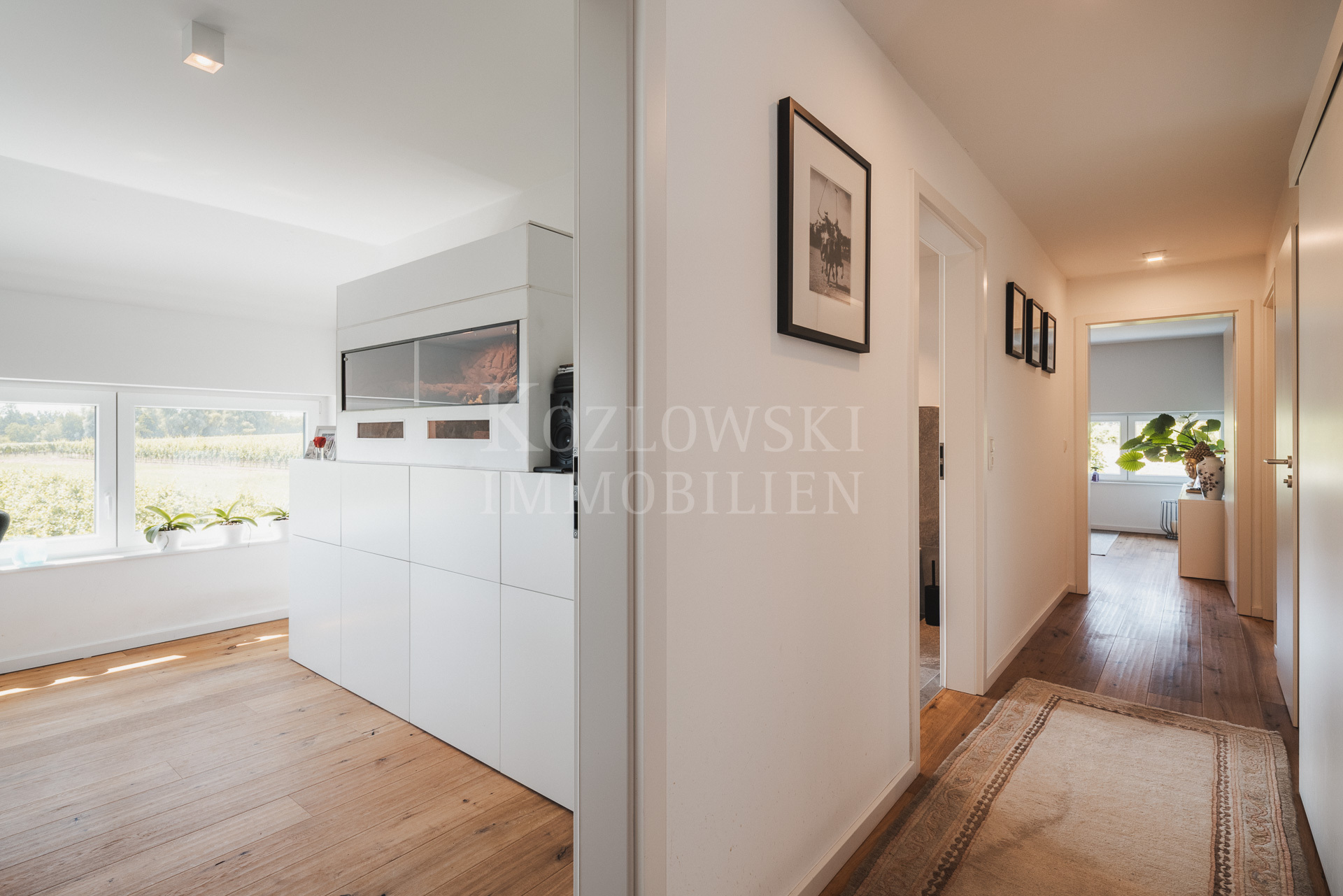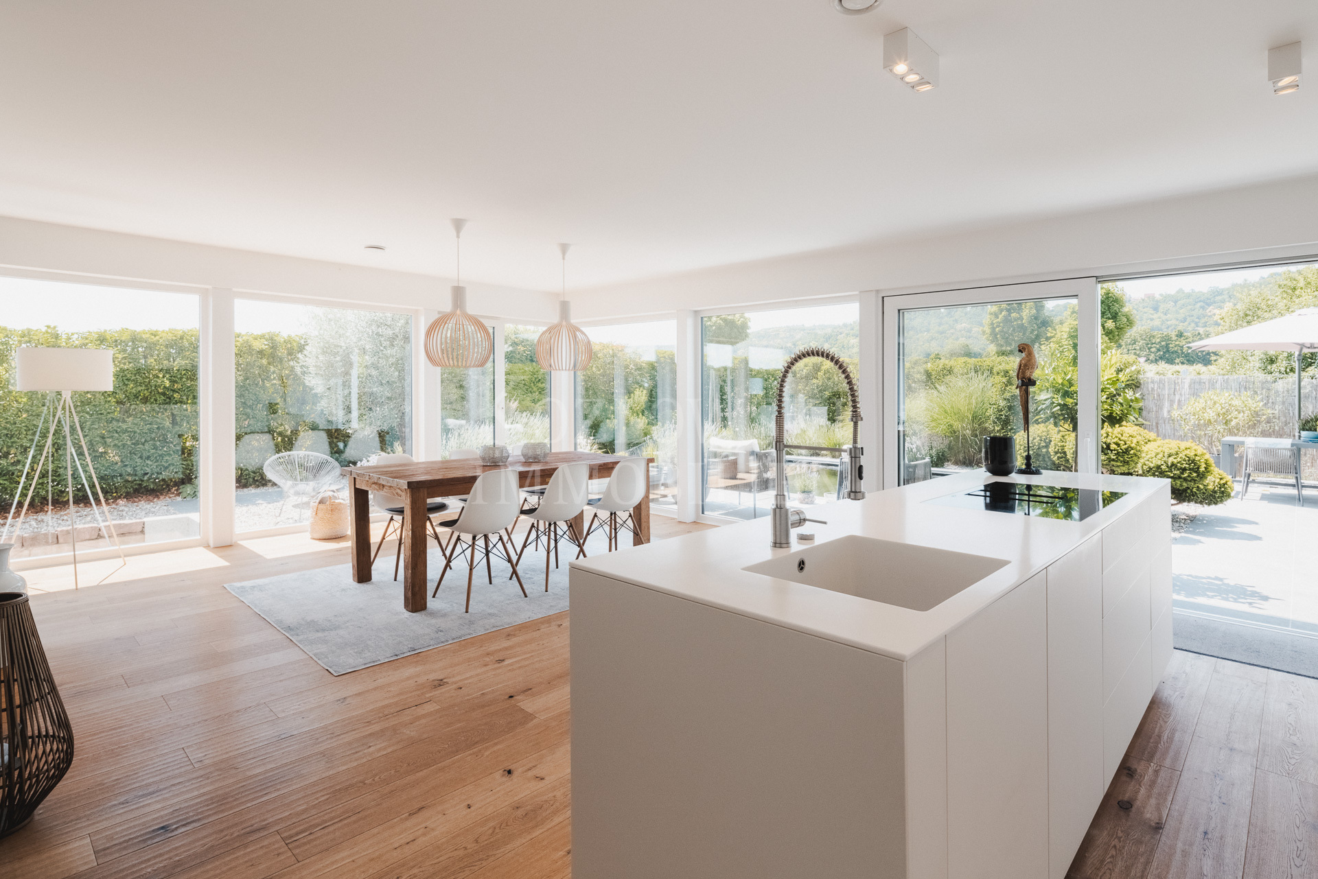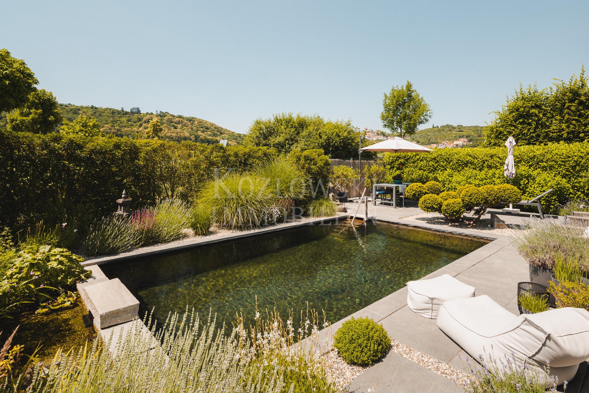 Das Herzstück des Hauses ist der offen gestaltete Wohn-, Ess- und Kochbereich mit etwa 60 qm. Eine hochwertige Designküche mit Kochinsel, ein eleganter Kamin und bodentiefe Fenster schaffen eine helle, einladende Atmosphäre. Der direkte Zugang zur Sonnenterrasse und zum liebevoll angelegten Garten erweitert den Wohnraum ins Freie. Highlight ist der große Naturwasserpool, umgeben von Lavendel, Limelights und Olivenbäumen. Abends sorgt die stimmungsvolle Beleuchtung bei einem guten Glas Wein für besondere Momente mit Familie und Freunden.