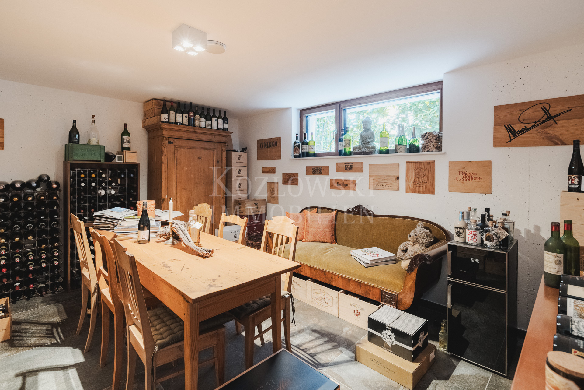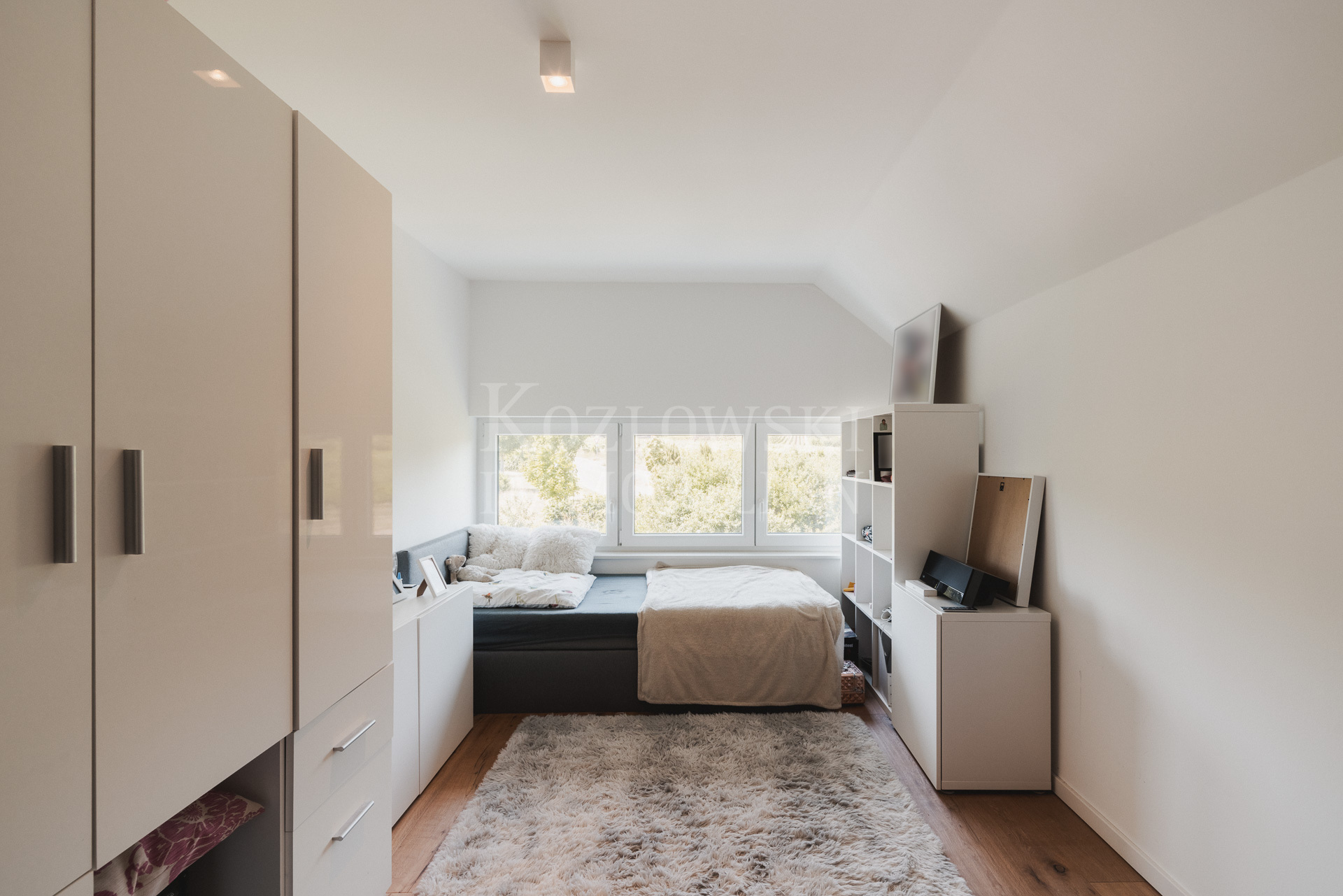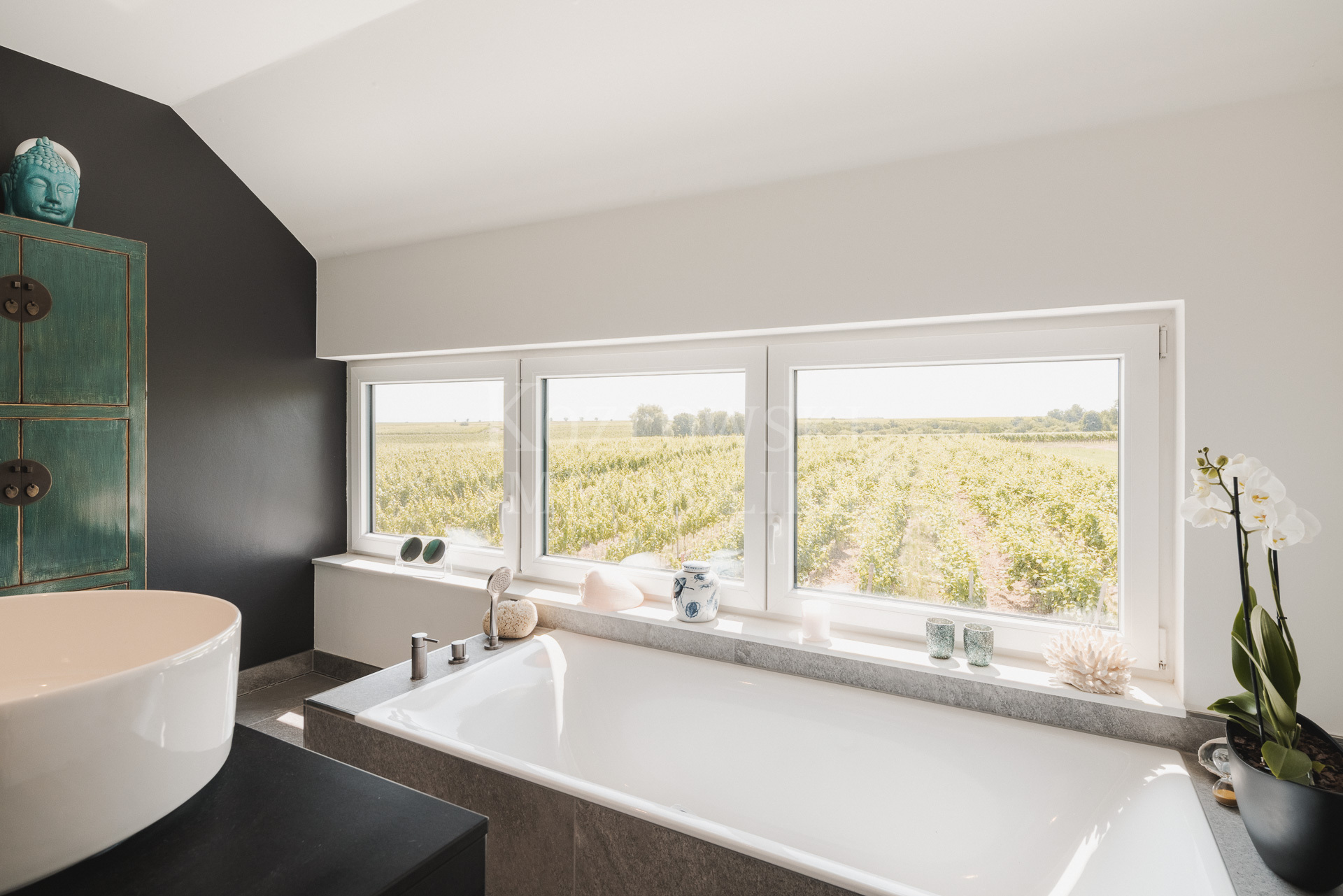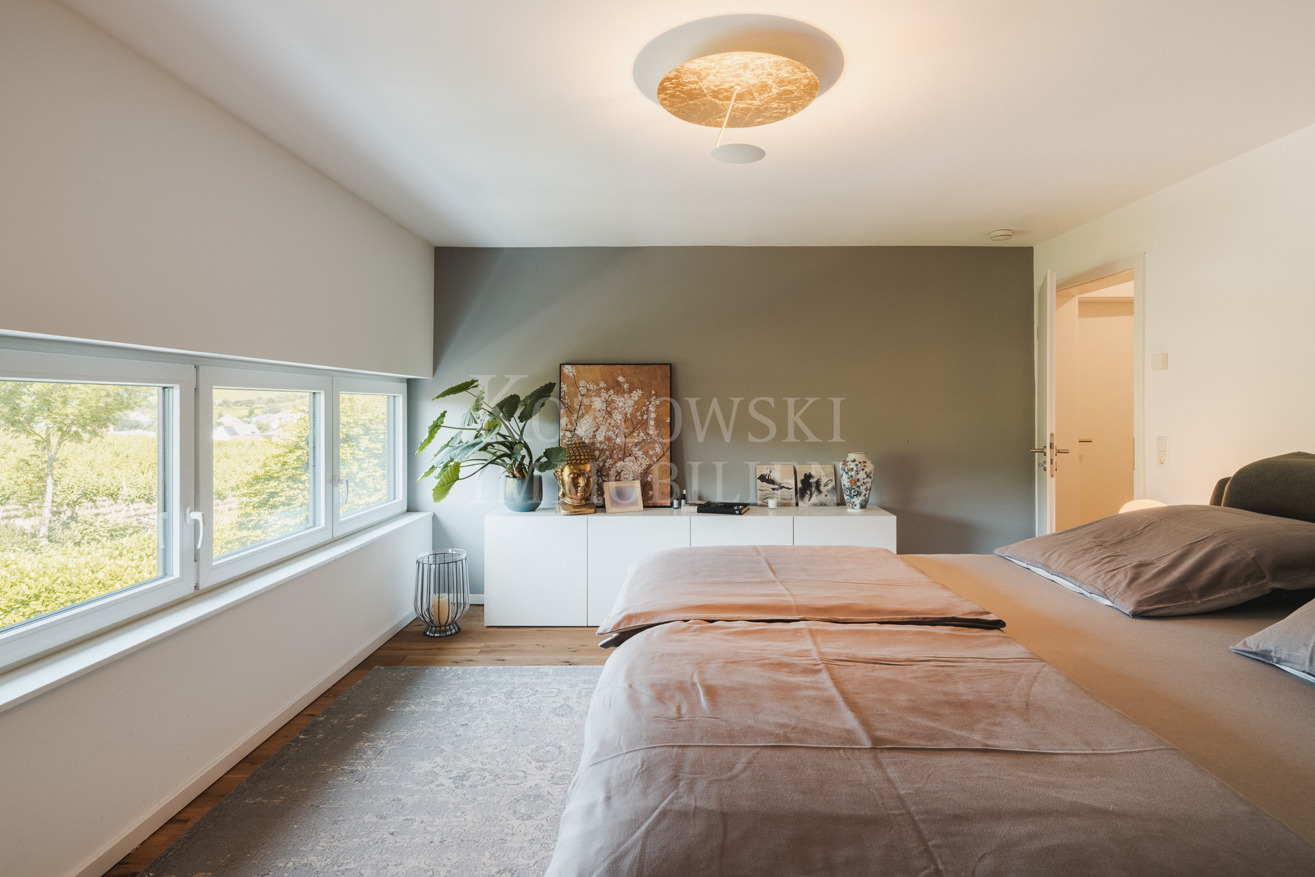 Im Dachgeschoss befinden sich drei helle Zimmer, ideal nutzbar als Schlaf-, Kinder- oder Arbeitszimmer, sowie ein hochwertiges Masterbad mit Walk-in-Dusche, Badewanne und herrlichem Ausblick in die Weinberge. Ein weiteres Duschbad und ein Ankleidebereich vervollständigen diese Ebene. Das komplett unterkellerte Haus bietet im Untergeschoss drei vielseitig nutzbare Räume – beispielsweise für Homeoffice, Gäste oder Hobby – sowie einen Hauswirtschaftsraum mit modernster Haustechnik.