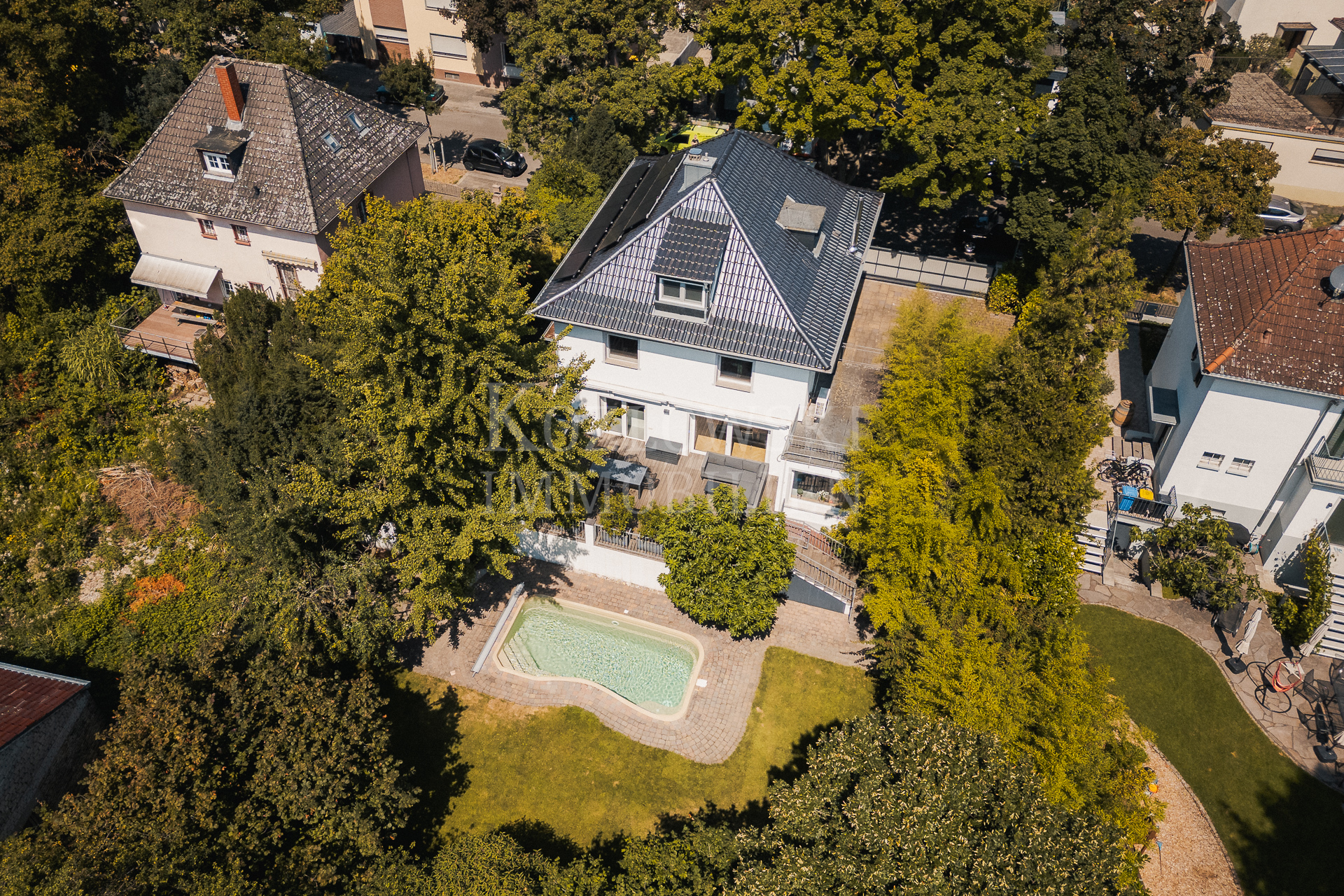 Mit einer großzügigen Wohnfläche von ca. 232 qm, verteilt auf drei Ebenen (EG, OG, DG), erwartet Sie ein Wohnkonzept mit 10 Zimmern voller Licht, Raum und Lebensqualität. Bereits beim Betreten der Villa beeindruckt der offene Wohn- und Essbereich mit seiner breiten, bodentiefen Fensterfront. Von hier aus gelangen Sie auf die großzügige Sonnenterrasse mit integrierter Außenküche sowie in den herrlich angelegten, fast uneinsehbaren Südost-Garten mit Swimmingpool und weitläufiger Grünfläche, ideal für familienfreundliches Wohnen mit hohem Erholungswert. Die moderne, offene Einbauküche mit Kochinsel überzeugt durch stilvolles Design und hohe Funktionalität. Das Erdgeschoss bietet zudem zwei flexibel nutzbare Räume, ideal als Kinderzimmer, Gästezimmer oder Homeoffice, sowie ein separates Gäste-WC.
