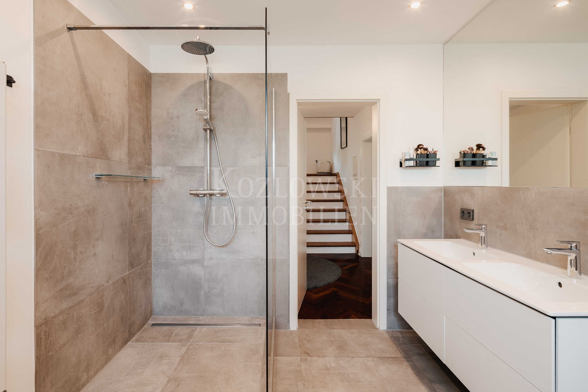 Im Obergeschoss befinden sich die lichterfüllten Privaträume: ein großzügiges Masterbad, ein begehbares Ankleidezimmer (auch als zusätzliches Schlafzimmer nutzbar) sowie drei weitere Schlafzimmer, eines davon mit Zugang zur Dachterrasse mit herrlichem Gartenblick. Über die stilvoll aufgearbeitete Holztreppe erreichen Sie das Dachgeschoss, das zwei weitere Zimmer sowie ein zusätzliches Badezimmer beherbergt.
