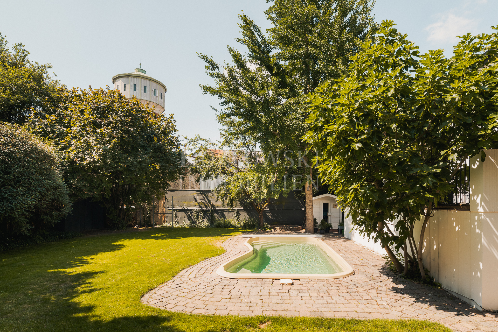 • Uneinsehbarer Süd-Ost-Garten mit Swimmingpool (5 m x 7 m), Außendusche, Außensauna und großer Rasenfläche