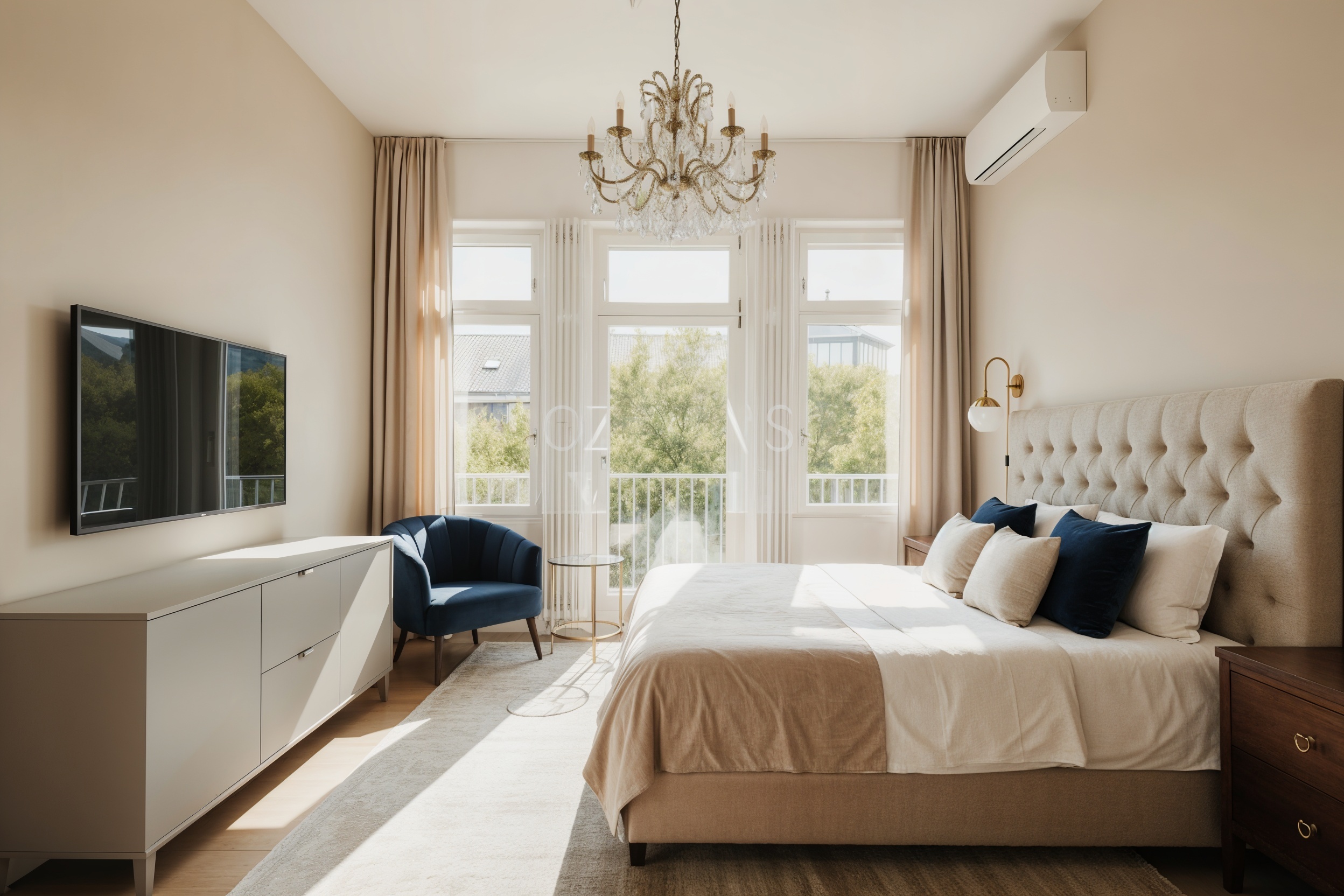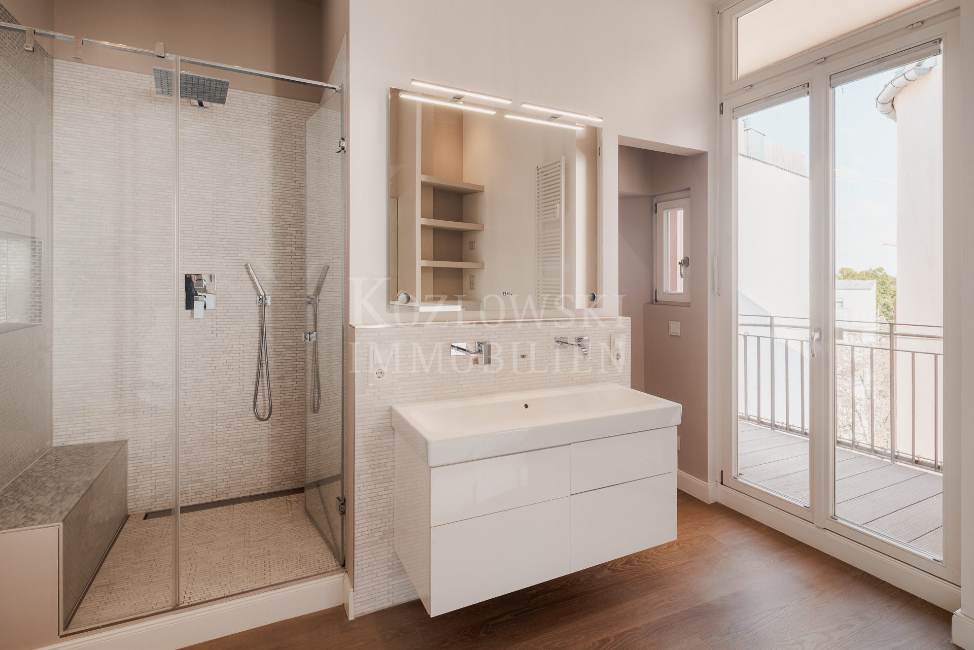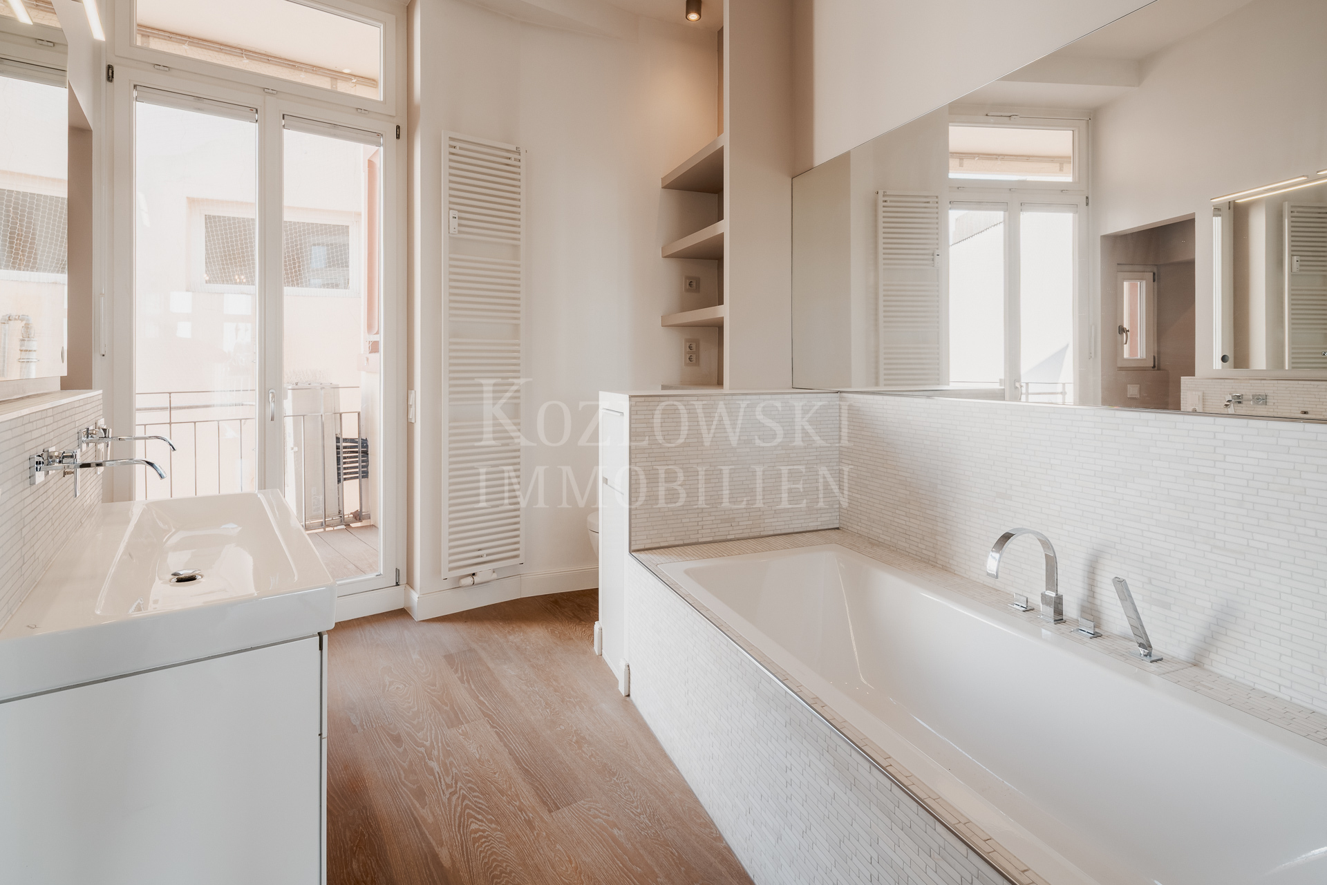 Im hinteren Bereich der Wohnung, zum ruhigen Innenhof ausgerichtet, befinden sich ein weiteres Schlafzimmer mit eigener Balkon-Lounge sowie ein geschmackvolles Tageslicht-Masterbad mit großer Dusche, Badewanne und Zugang auf den Balkon. Dieses exklusive City-Domizil vereint erstklassigen Wohnkomfort mit urbanem Lebensgefühl in Traumlage. Lichtdurchflutete Altbau-Räumlichkeiten, anspruchsvolles, zeitloses Design und ein unvergleichlicher Ausblick schaffen ein Zuhause auf höchstem Niveau – ideal für alle Generationen.