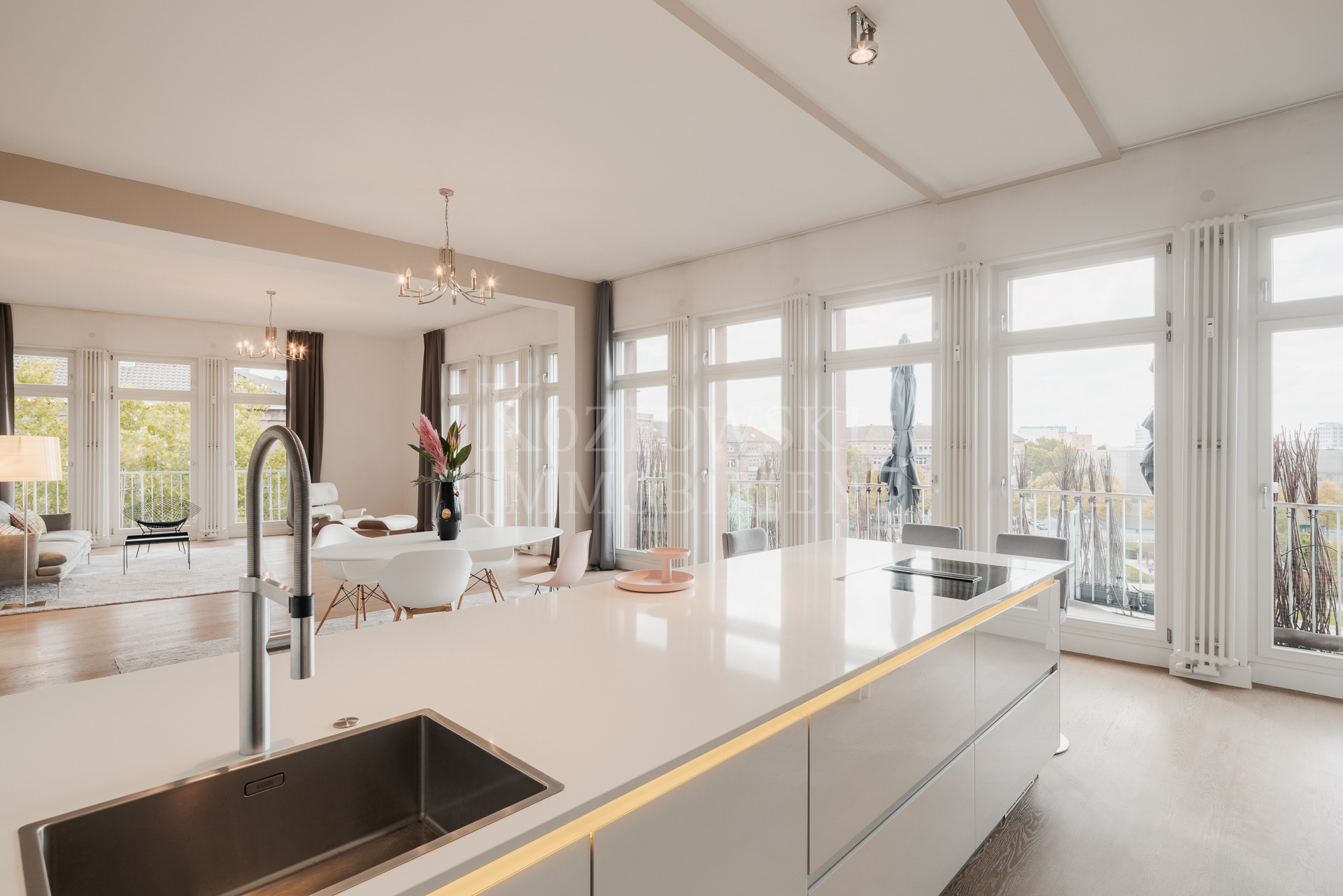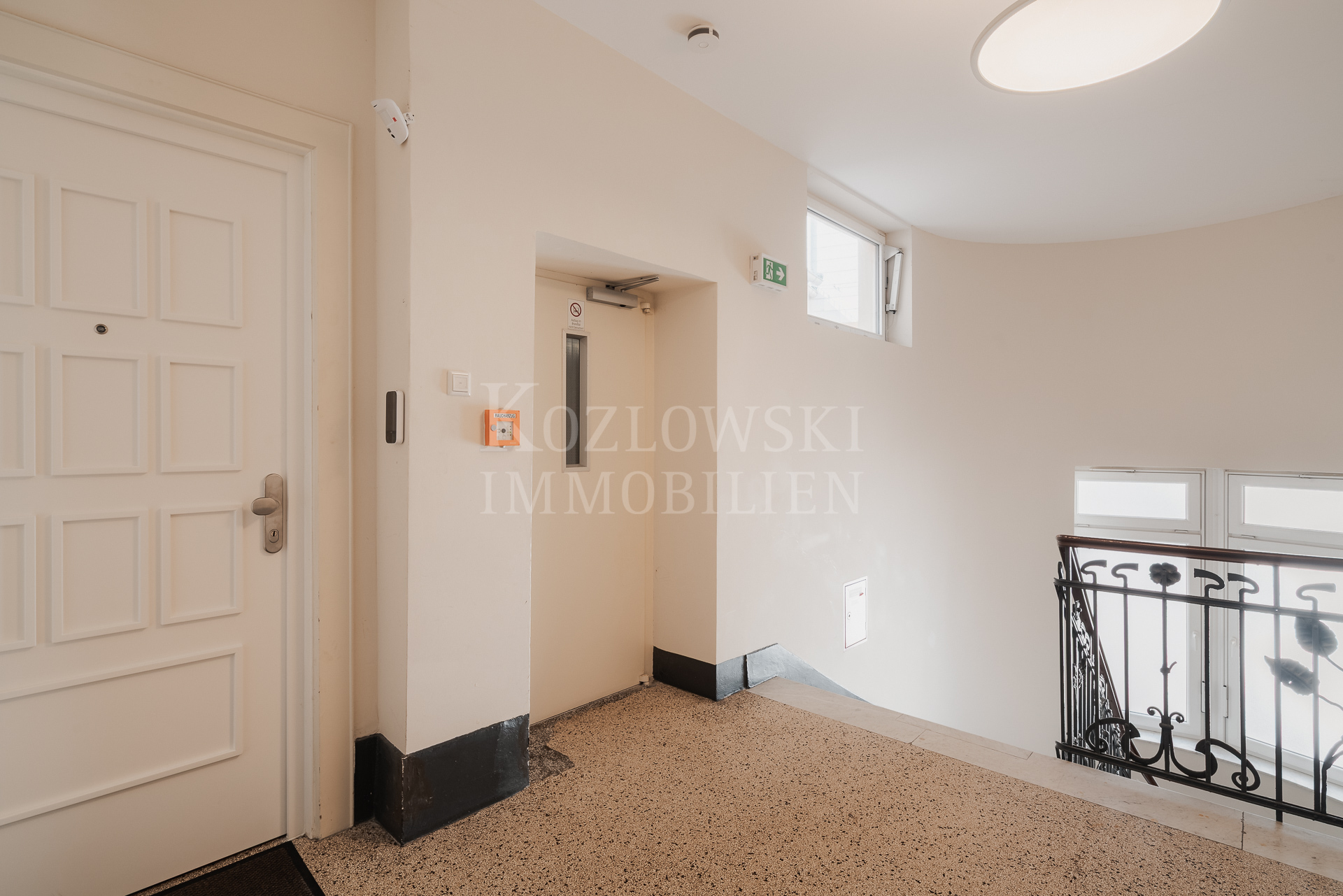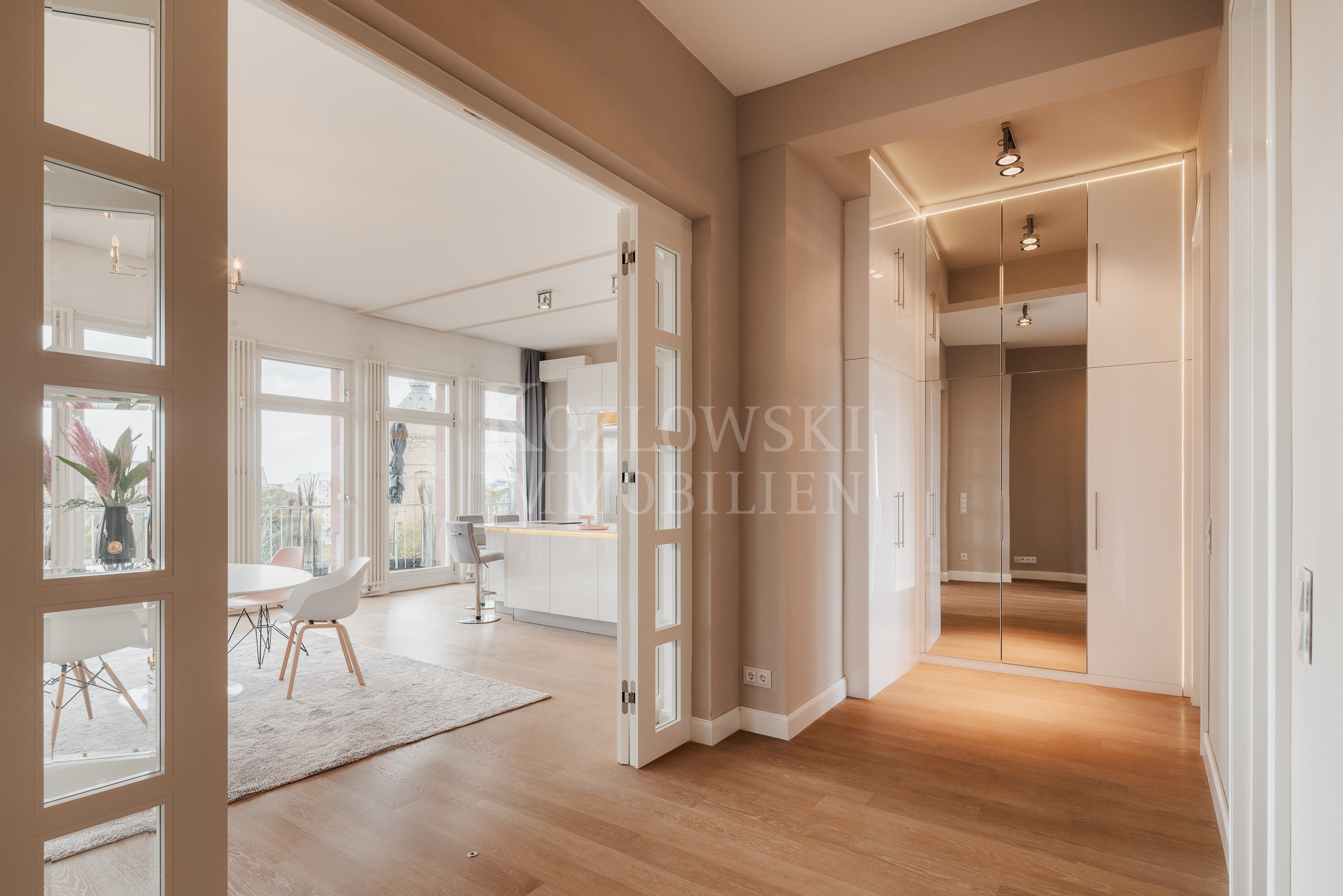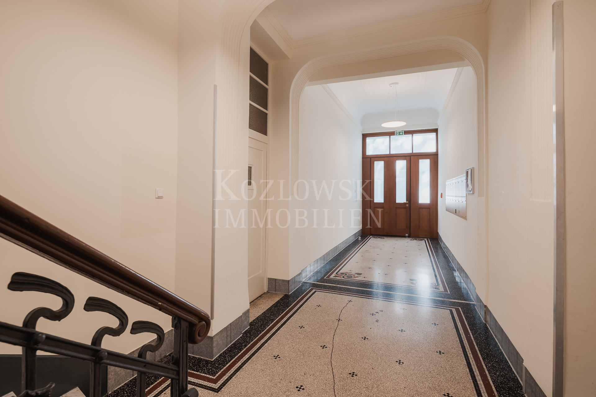 Über das repräsentative Treppenhaus mit edlem Terrazzo gelangen Sie barrierefrei per Aufzug in die Wohnetage im 5. Obergeschoss. Ein absolutes Highlight sind neben den großzügigen Raumdimensionen die unverbaute Südwestausrichtung mit Blick auf die prachtvolle Friedrichsplatz-Parkanlage am Wasserturm sowie auf die Skyline der Stadt.