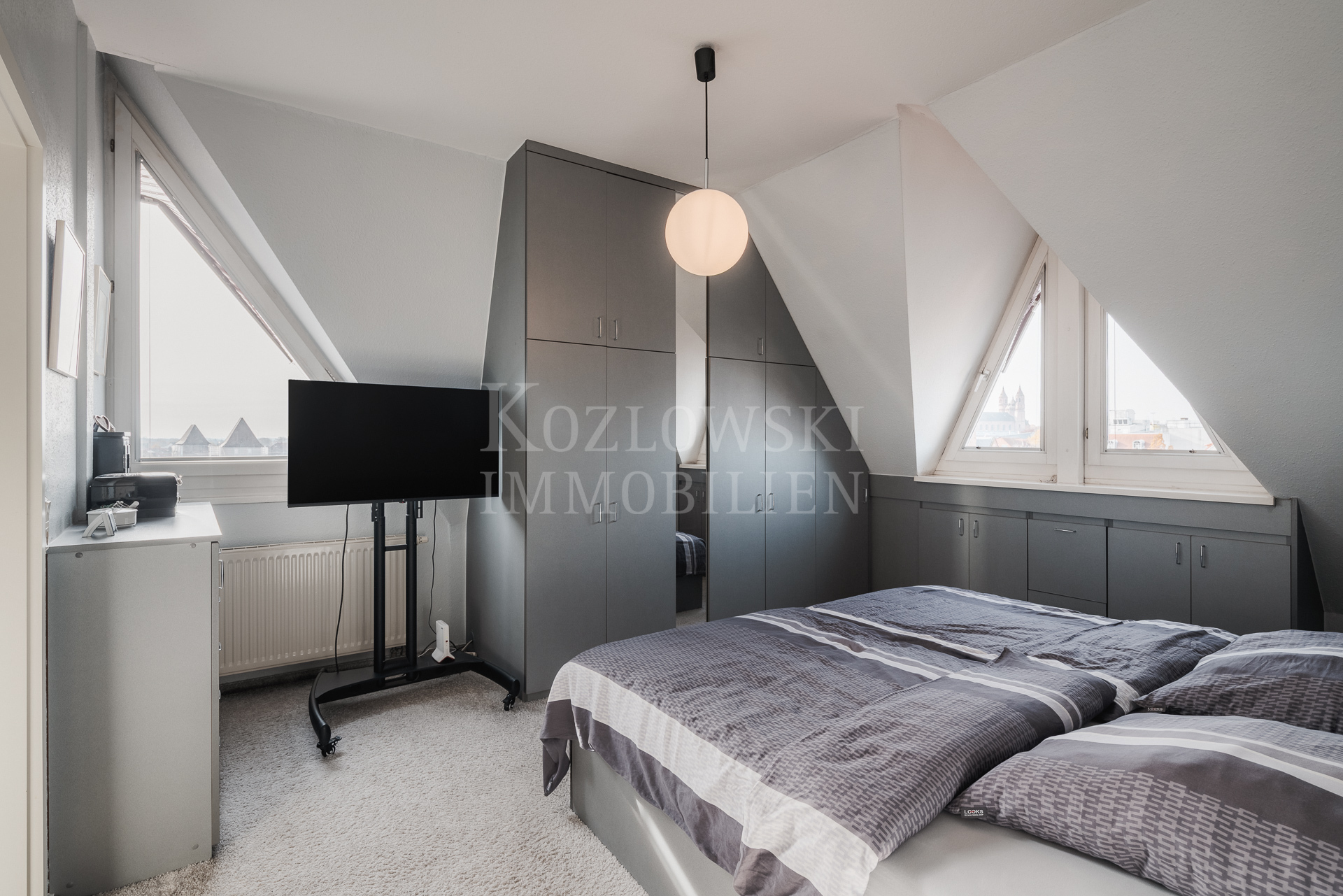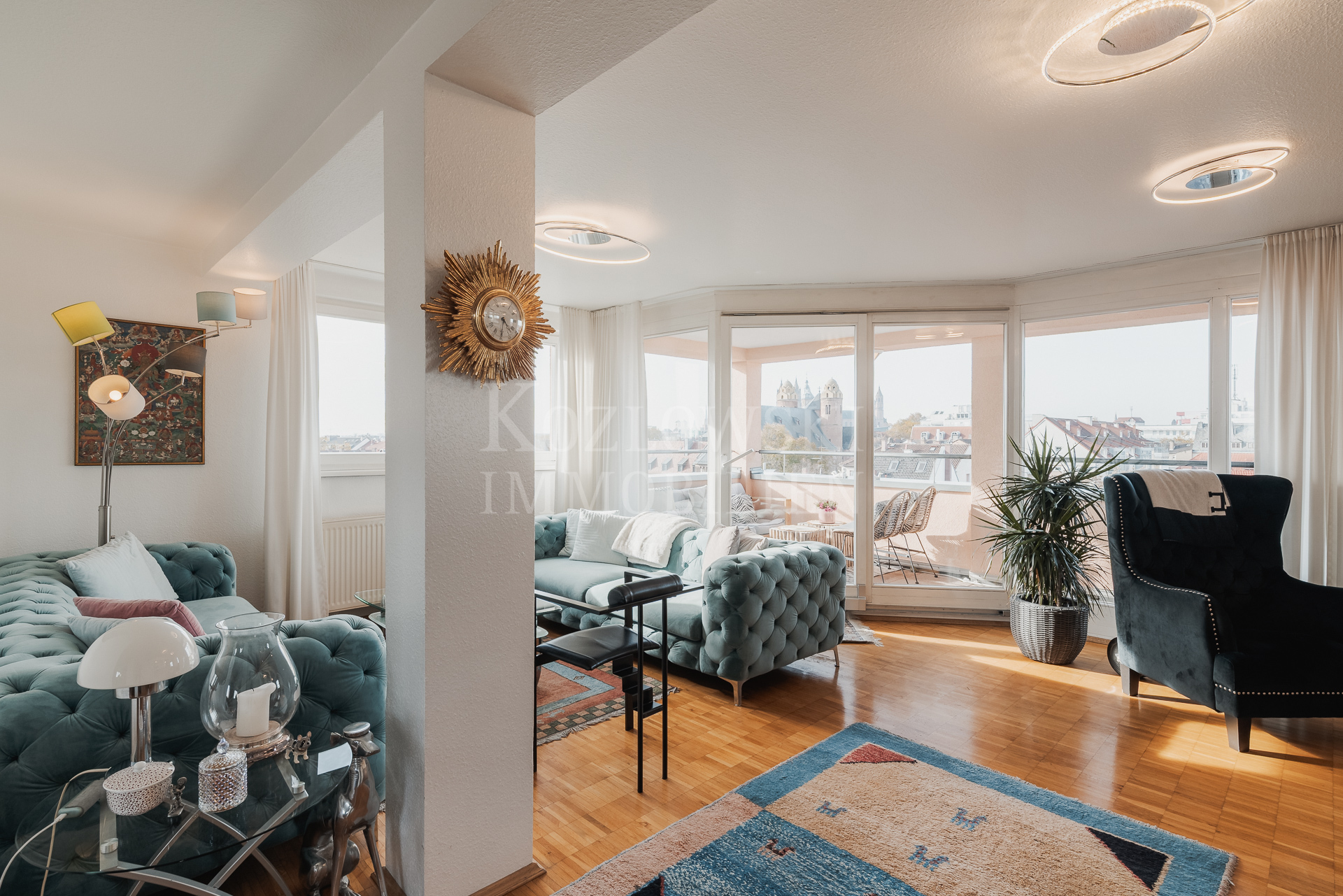 Der Aufzug bringt Sie bequem bis auf die Wohnebene – ein Komfort, den Sie so schnell nicht mehr missen möchten. Auf ca. 125 qm Wohnfläche über zwei Ebenen im 6. OG und DG entfaltet sich ein außergewöhnlich helles Raumgefühl. Die Turmstruktur prägt die Architektur und verleiht den 4,5 Zimmern ihren unverwechselbaren Charakter. Der Wohn- und Loungbereich mit Zugang zur Süd-West-Loggia mit atemberaubender Blick über die Altstadt bis zur Haardt bildet das Zentrum der Maisonette. Gegenüberliegend befindet sich der Essbereich mit angrenzender Küche und Gäste-WC.
