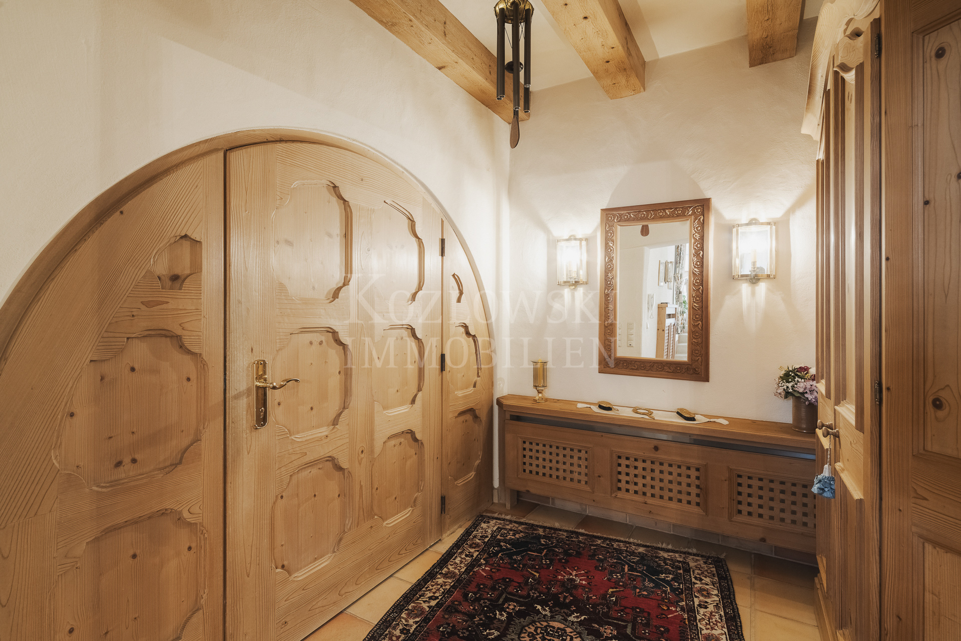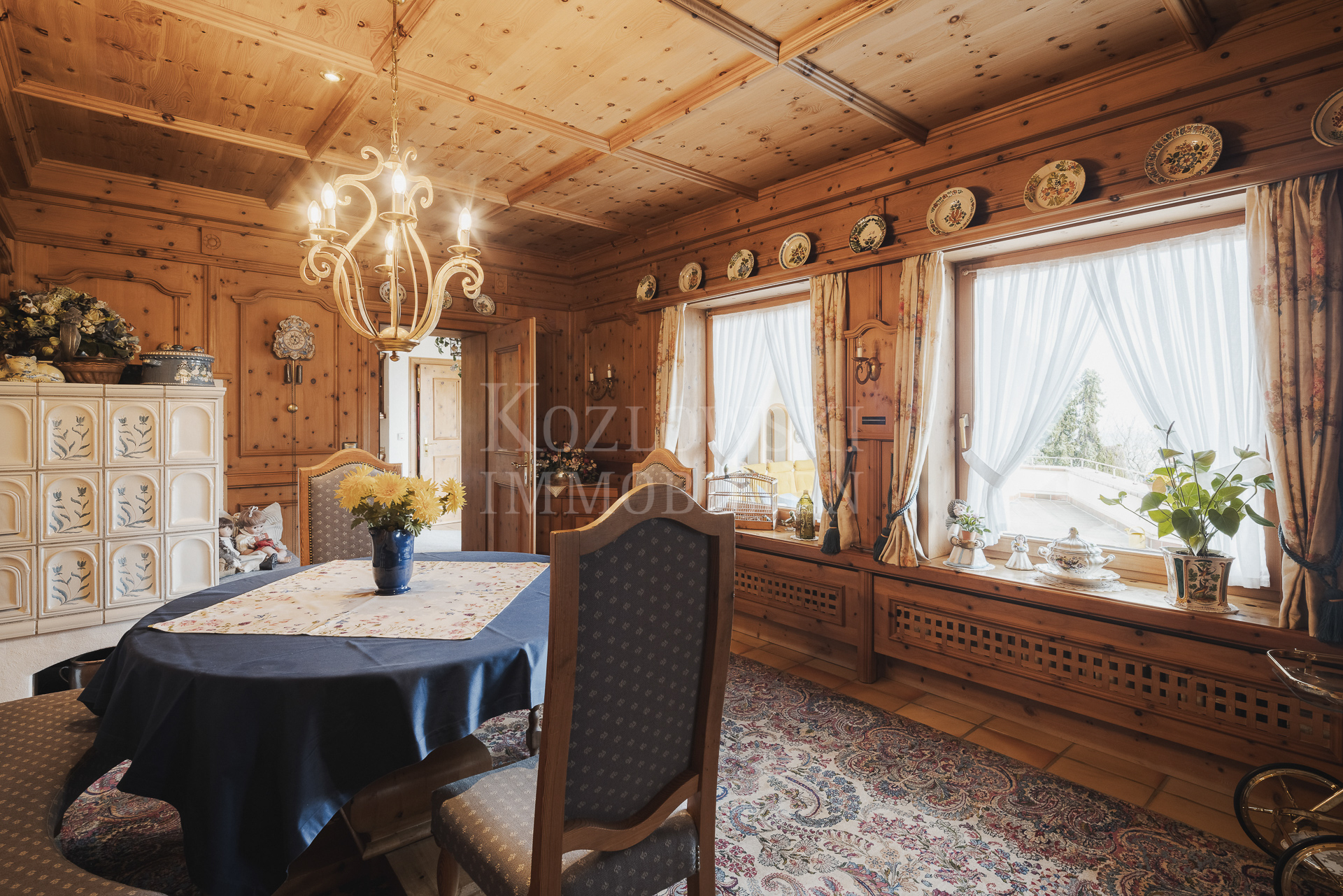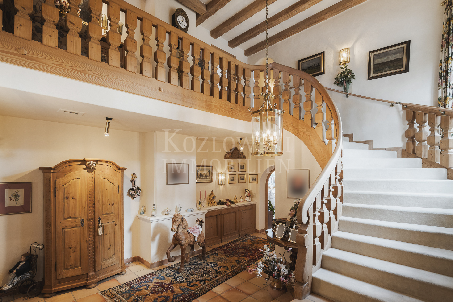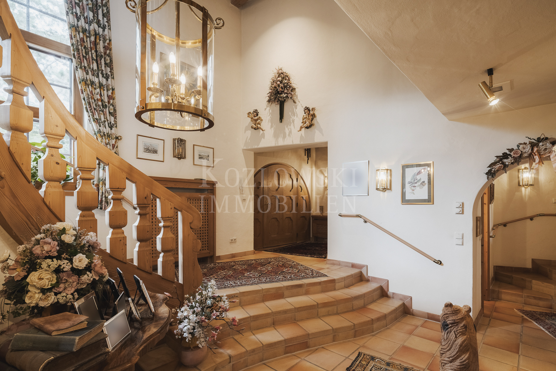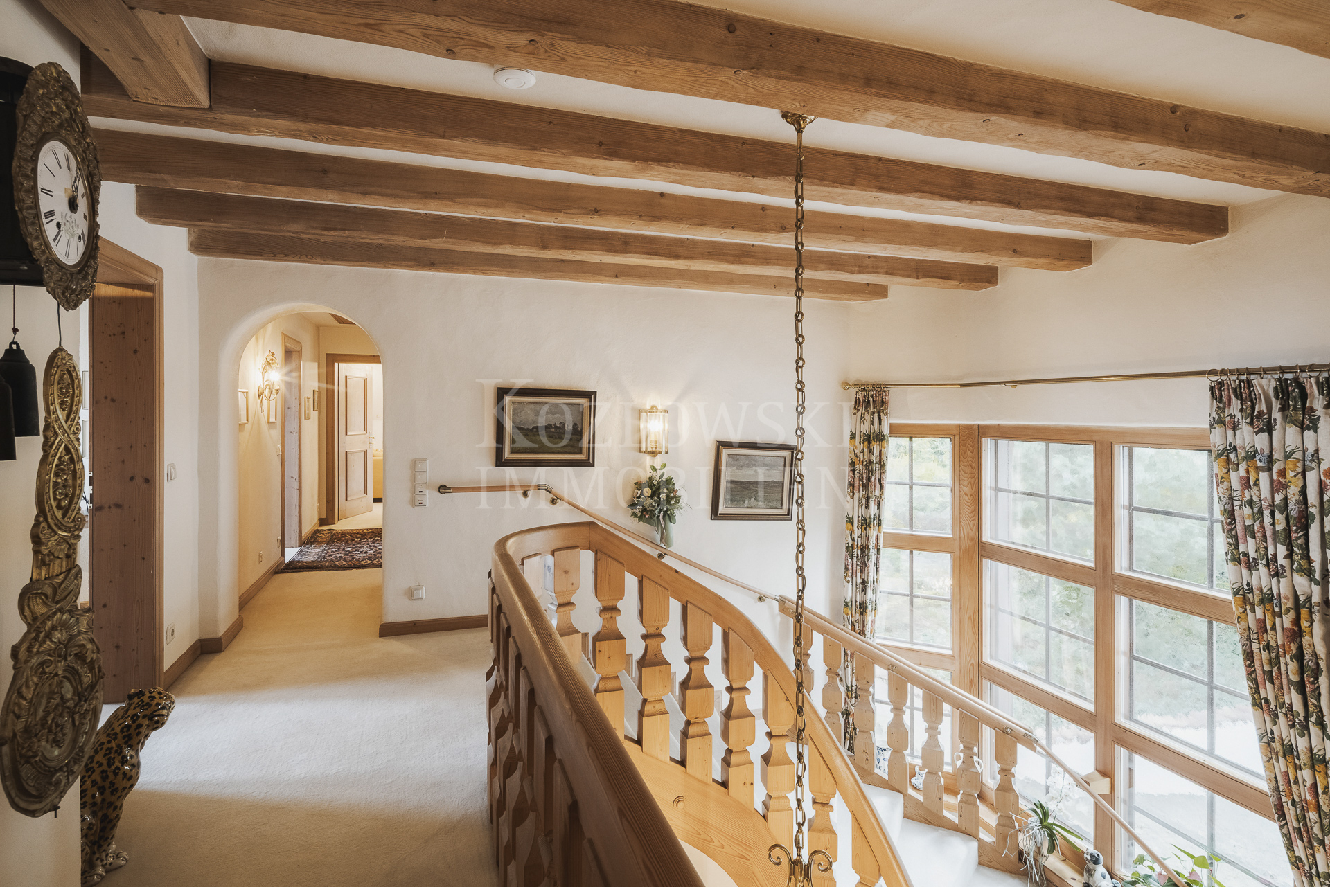 Das Herz der Panoramavilla bildet die „gute Stube“. Ein traditioneller Kachelofen sorgt in den kühleren Monaten für behagliche Wärme, während große Fensterflächen den Blick ins Grüne öffnen. Edle Naturmaterialien, massive Holztüren und ein repräsentatives Entrée mit geschwungener Galerie-Treppe prägen die besondere Atmosphäre des Hauses.