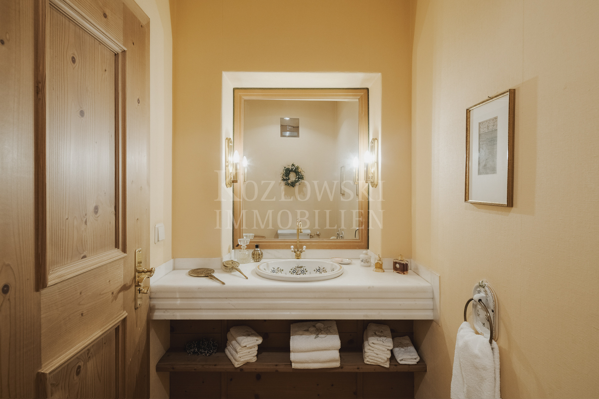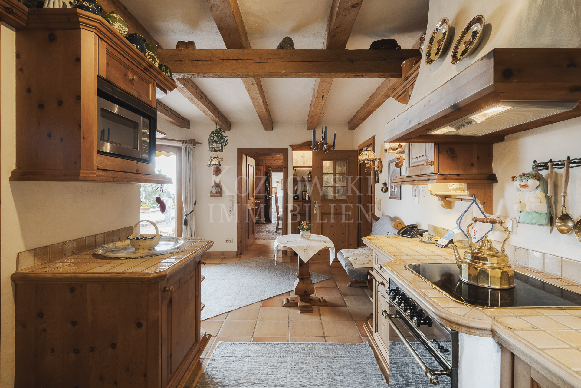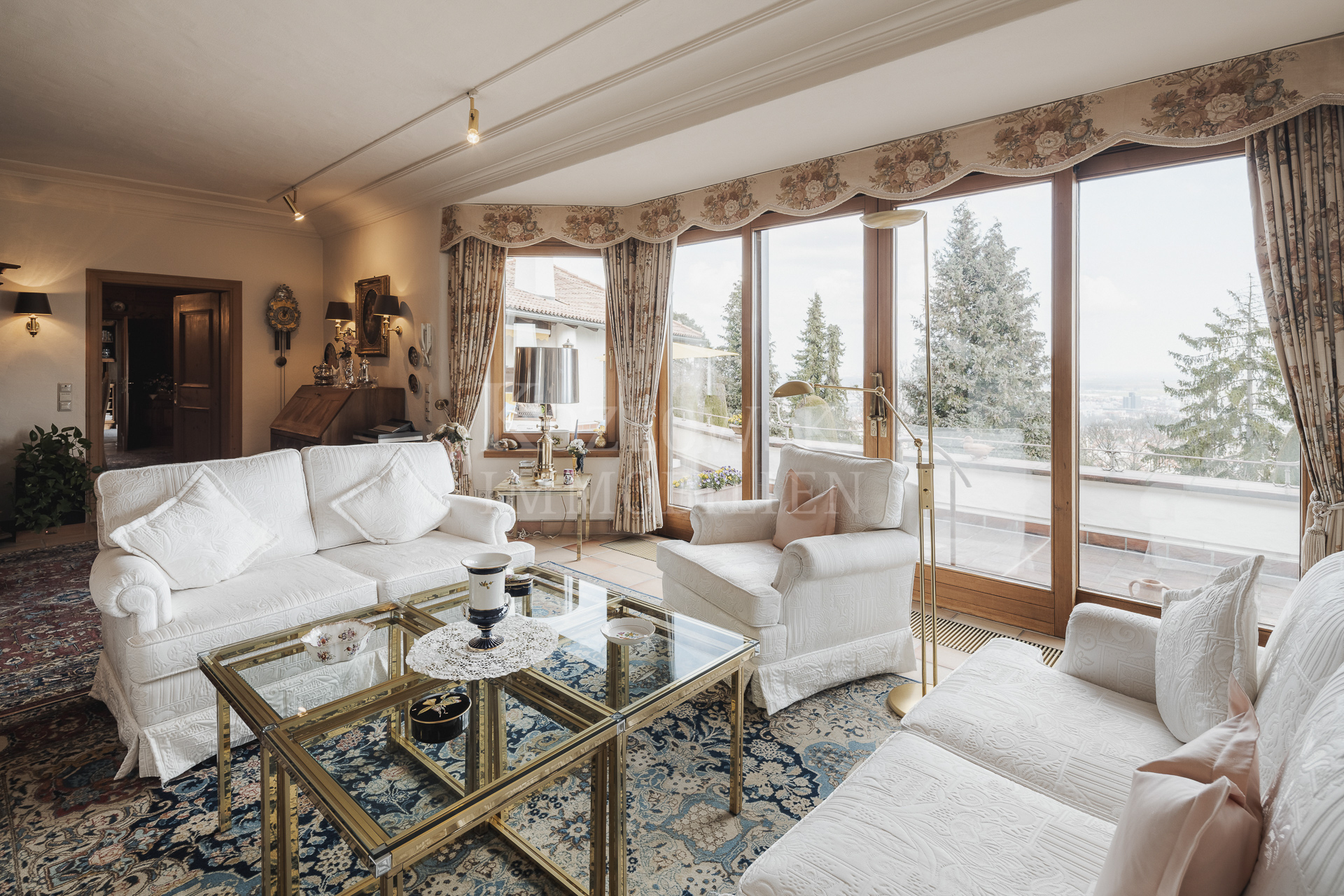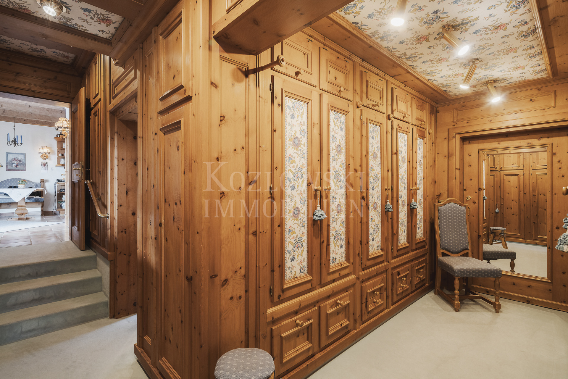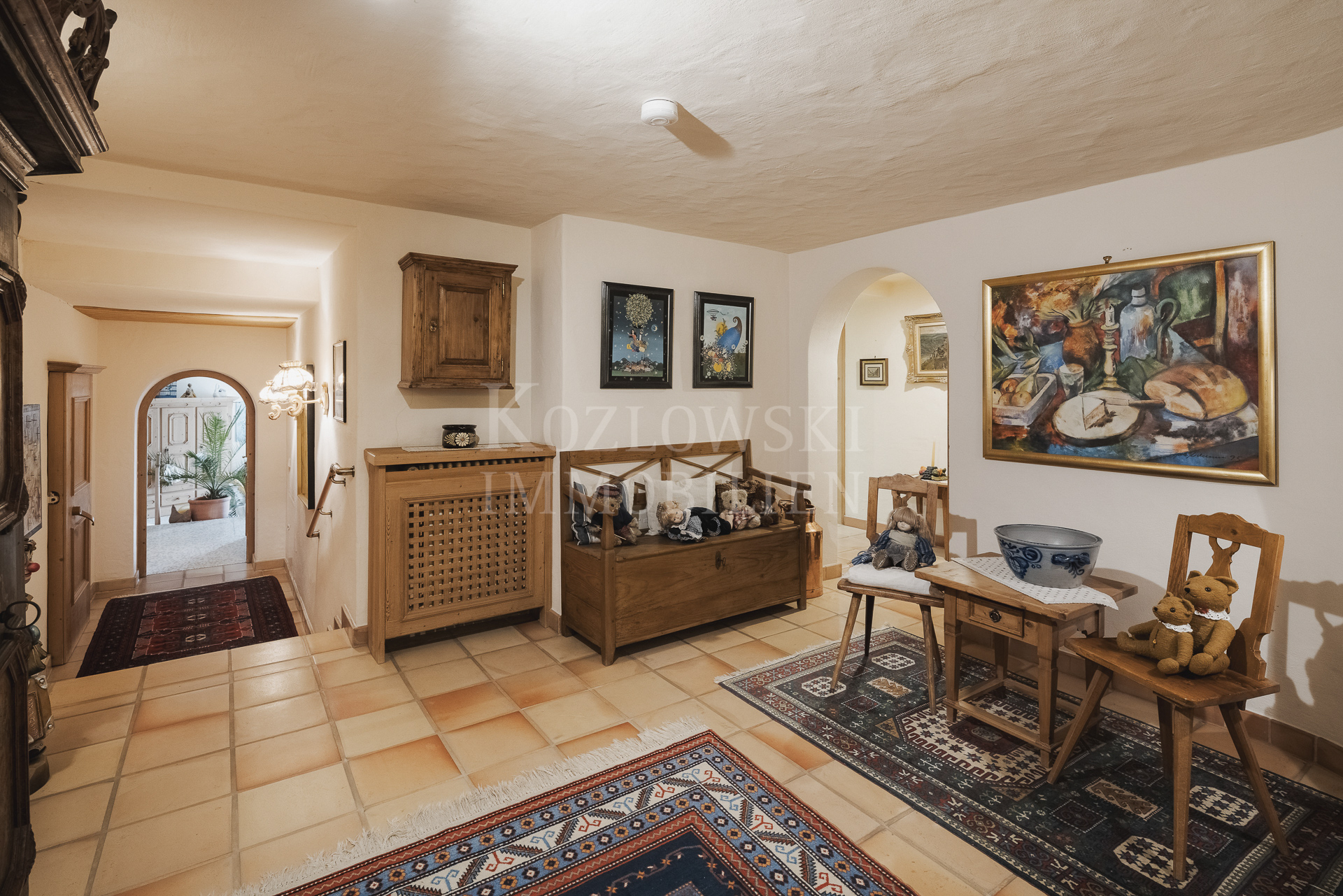 Das Herz der Panoramavilla bildet die „gute Stube“. Ein traditioneller Kachelofen sorgt in den kühleren Monaten für behagliche Wärme, während große Fensterflächen den Blick ins Grüne öffnen. Edle Naturmaterialien, massive Holztüren und ein repräsentatives Entrée mit geschwungener Galerie-Treppe prägen die besondere Atmosphäre des Hauses.