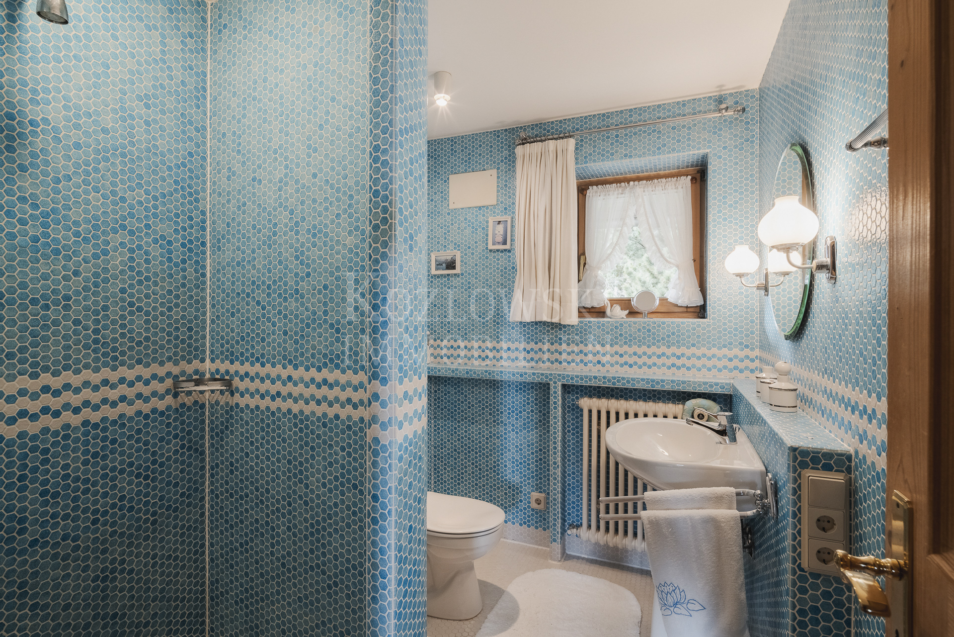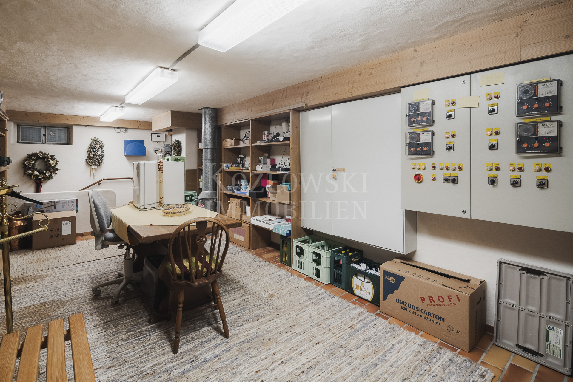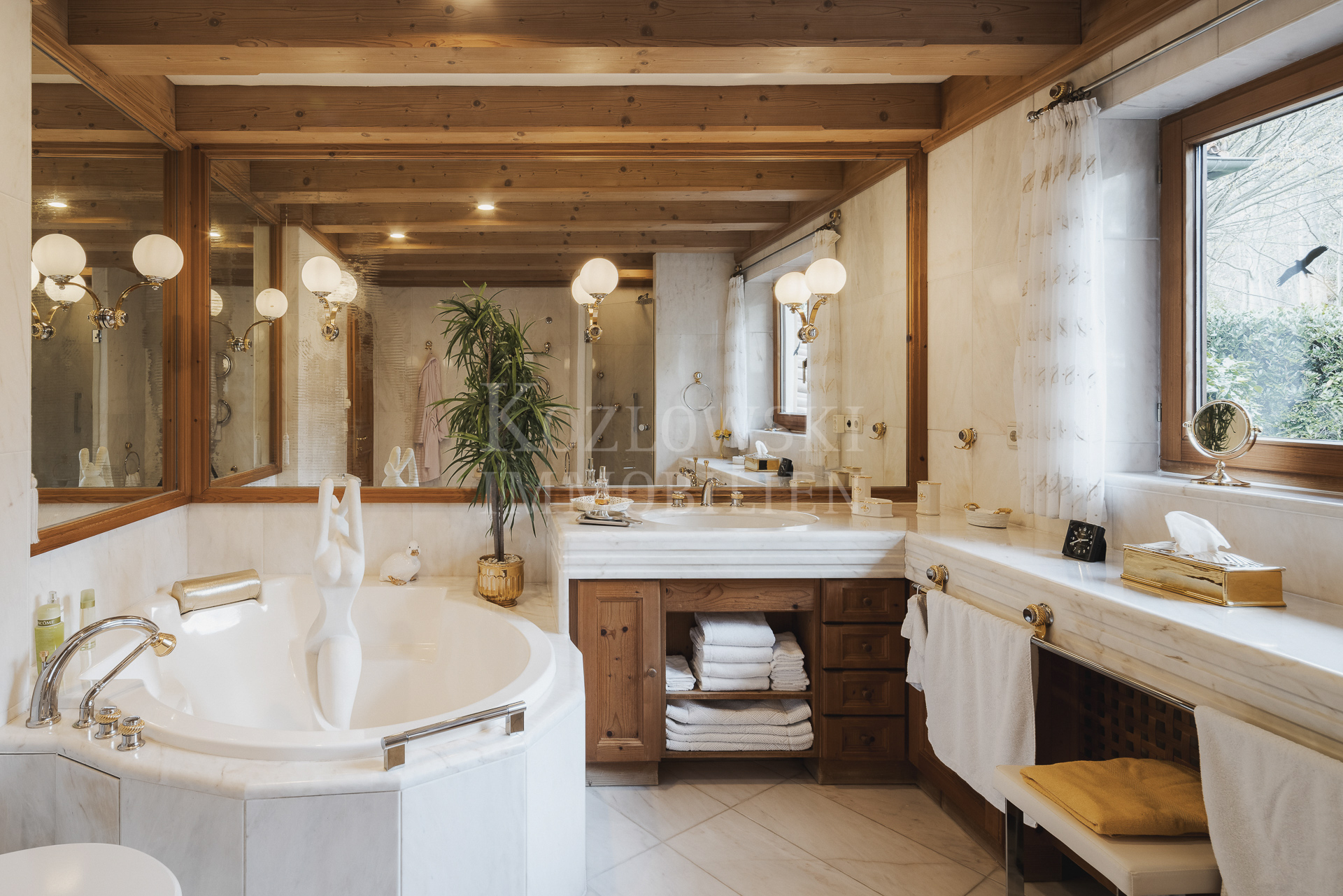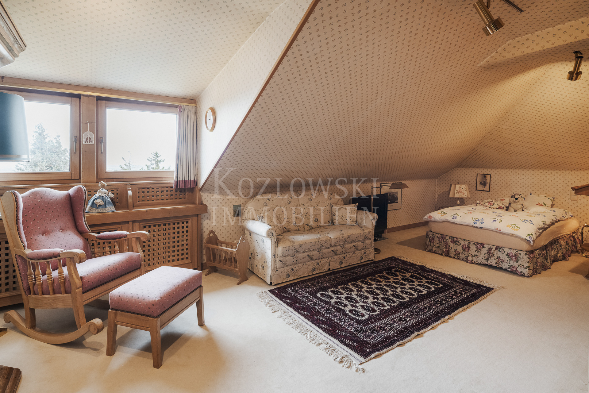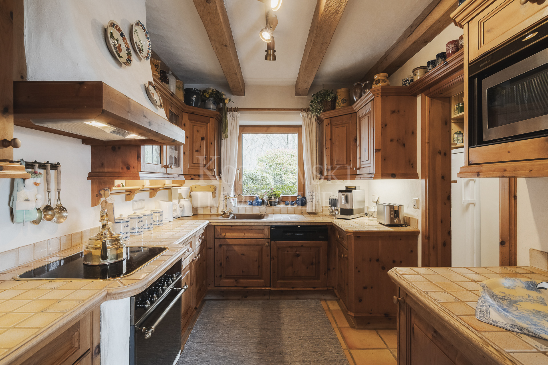 Das Herz der Panoramavilla bildet die „gute Stube“. Ein traditioneller Kachelofen sorgt in den kühleren Monaten für behagliche Wärme, während große Fensterflächen den Blick ins Grüne öffnen. Edle Naturmaterialien, massive Holztüren und ein repräsentatives Entrée mit geschwungener Galerie-Treppe prägen die besondere Atmosphäre des Hauses.