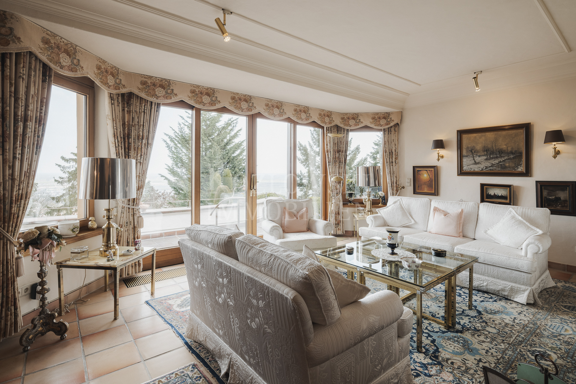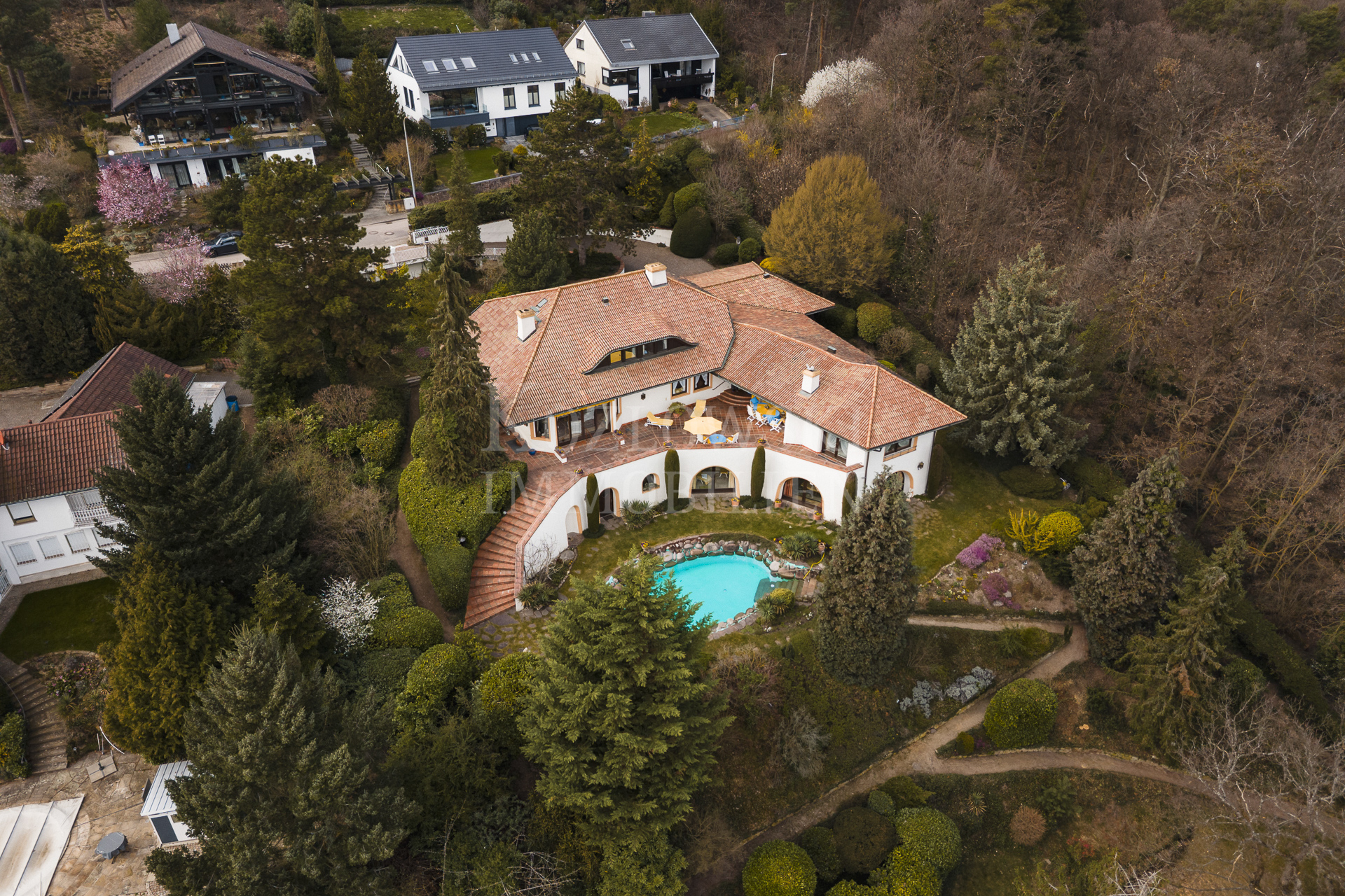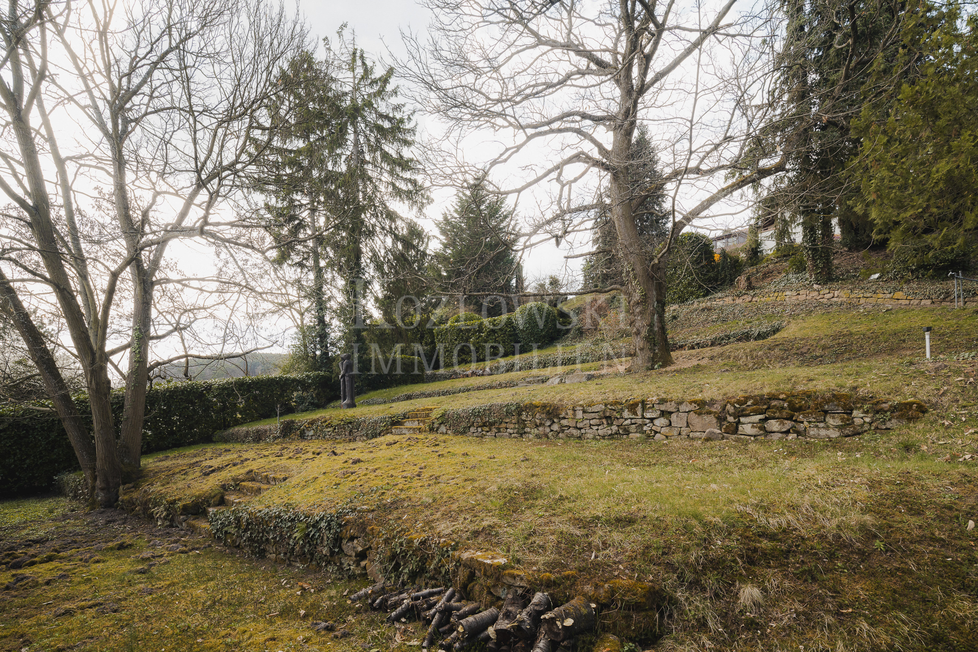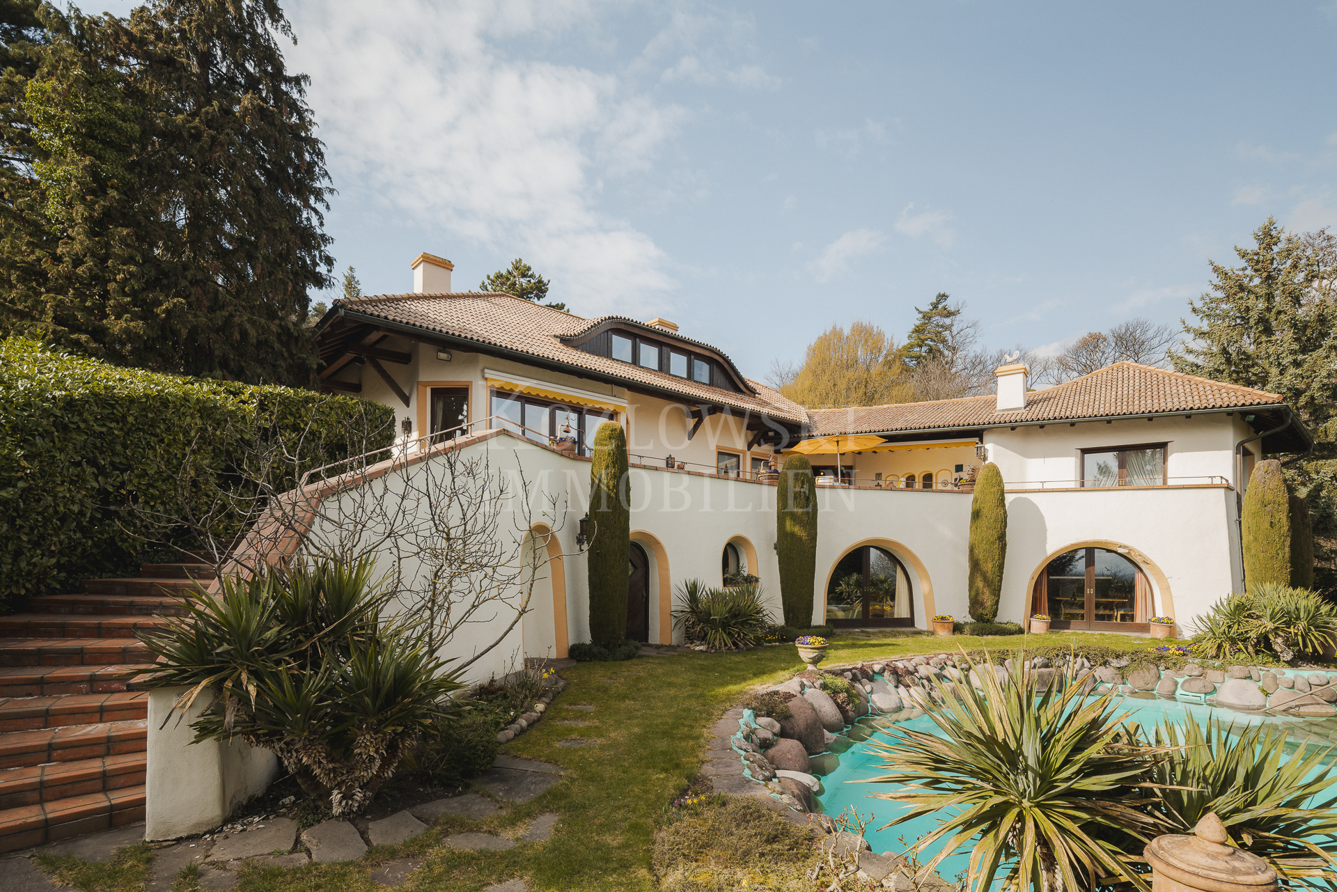 Die parkähnliche Gartenanlage mit Pool erinnert an mediterrane Villen und verbindet üppige Bepflanzung, Naturstein und blühende Gartenbereiche mit dem traumhaften Panorama. Für zusätzliche Entspannung sorgt ein privater Wellnessbereich mit Sauna, Whirlpool und Tauchbecken.