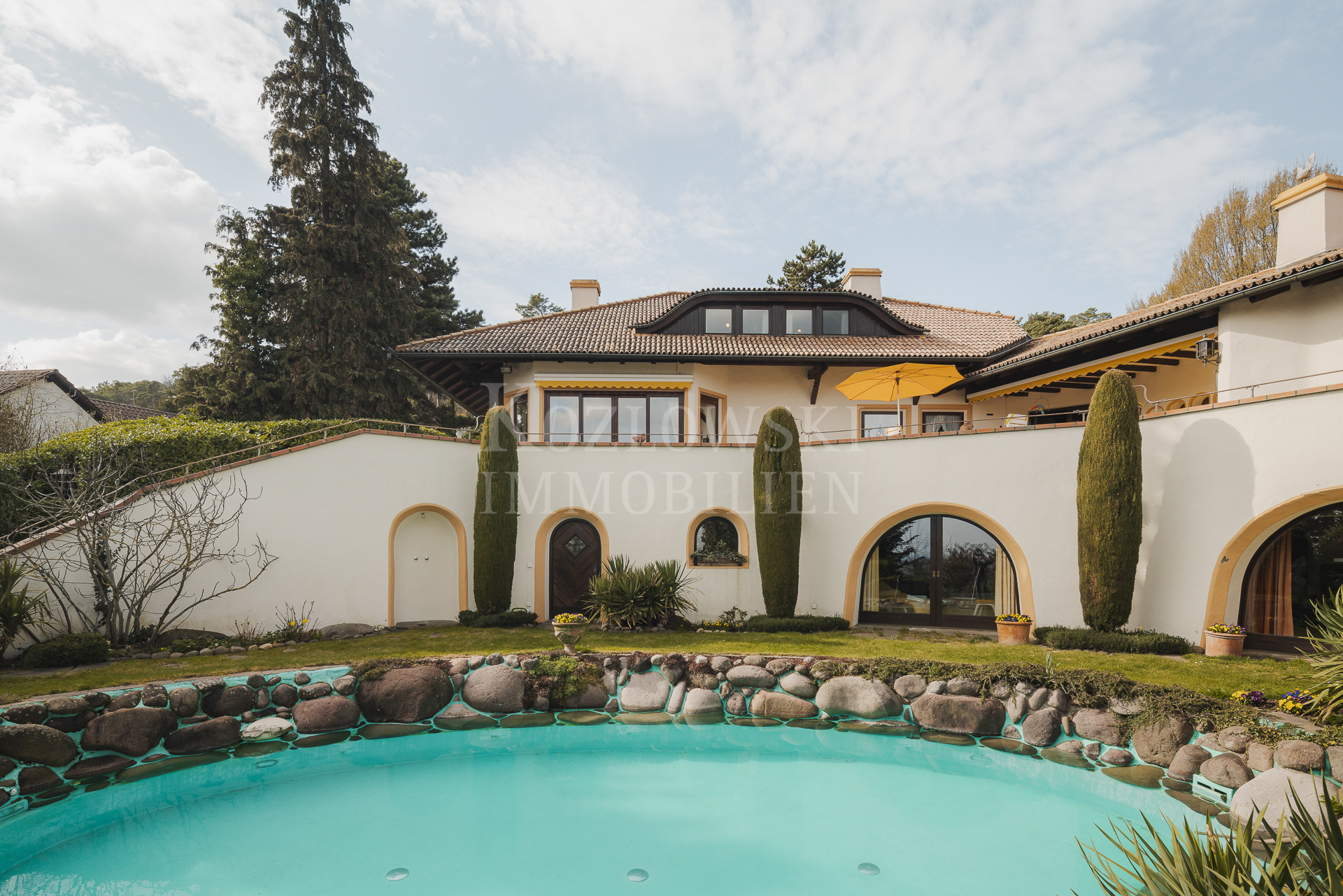 Auf einem beeindruckenden Grundstück von ca. 3.881 qm mit altem Baumbestand genießen Sie ein Höchstmaß an Privatsphäre und Exklusivität. Die außergewöhnliche Architektur trägt die unverkennbare Handschrift des Architekten Wolfgang Siedenburg und verbindet Baukultur, natürliche Materialien und ein besonderes Lebensgefühl. Alpine Wohnkultur trifft hier auf mediterrane Leichtigkeit. Großzügige Dachformen und sorgfältig ausgearbeitete Details verleihen der Villa eine warme und zugleich repräsentative Ausstrahlung.