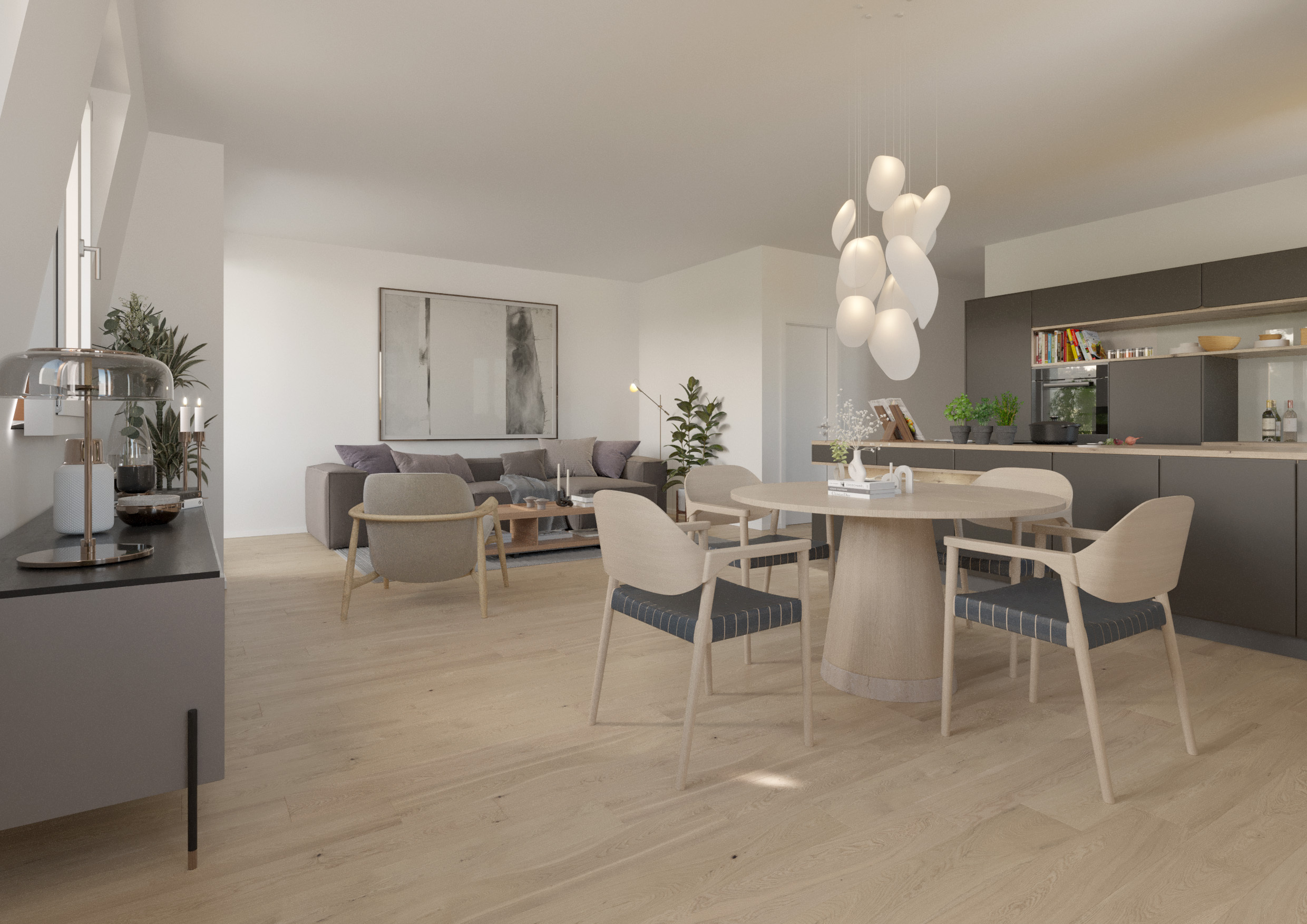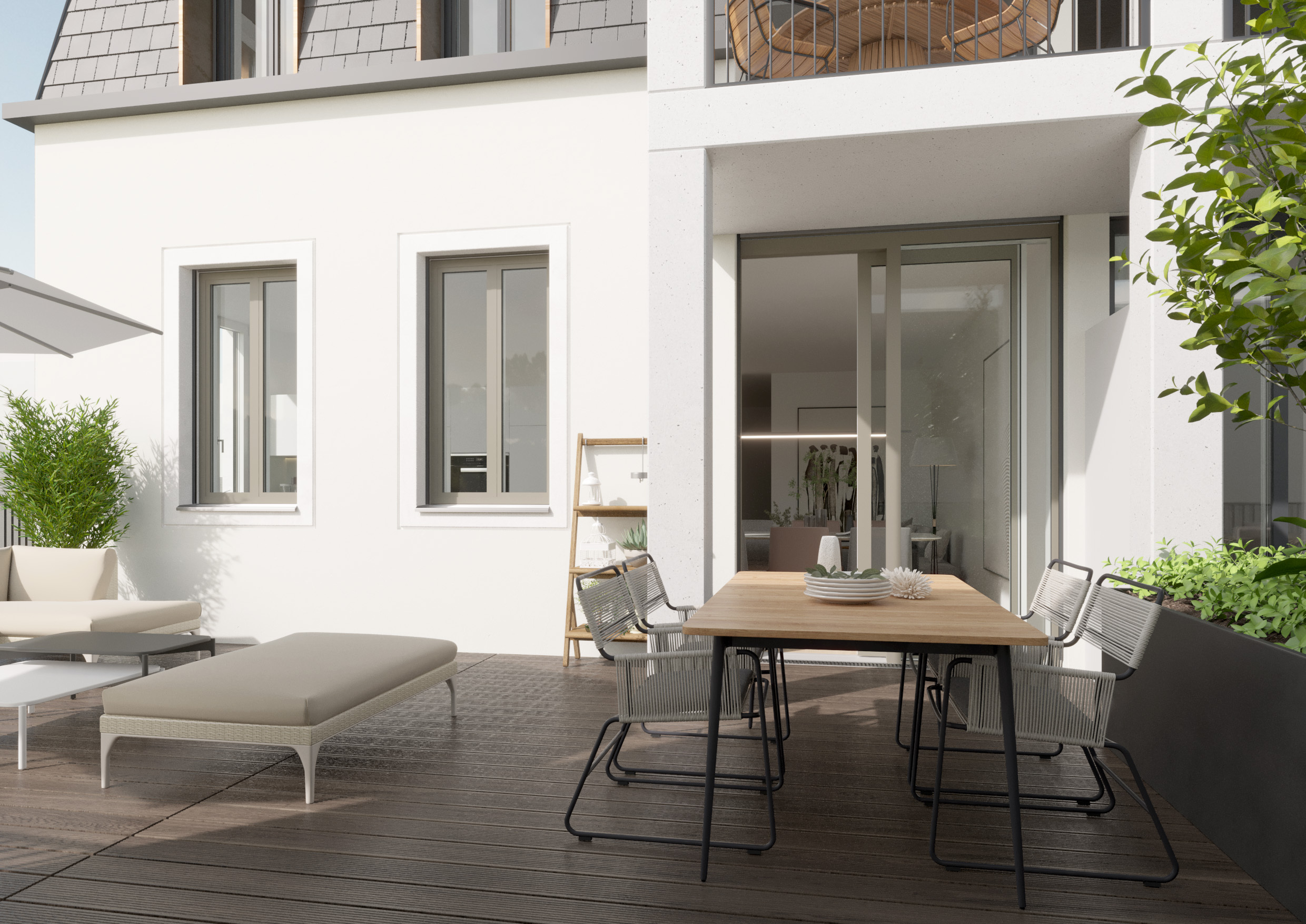 Im Erdgeschoß des Mehrfamilienhauses erwartet Sie eine Garage mit 9 ebenerdigen Stellplätzen, Fahrradabstellmöglichkeiten sowie eine kleine Gewerbeeinheit mit 127qm Gewerbefläche über 2 Ebenen (EG und KG). Über das Treppenhaus oder schwellenfrei mit dem Aufzug erreichen Sie das 1. Obergeschoß, das Dachgeschoß und die Penthousewohnung. Die drei Wohnungen im 1. OG mit 2-3 Zimmern und Wohnflächen von ca. 79,40qm bis zu ca. 89,08qm verfügen alle über Tageslichtbäder und große sonnige Terrassen.